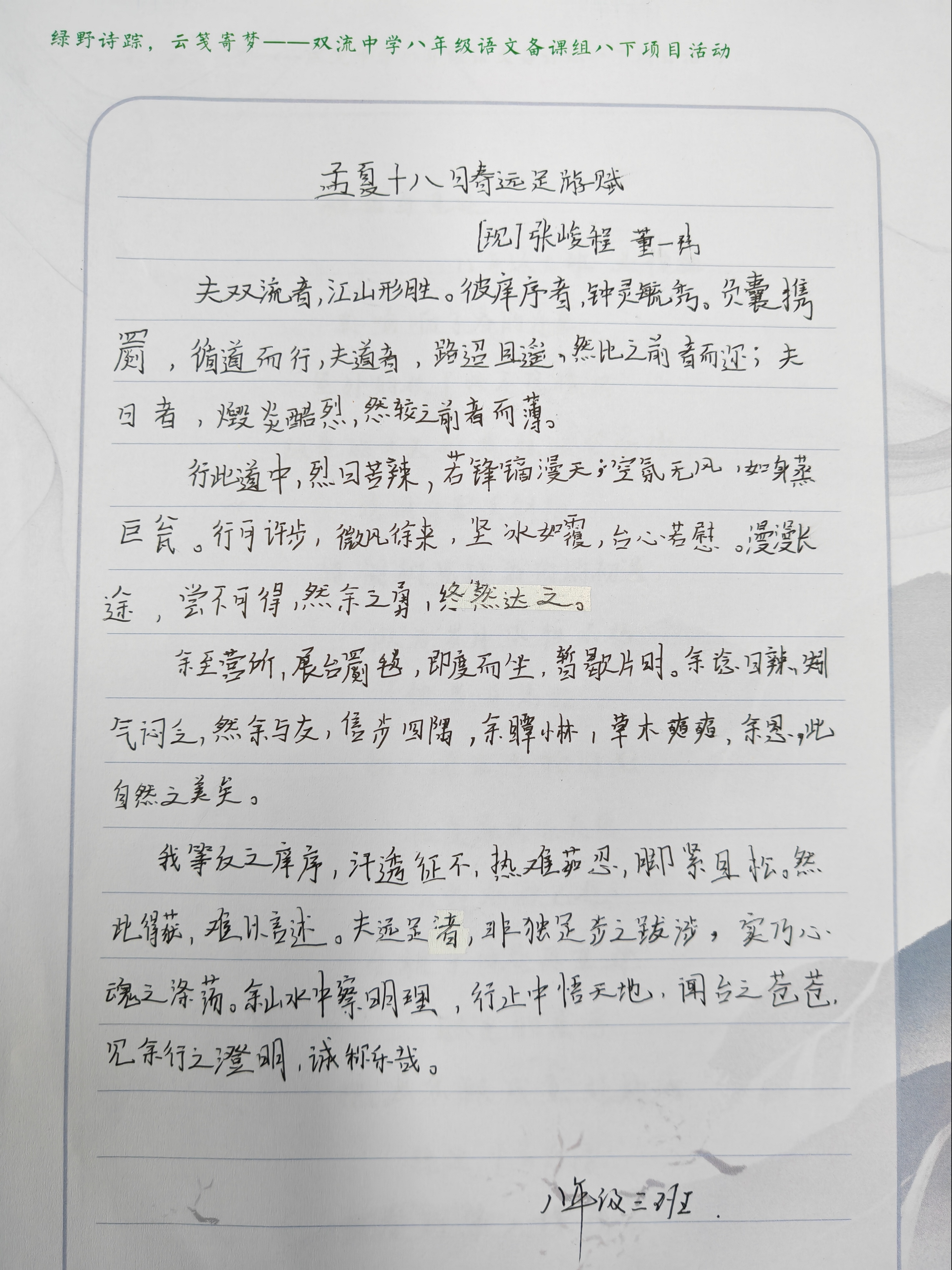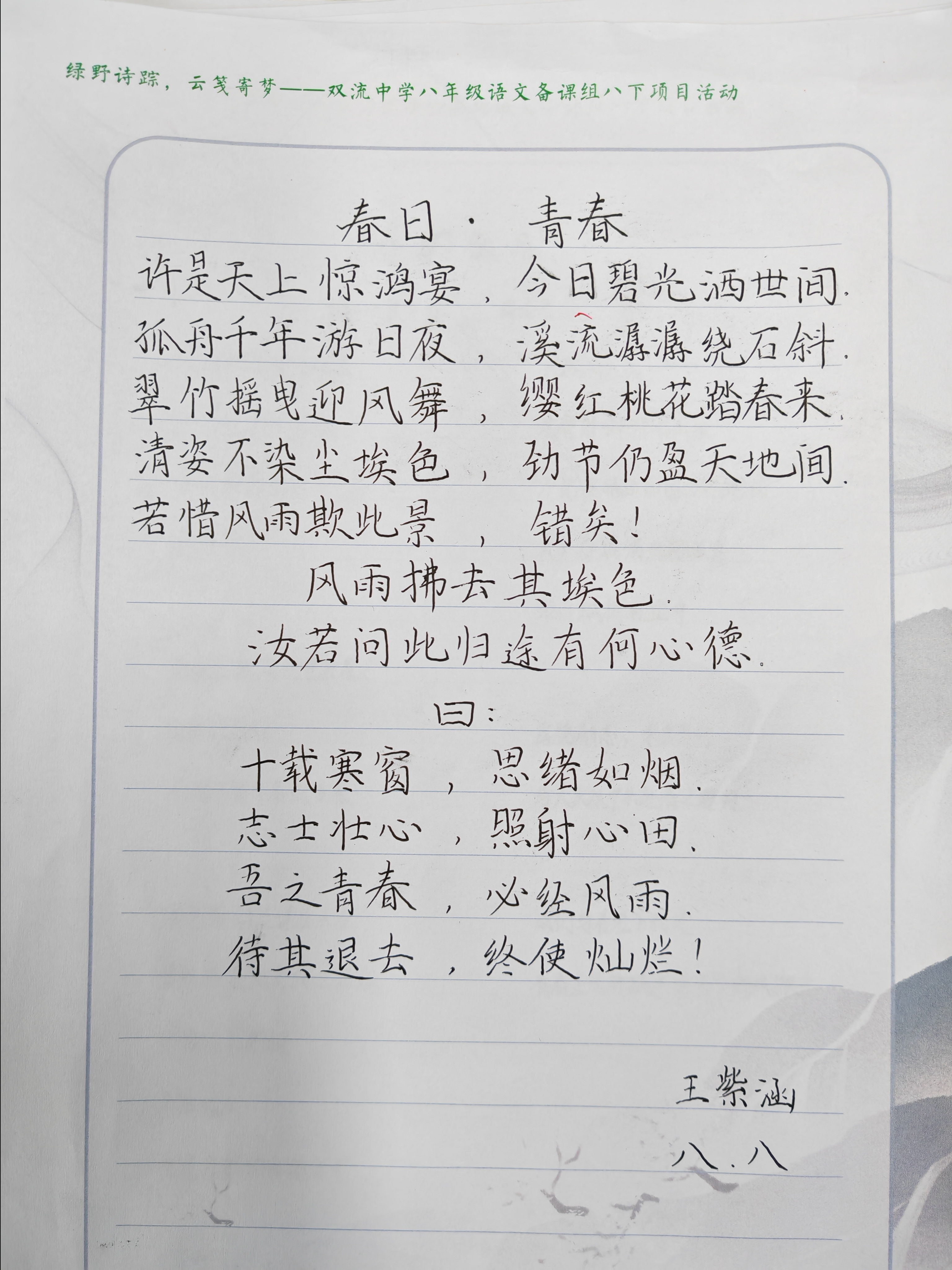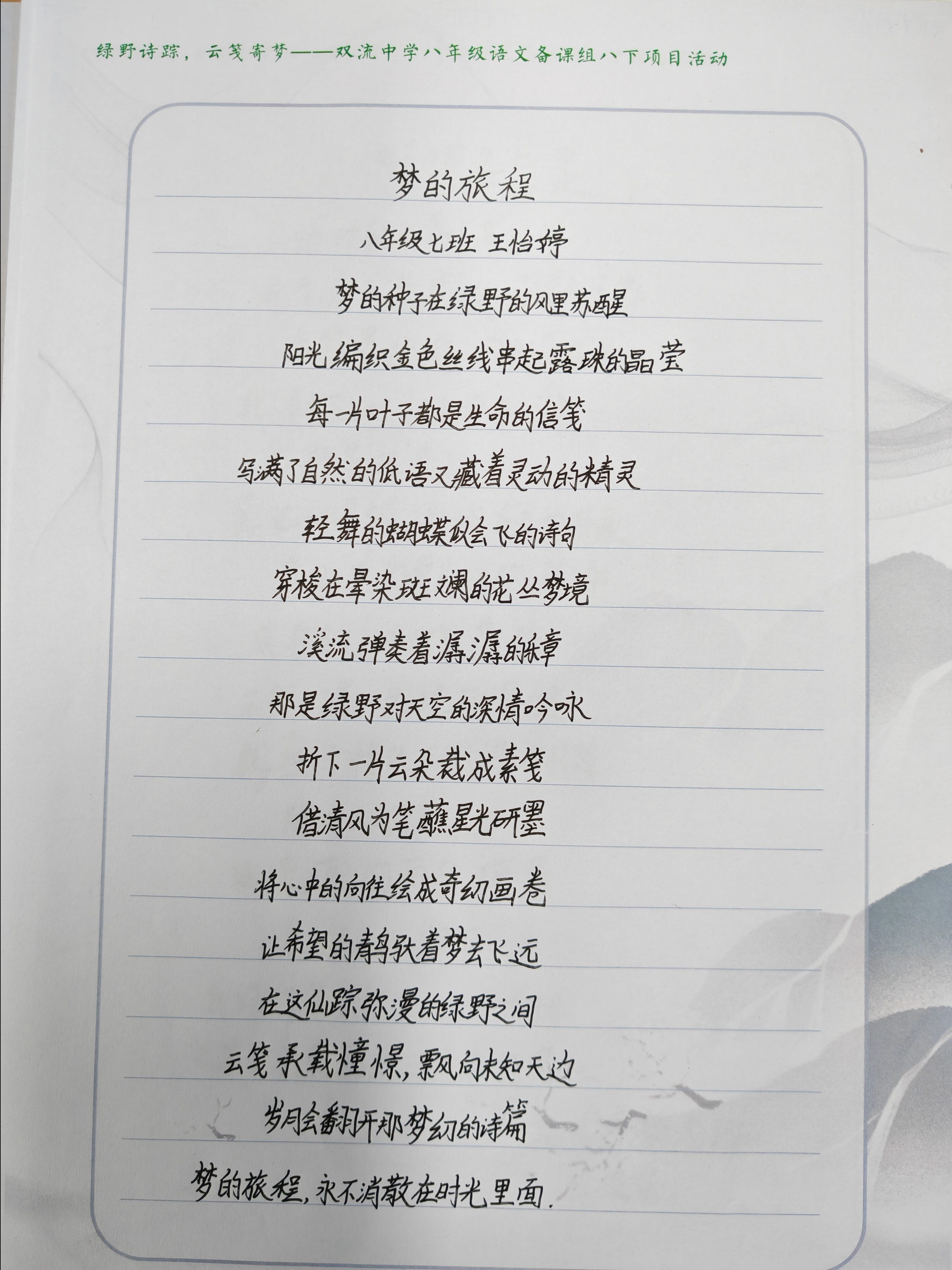 春風(fēng)輕拂,楊柳依依,雙流中學(xué)八年級(jí)學(xué)生迎來(lái)了一年一度的春游活動(dòng)。在盡情享受自然美好與歡樂(lè)時(shí)光后,八年級(jí)語(yǔ)文備課組組織了一場(chǎng)以“綠野詩(shī)蹤,云箋寄夢(mèng)”為主題的小詩(shī)創(chuàng)作活動(dòng)。