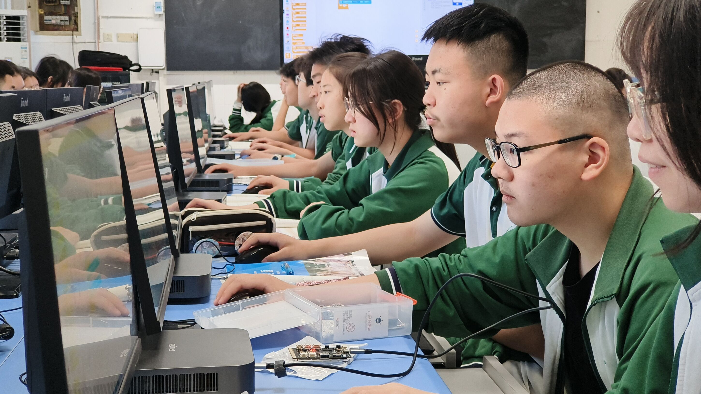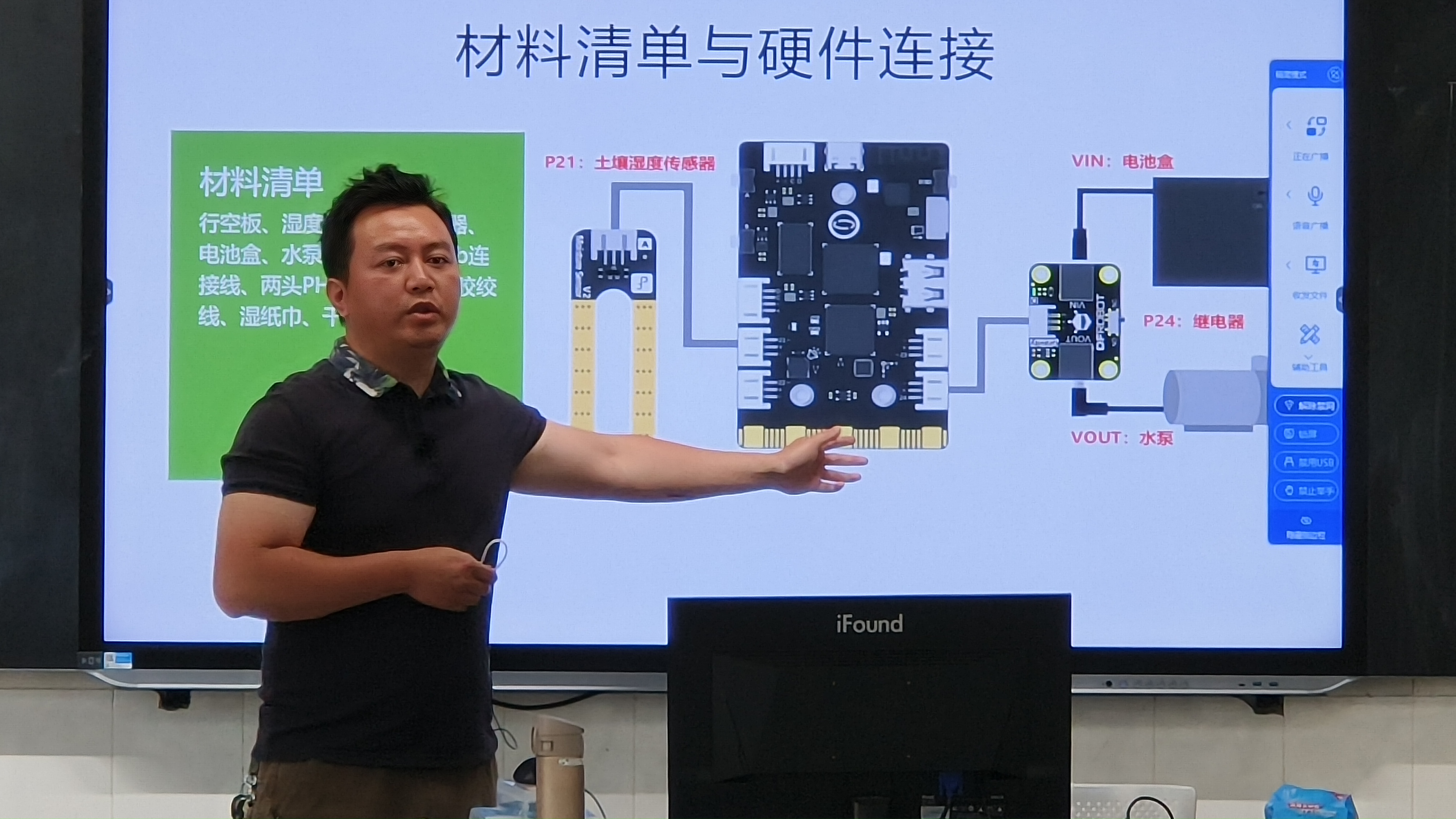 培訓(xùn)伊始,陳卓老師帶來了課例《基于行空板的自動(dòng)澆灌系統(tǒng)實(shí)現(xiàn)》。課程以"解決家庭植物養(yǎng)護(hù)難題"為真實(shí)情境,引導(dǎo)學(xué)生通過行空板編程、傳感器應(yīng)用等實(shí)踐操作,完成閉環(huán)控制系統(tǒng)的設(shè)計(jì)與實(shí)現(xiàn)。它將抽象的控制系統(tǒng)原理轉(zhuǎn)化為看得見、摸得著的實(shí)踐項(xiàng)目。在課堂中,學(xué)生們分組協(xié)作,從硬件連接到程序調(diào)試,親歷了從問題定義到方案實(shí)現(xiàn)的完整過程。特別是通過濕度傳感器的數(shù)據(jù)反饋,學(xué)生們直觀理解了閉環(huán)控制系統(tǒng)的工作機(jī)制。