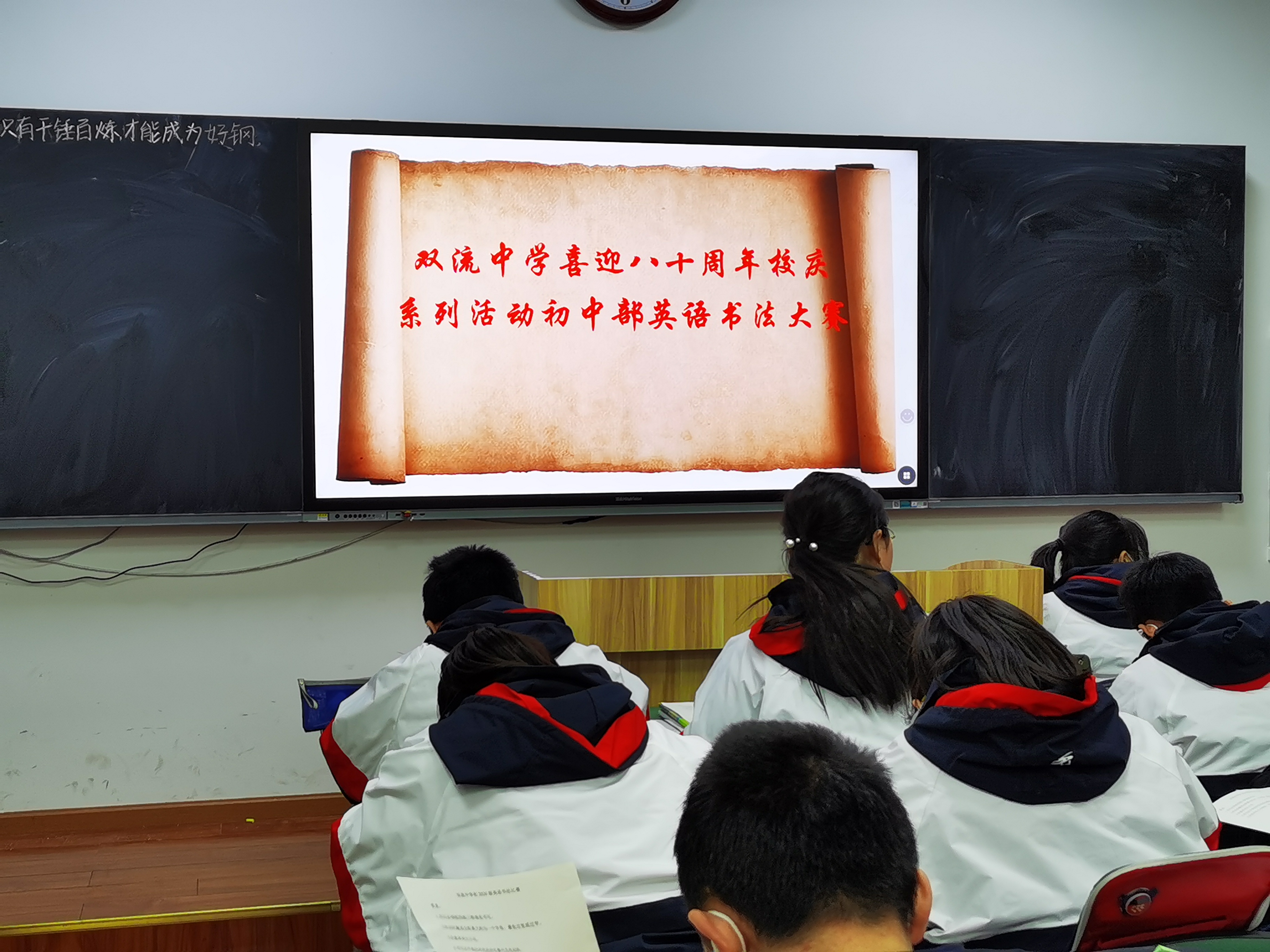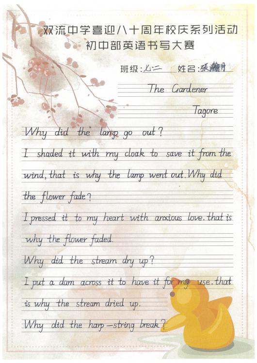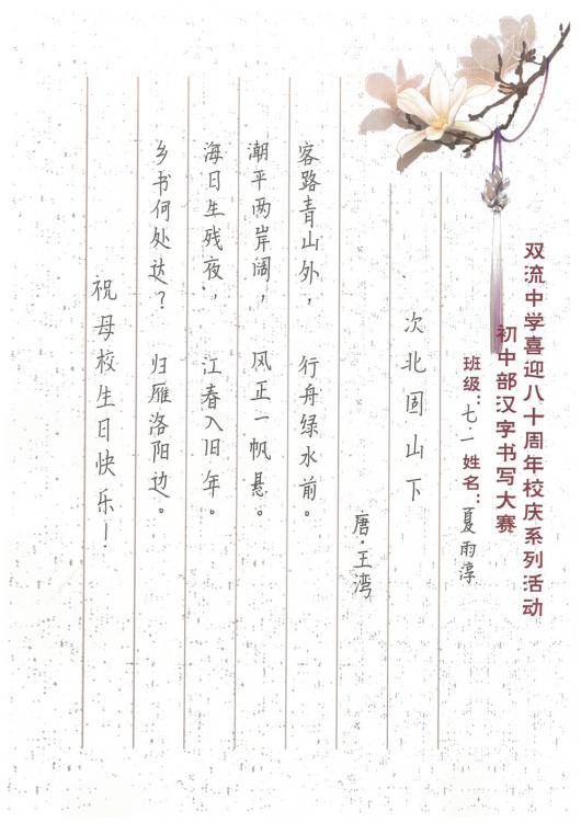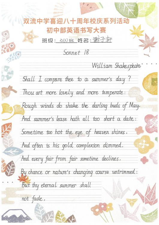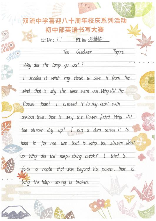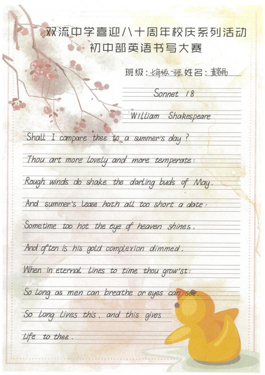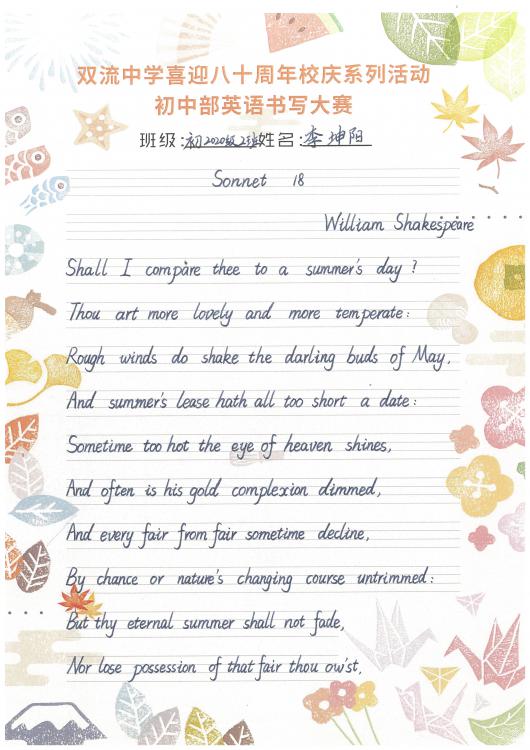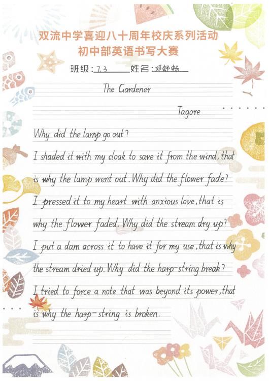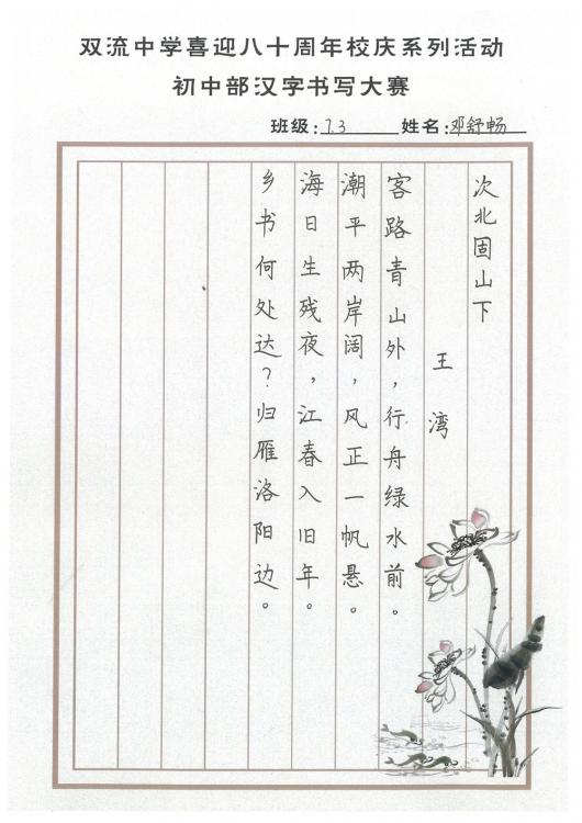 開學(xué)之初,雙流中學(xué)初中部的師生們一起,重書法練習(xí),自習(xí)課上,從間架結(jié)構(gòu)開始,放穩(wěn)心態(tài),沉靜內(nèi)心,以手中之筆,繪心中之景。一步,一步,從浮躁到平和,從挑剔到欣喜。橫,如山沉穩(wěn);豎,如峰勁拔。如今,終于小有所成,趕在80周年校慶校慶之前,雙流中學(xué)初中部舉辦了書寫大賽,同學(xué)們漢字和英語書寫美好詩篇,為母校送上了最誠摯的祝福。下面且看初中部學(xué)子一展身手: