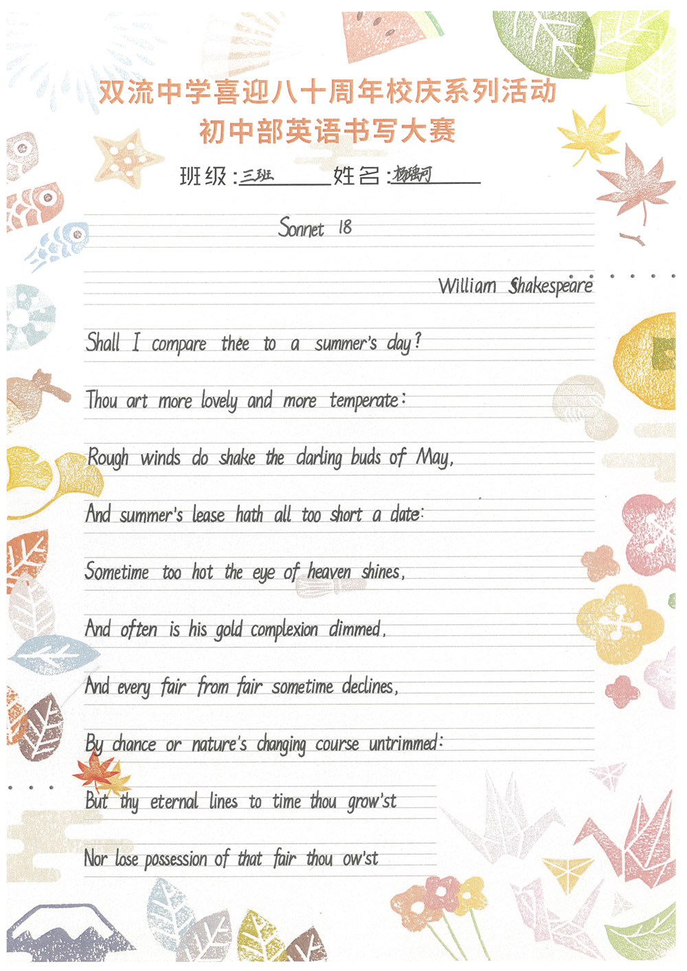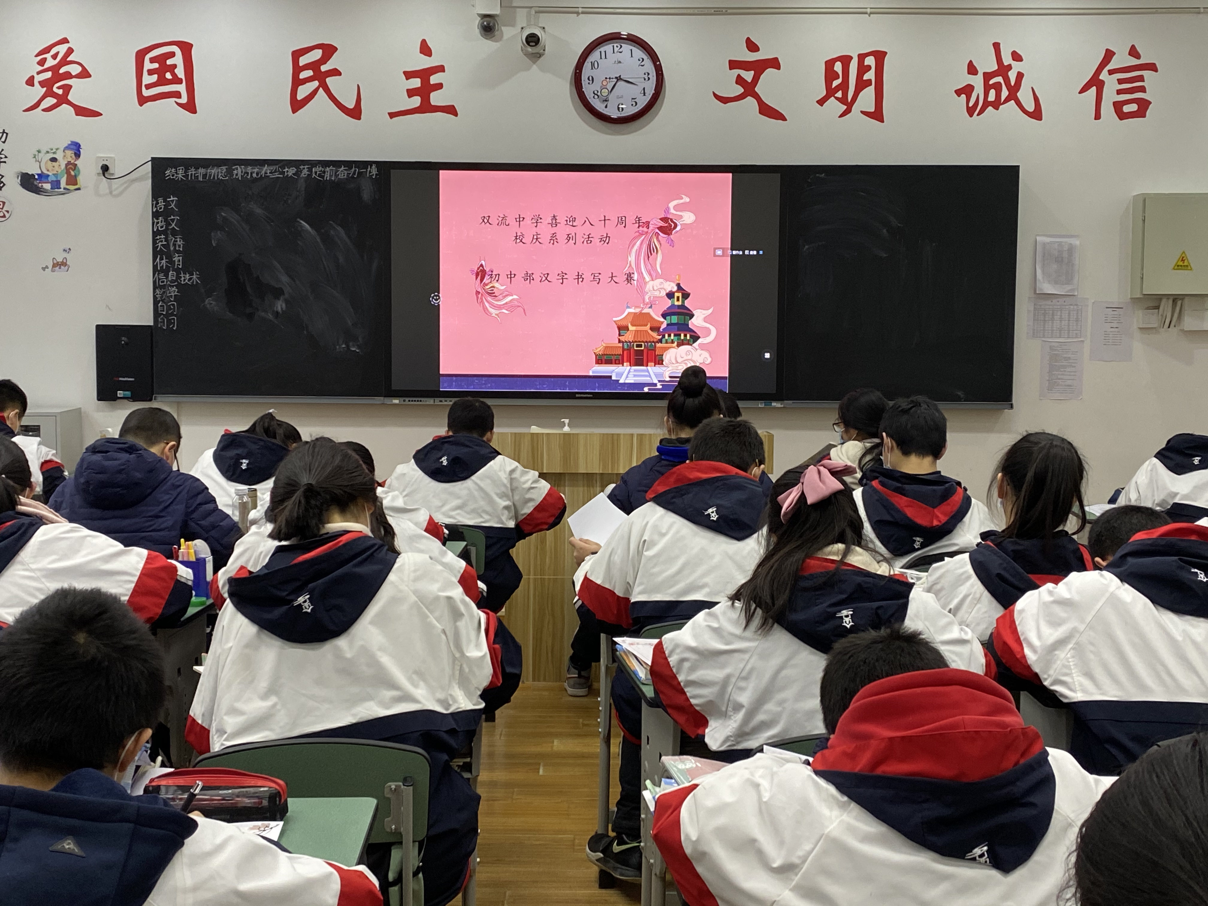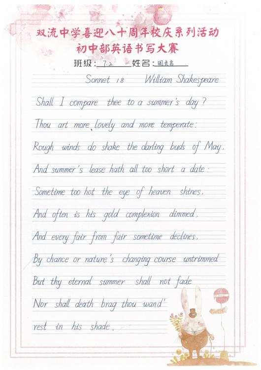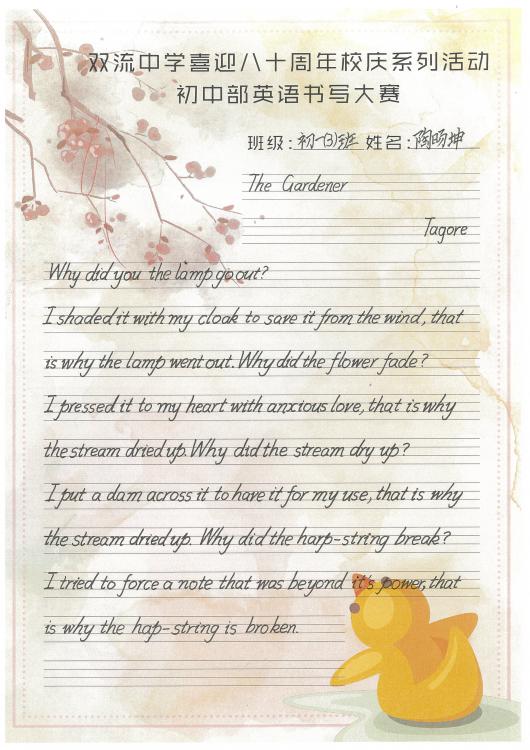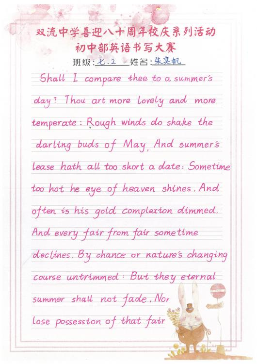 開學(xué)之初,雙流中學(xué)初中部的師生們一起,重書法練習(xí),自習(xí)課上,從間架結(jié)構(gòu)開始,放穩(wěn)心態(tài),沉靜內(nèi)心,以手中之筆,繪心中之景。一步,一步,從浮躁到平和,從挑剔到欣喜。橫,如山沉穩(wěn);豎,如峰勁拔。如今,終于小有所成,趕在80周年校慶校慶之前,雙流中學(xué)初中部舉辦了書寫大賽,同學(xué)們漢字和英語書寫美好詩篇,為母校送上了最誠摯的祝福。下面且看初中部學(xué)子一展身手: