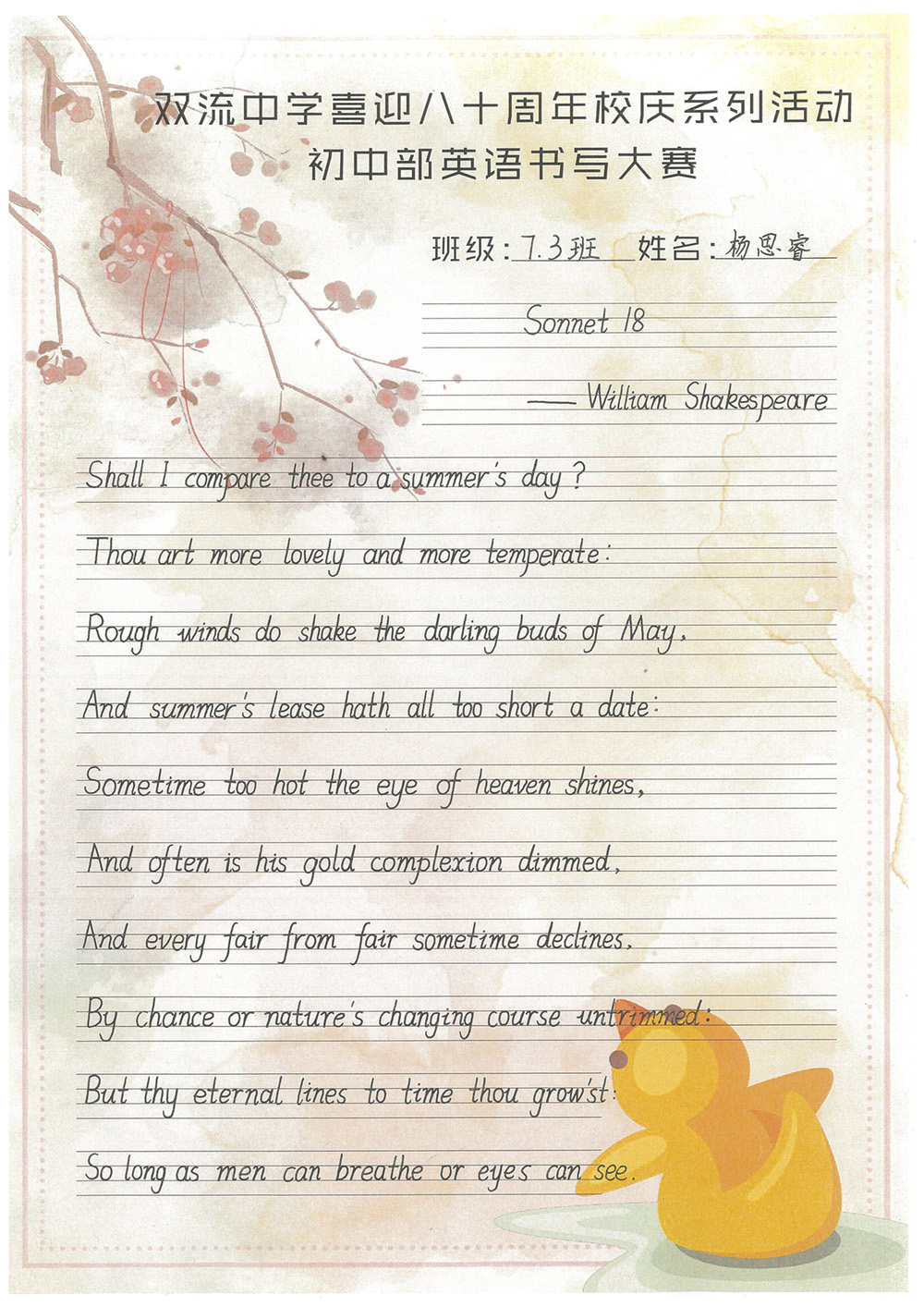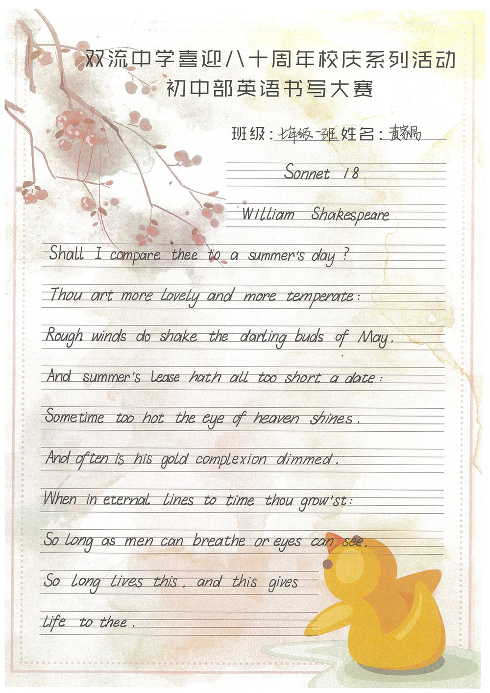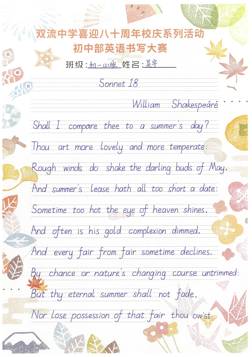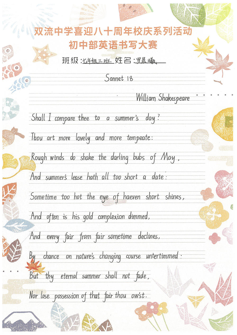 開學(xué)之初,雙流中學(xué)初中部的師生們一起,重書法練習(xí),自習(xí)課上,從間架結(jié)構(gòu)開始,放穩(wěn)心態(tài),沉靜內(nèi)心,以手中之筆,繪心中之景。一步,一步,從浮躁到平和,從挑剔到欣喜。橫,如山沉穩(wěn);豎,如峰勁拔。如今,終于小有所成,趕在80周年校慶校慶之前,雙流中學(xué)初中部舉辦了書寫大賽,同學(xué)們漢字和英語書寫美好詩篇,為母校送上了最誠摯的祝福。下面且看初中部學(xué)子一展身手: