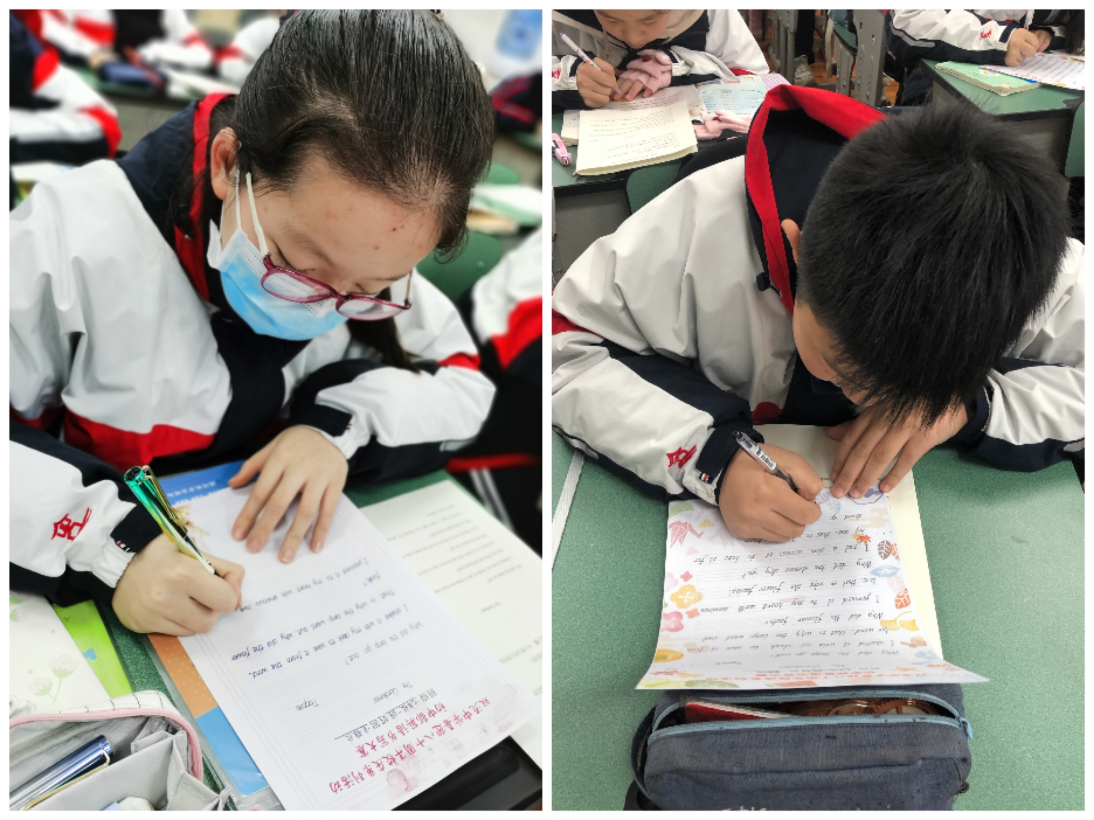 一撇一捺都滿蓄真意,每個字母都包含熱情,同學(xué)們認(rèn)真埋首書寫,在每一行詩詞中灌注自己的心血與熱愛。