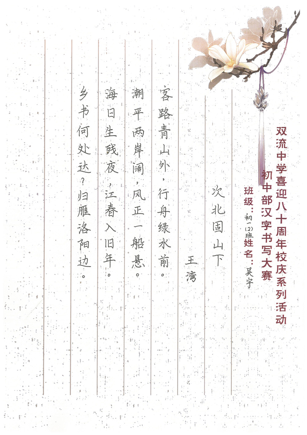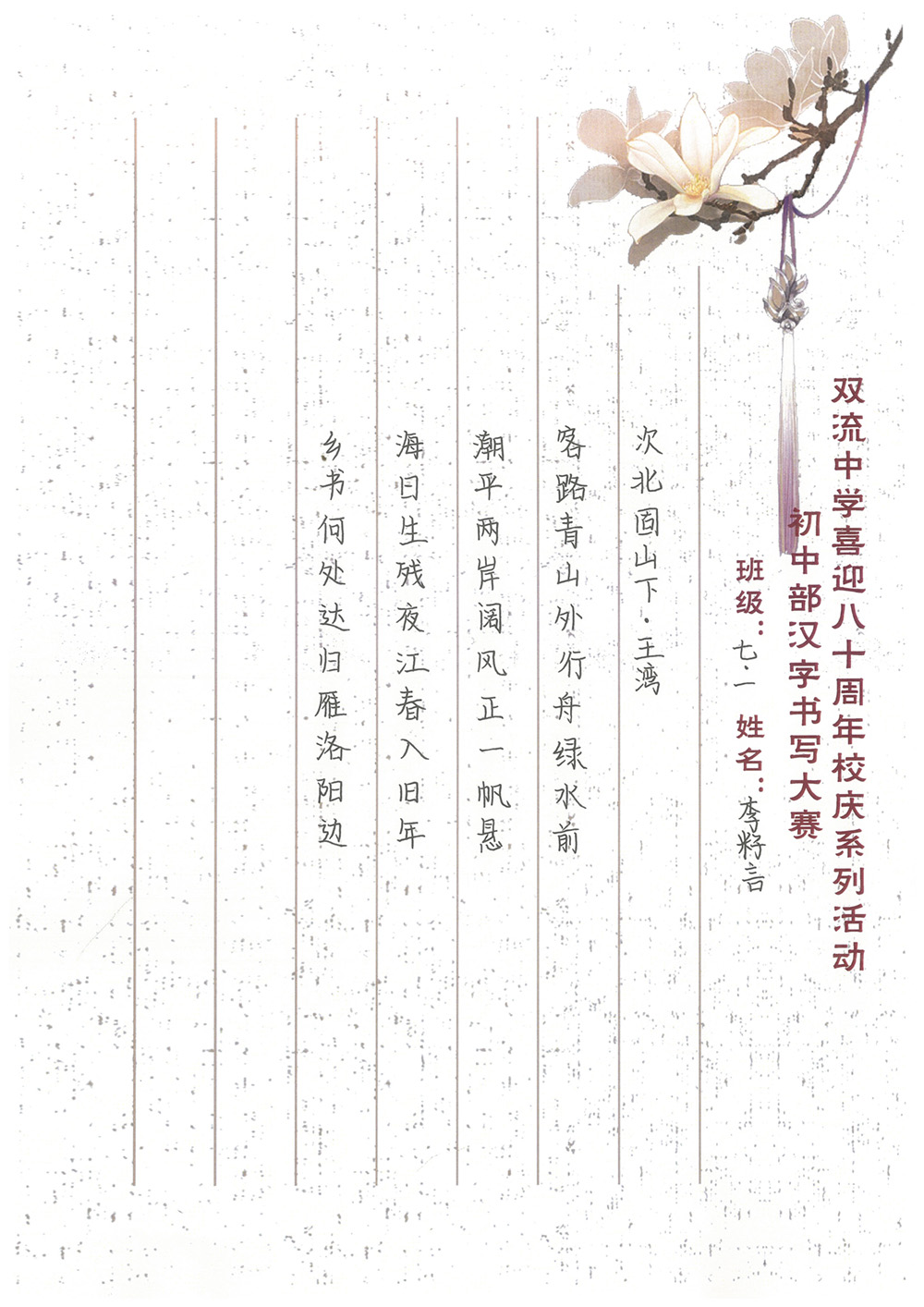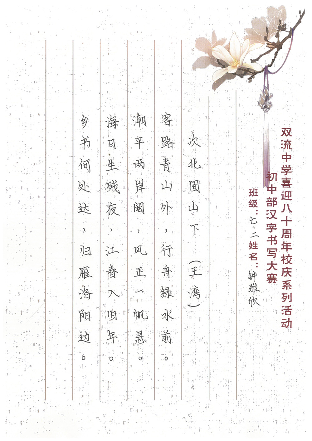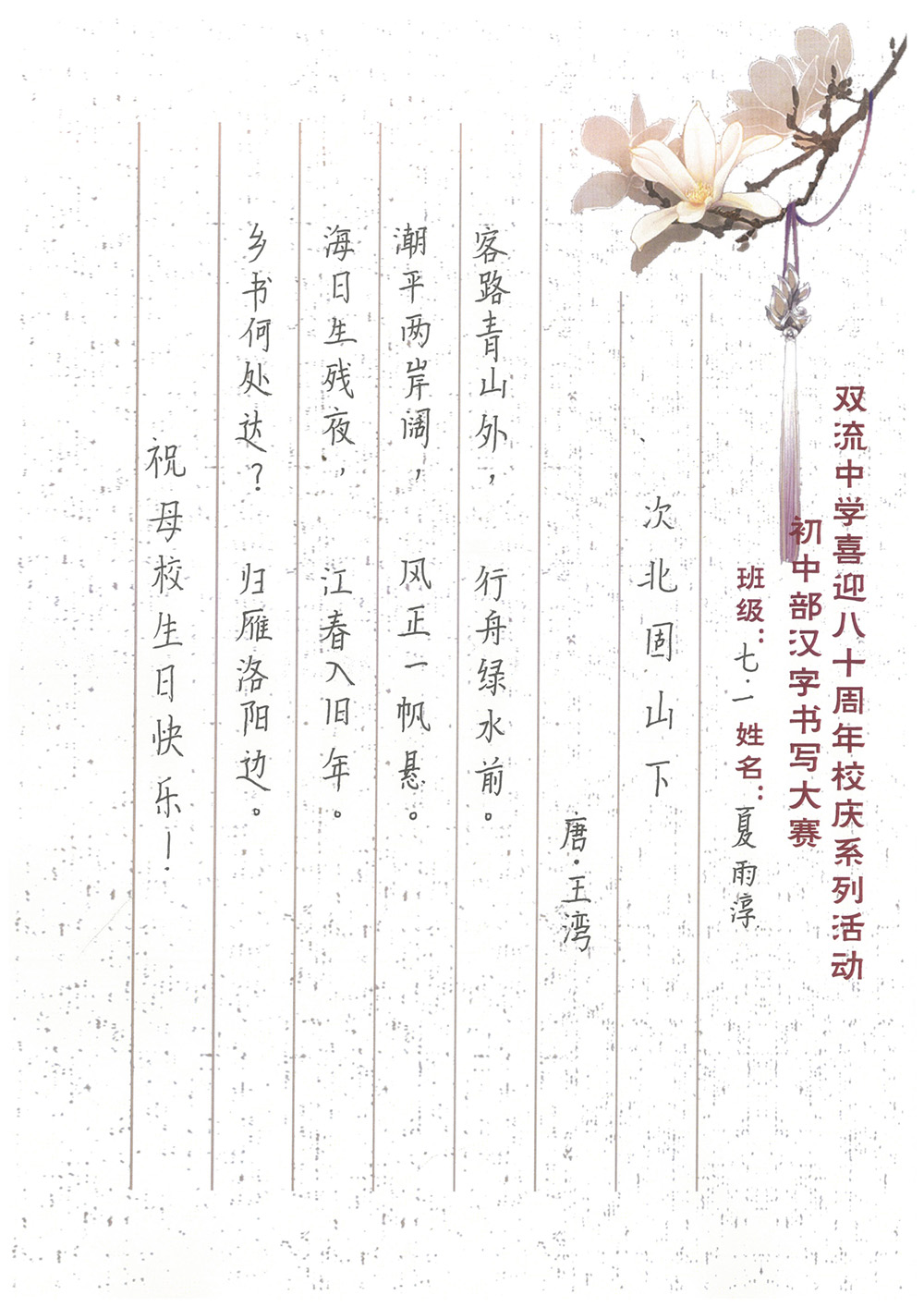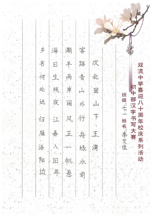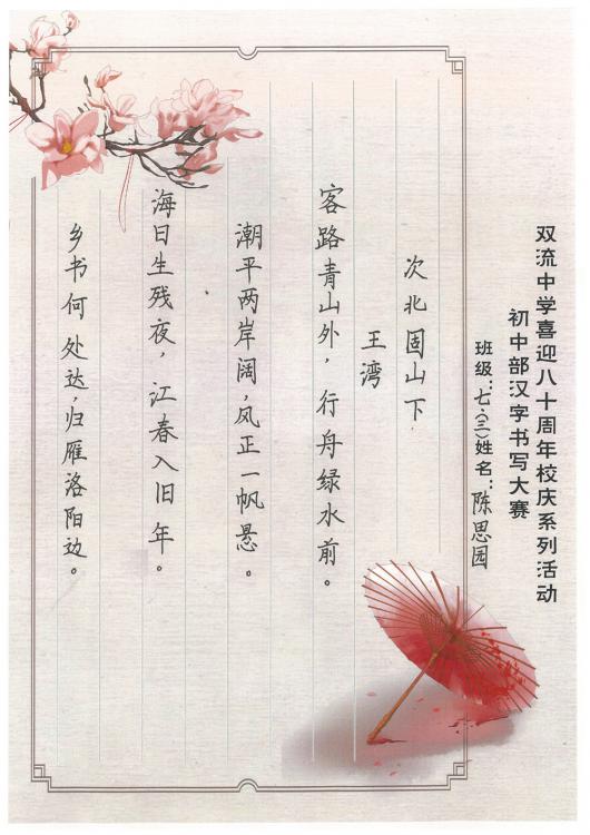 歲月是不可倒轉(zhuǎn)的唱片,在青春的狂想曲中默然回首,才發(fā)現(xiàn)我們在不知不覺中留下了成長的足跡?;厥装耸d歲月,縱然時光飛逝,雙流中學(xué)始終以內(nèi)斂而獨特的書卷氣承載著文化的流韻。這里是夢的開始也是青春跋涉的起點。初入雙中的學(xué)子們精心打磨著自己的字跡,在本次書寫大賽中,展示了自己的風(fēng)采,也為母校送上了最誠摯的祝福,愿雙中與她的兒女們,越來越好!