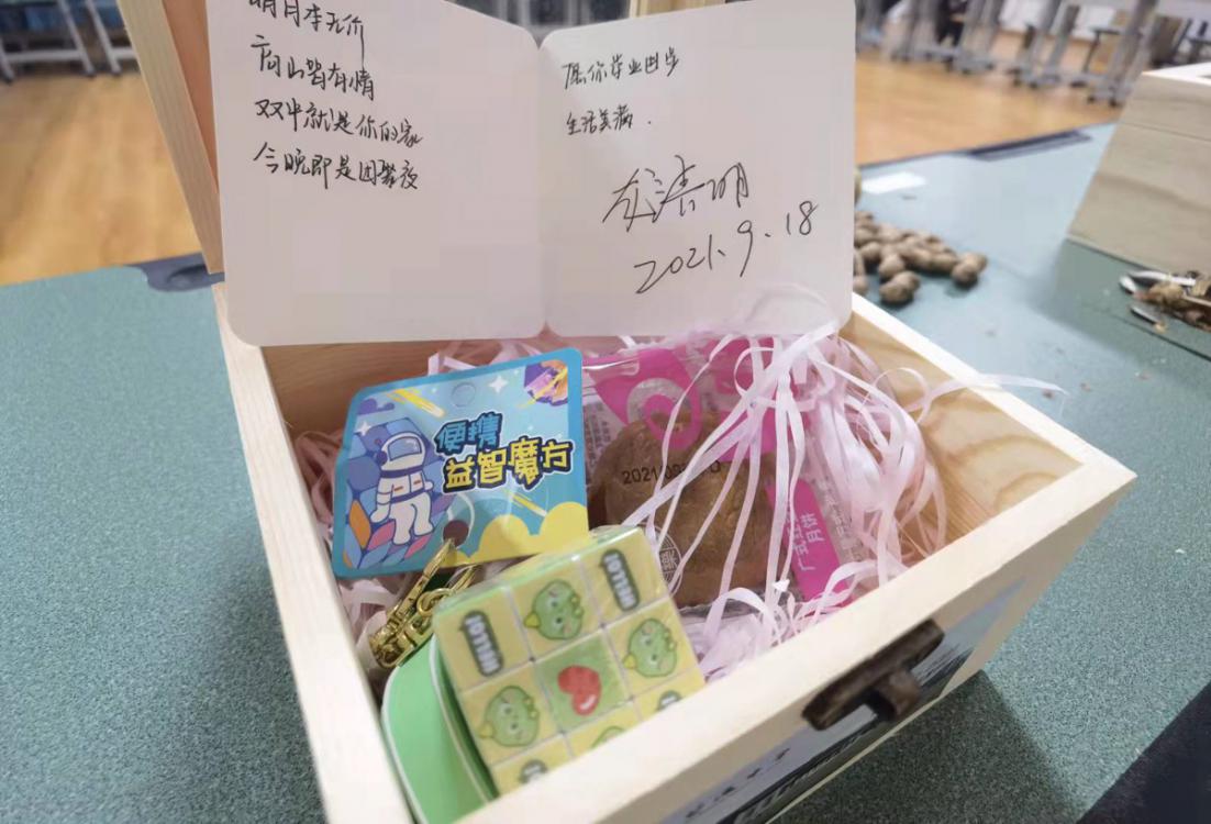 隨后,胡峻聞老師為大家傾情的講述動(dòng)人中秋的神話故事和優(yōu)美的中秋古詩詞,讓大家進(jìn)一步了解中秋佳節(jié)的背后故事。趣味游戲之“數(shù)字炸彈”、“你畫我猜”、“擊鼓傳花”,大家積極參與,自我展示,默契十足,師生其樂融融。最后,一封封能夠寄托思念的雙中明信片發(fā)到學(xué)生手中的時(shí)候,他們再也忍不住了,把自己對于家鄉(xiāng)、父母的思念和感恩傾瀉在這張薄薄的明信片上,隨著月光寄向遠(yuǎn)方,留下美好的回憶。