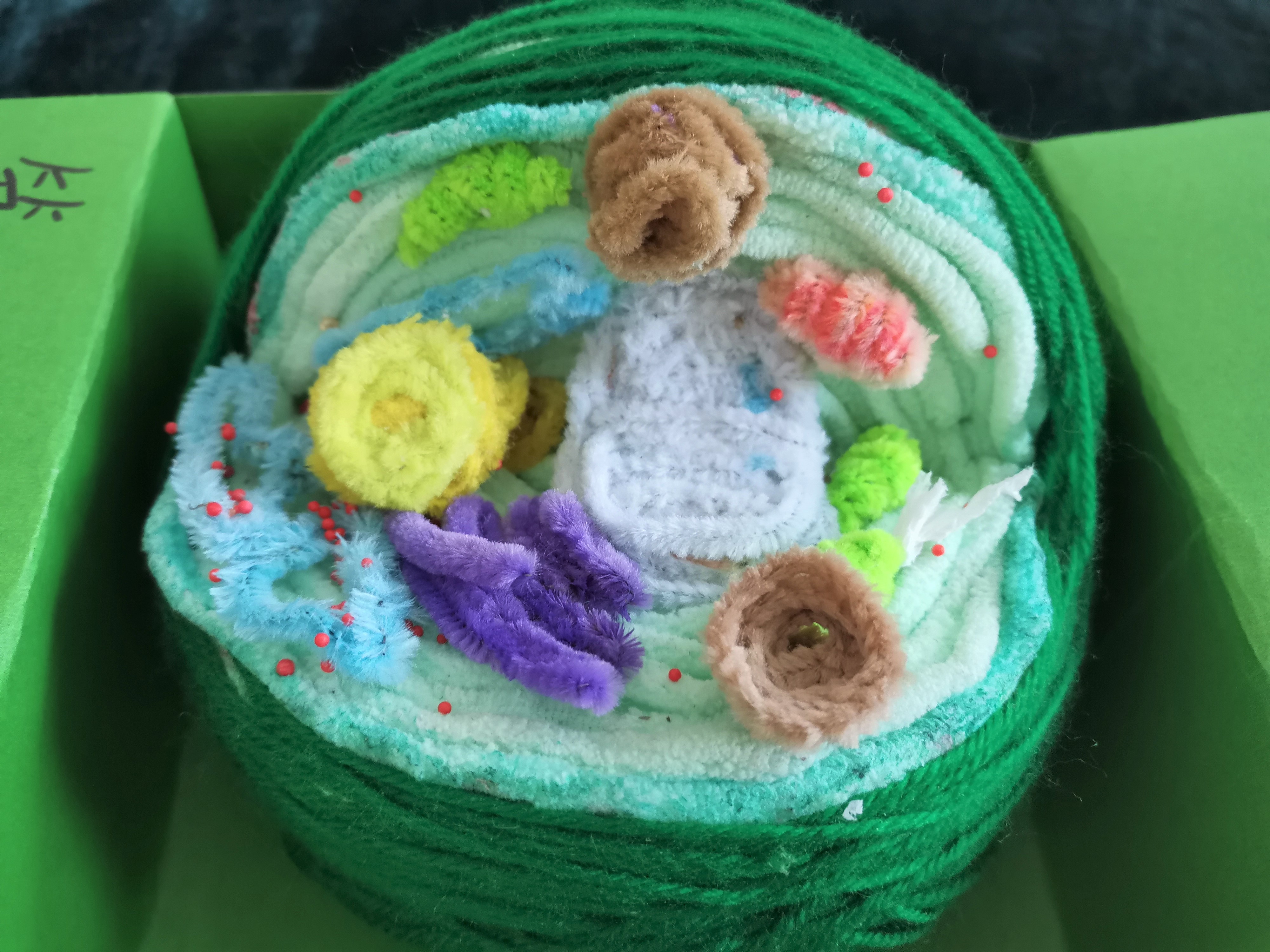 作品簡介:白色泡沫球做細(xì)胞框架,深綠色毛線構(gòu)成植物細(xì)胞的細(xì)胞壁,扭扭棒做細(xì)胞器。是不是創(chuàng)意滿滿呀。