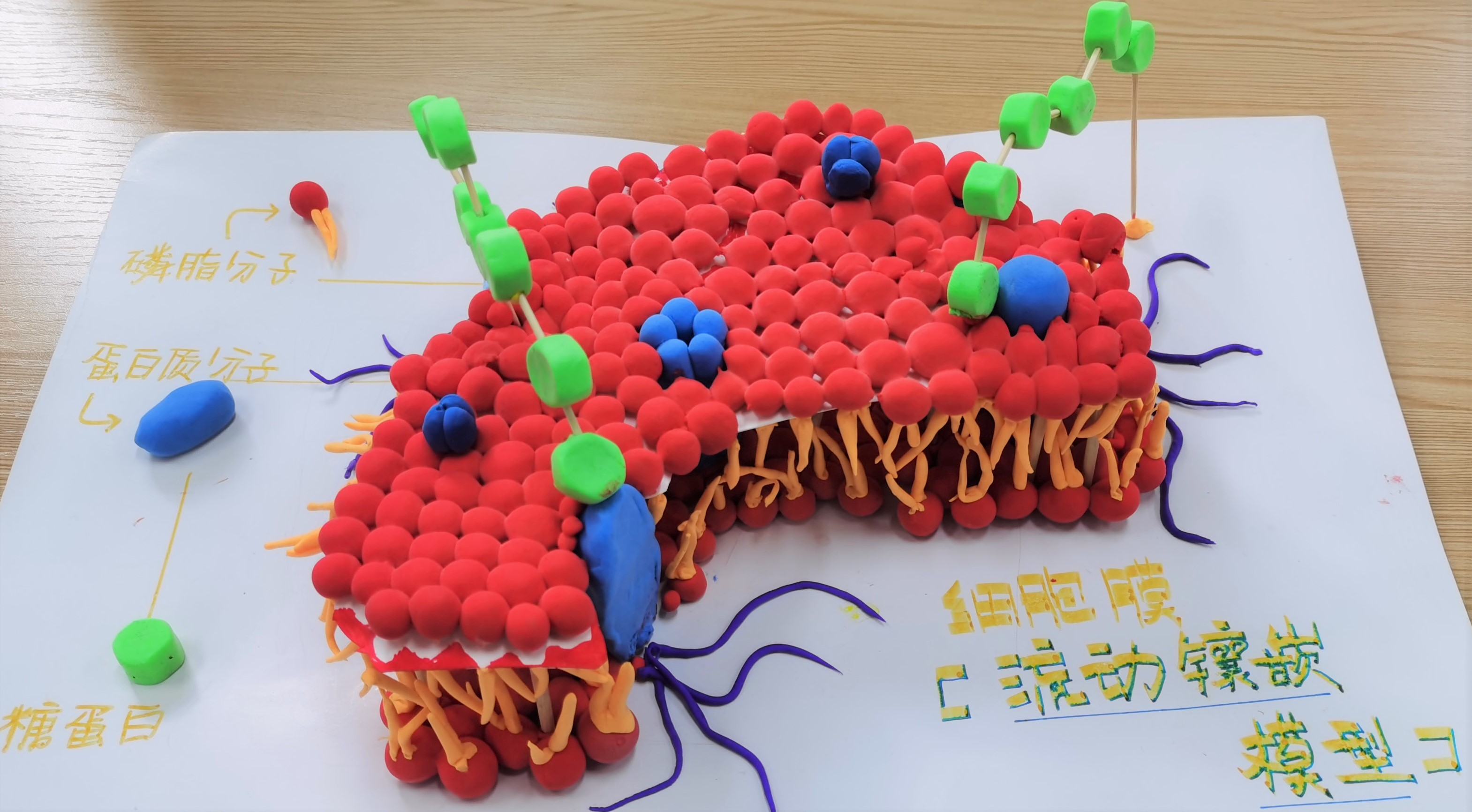 作品簡介:此為流動鑲嵌模型,紅色的頭黃色的尾就是磷脂分子啦。你找到糖脂和糖蛋白了嗎?綠色為葡萄糖,藍(lán)色是蛋白質(zhì),它們對于細(xì)胞的功能來說很重要,紫色絲線是支撐細(xì)胞的細(xì)胞骨架。