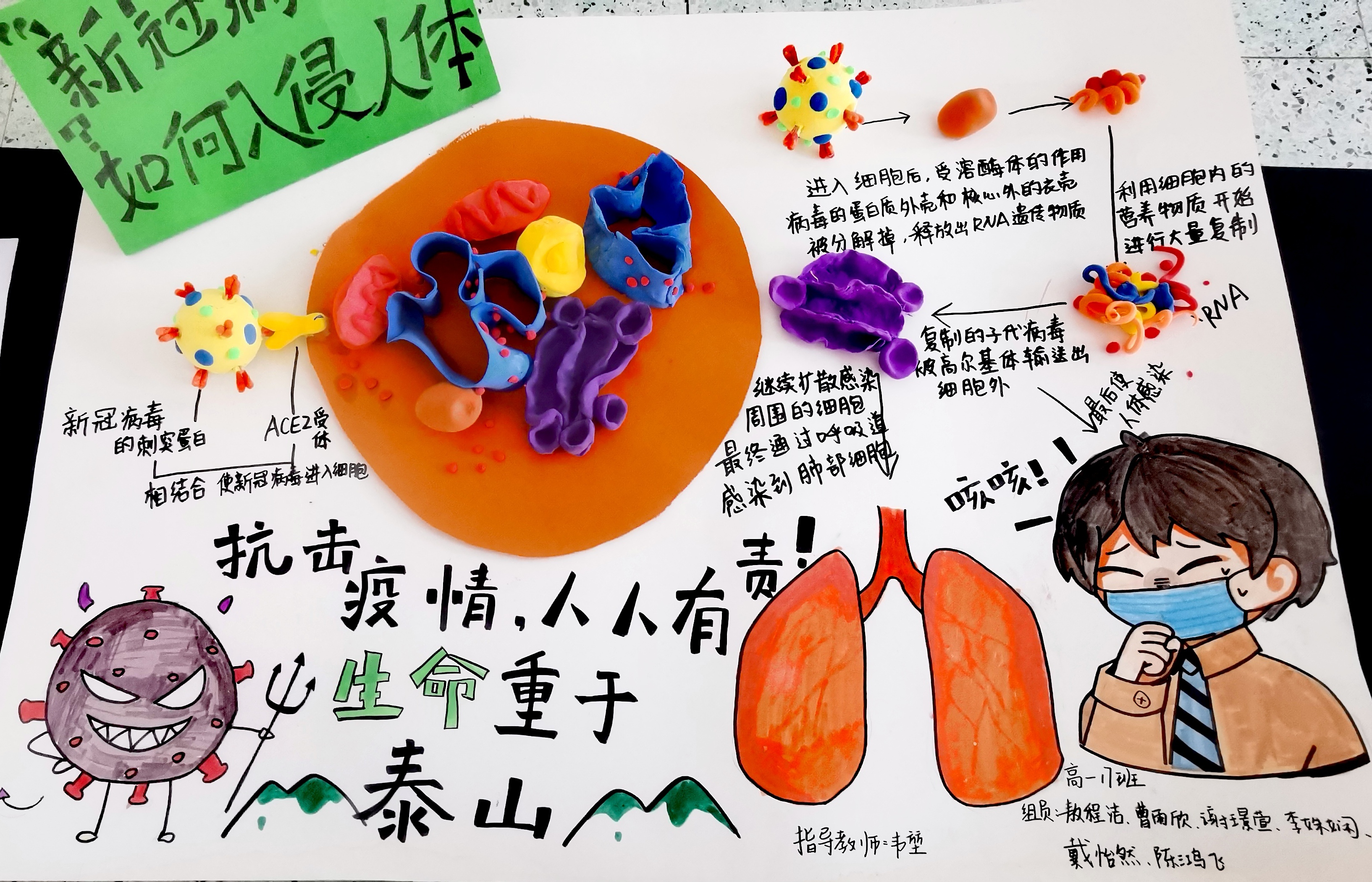 作品簡介:你知道新冠病毒是如何入侵人體的嗎?新冠病毒的刺突蛋白會與細(xì)胞膜表面受體結(jié)合侵入細(xì)胞,不斷復(fù)制,然后大量擴(kuò)散,最終通過呼吸道感染到肺部細(xì)胞。所以,抗擊疫情,帶好口罩喲。