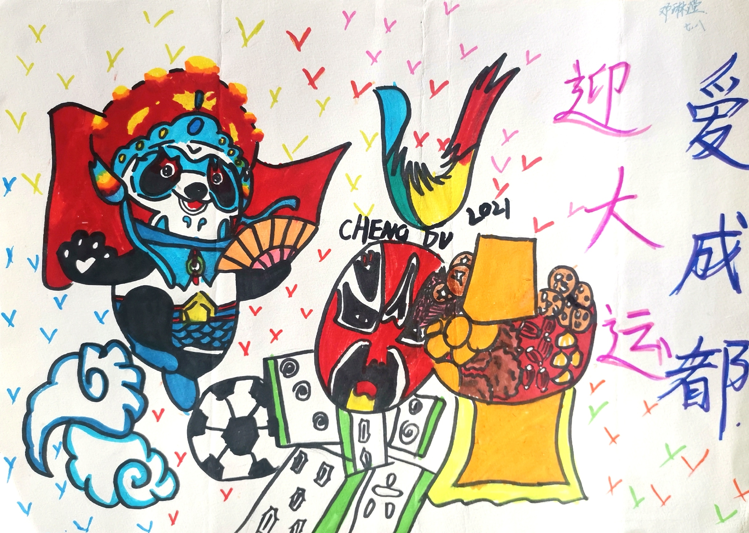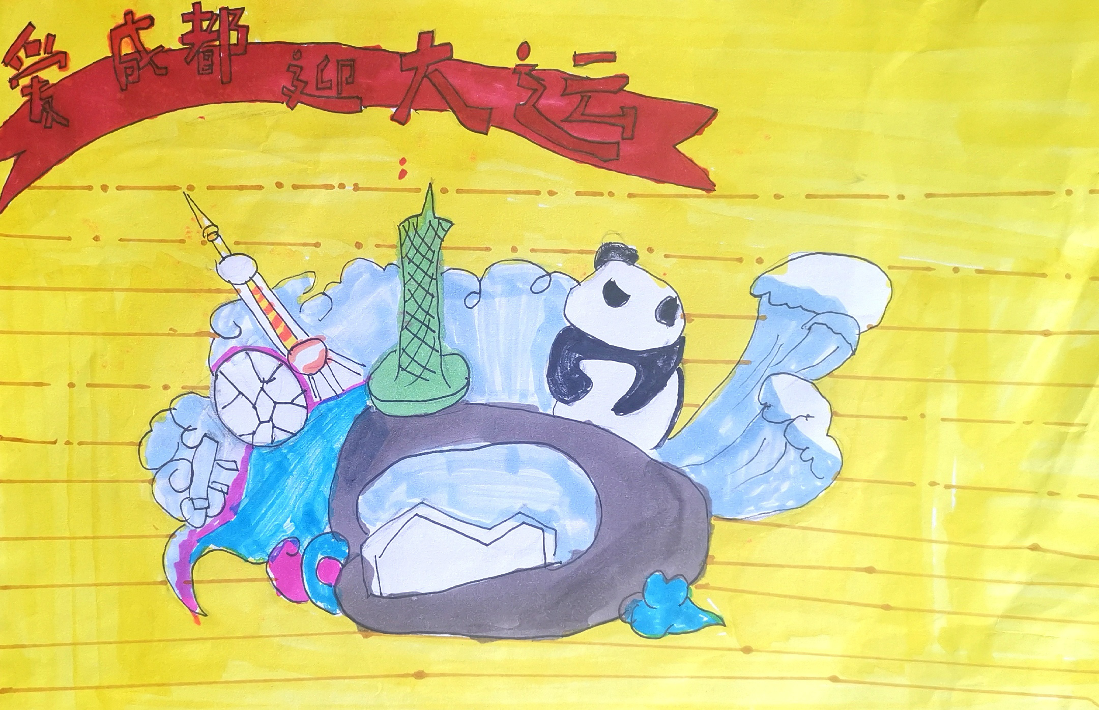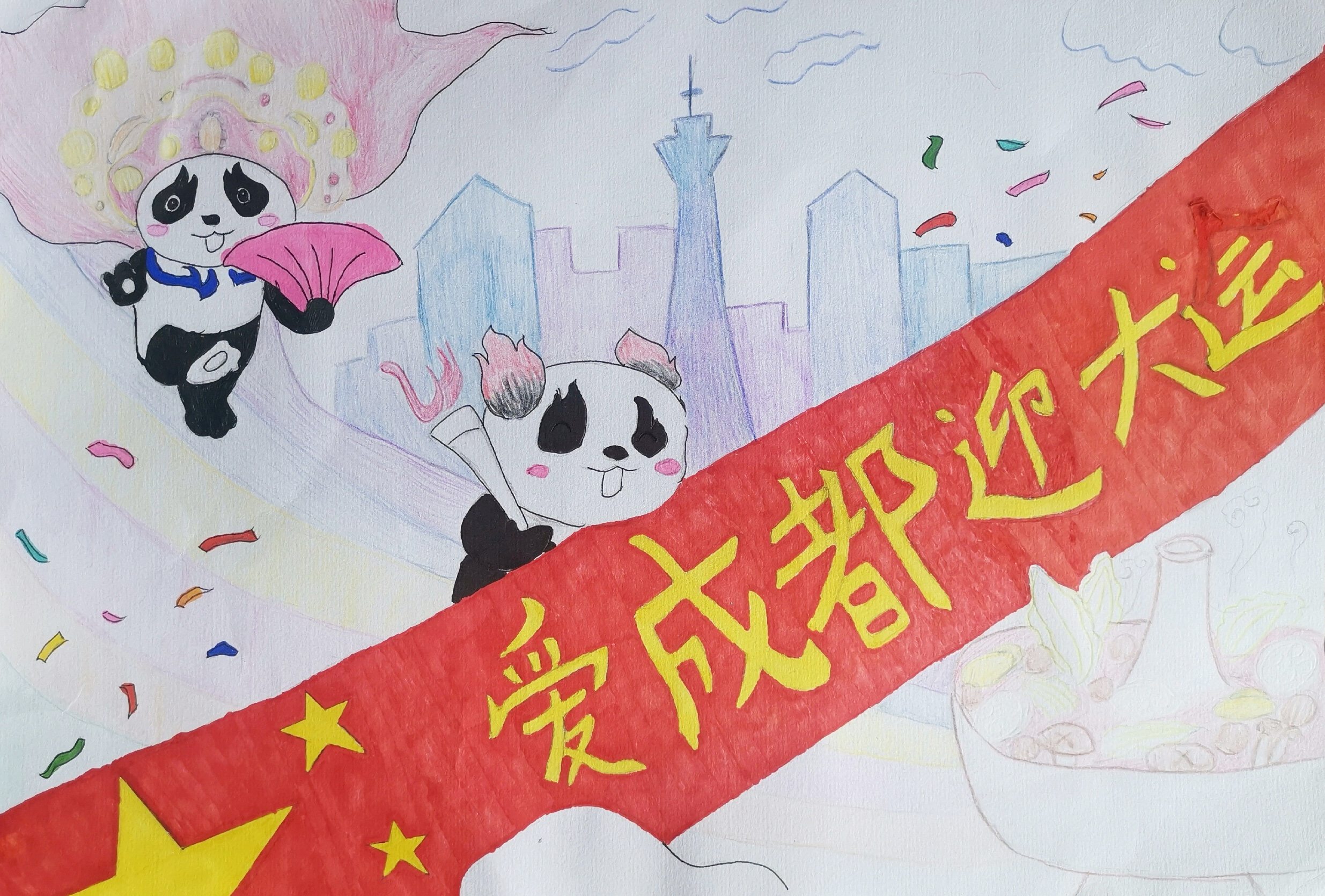 據(jù)悉,2月25日,成都第31屆世界大學(xué)生夏季運動會火種交接歡迎儀式在金沙遺址博物館舉行。歡迎儀式的圓滿舉行,讓世界一同見證了大運之火點亮希望和夢想,宣示了成都籌辦大運會的信心和決心。我們雙中的學(xué)子們也施展自己的才華,用繪畫作品表露心聲,期待著大運會的到來。