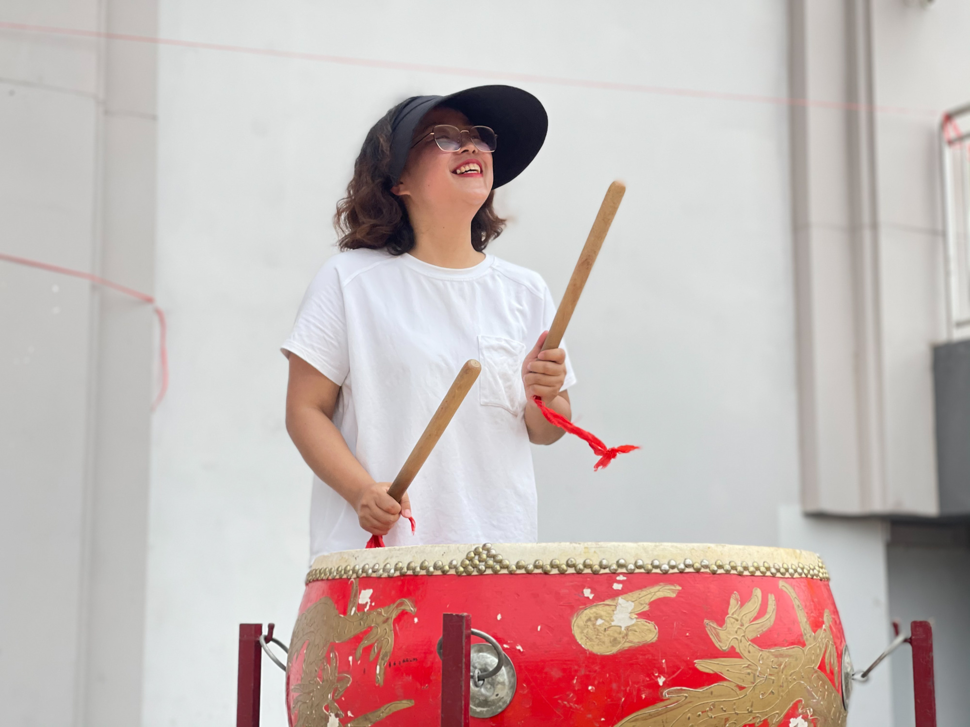 王瑞玲老師現(xiàn)場擊鼓,為同學們加油打氣