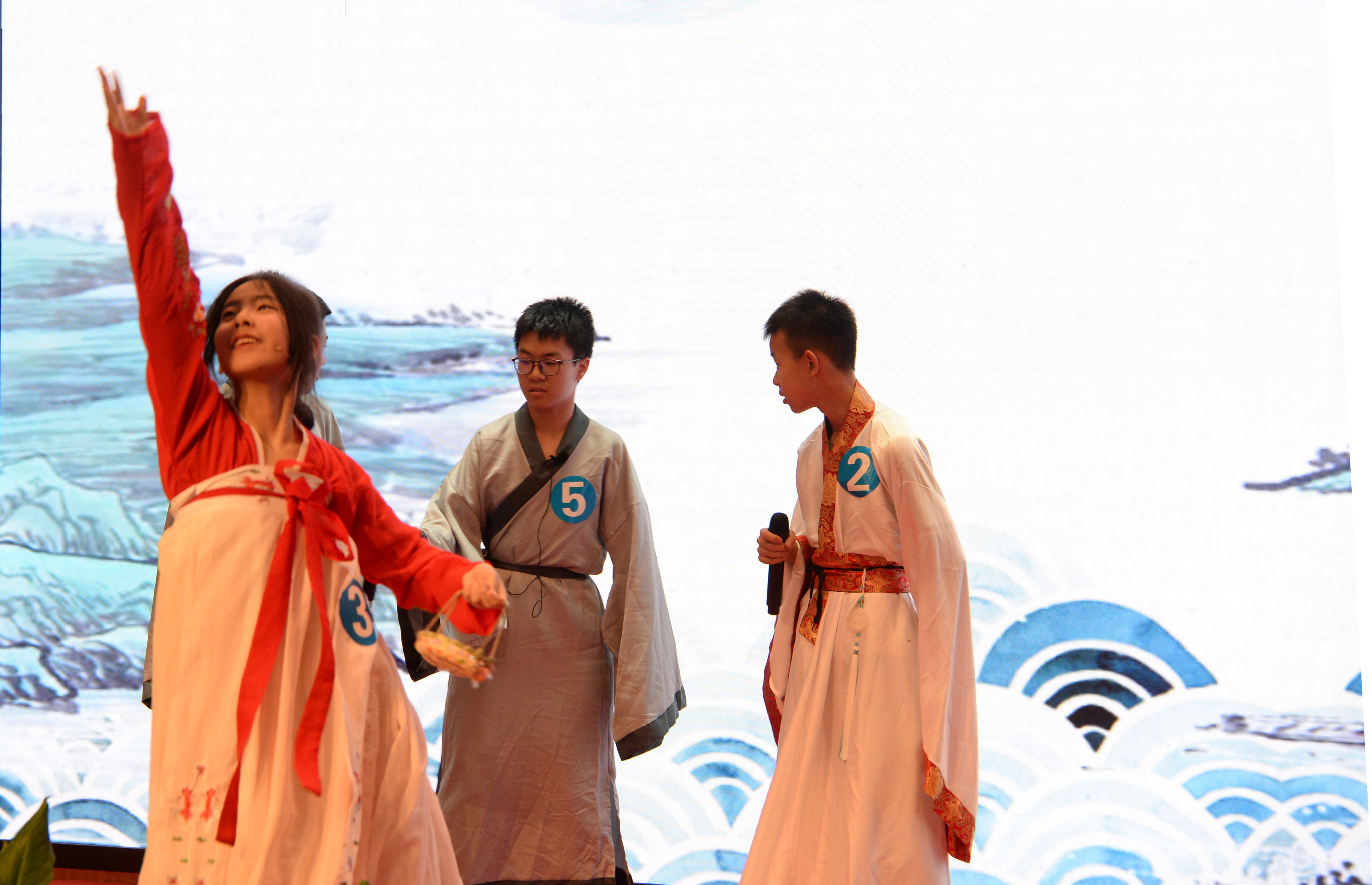 一曲唱罷,氣氛恰到好處,初二一班的表演者們首先登場。他們所帶來的劇目是《洛神賦》,他們用英語為我們講述中國故事。在一班同學(xué)的演繹下,一切角色都活靈活現(xiàn),獲得了全場的掌聲。