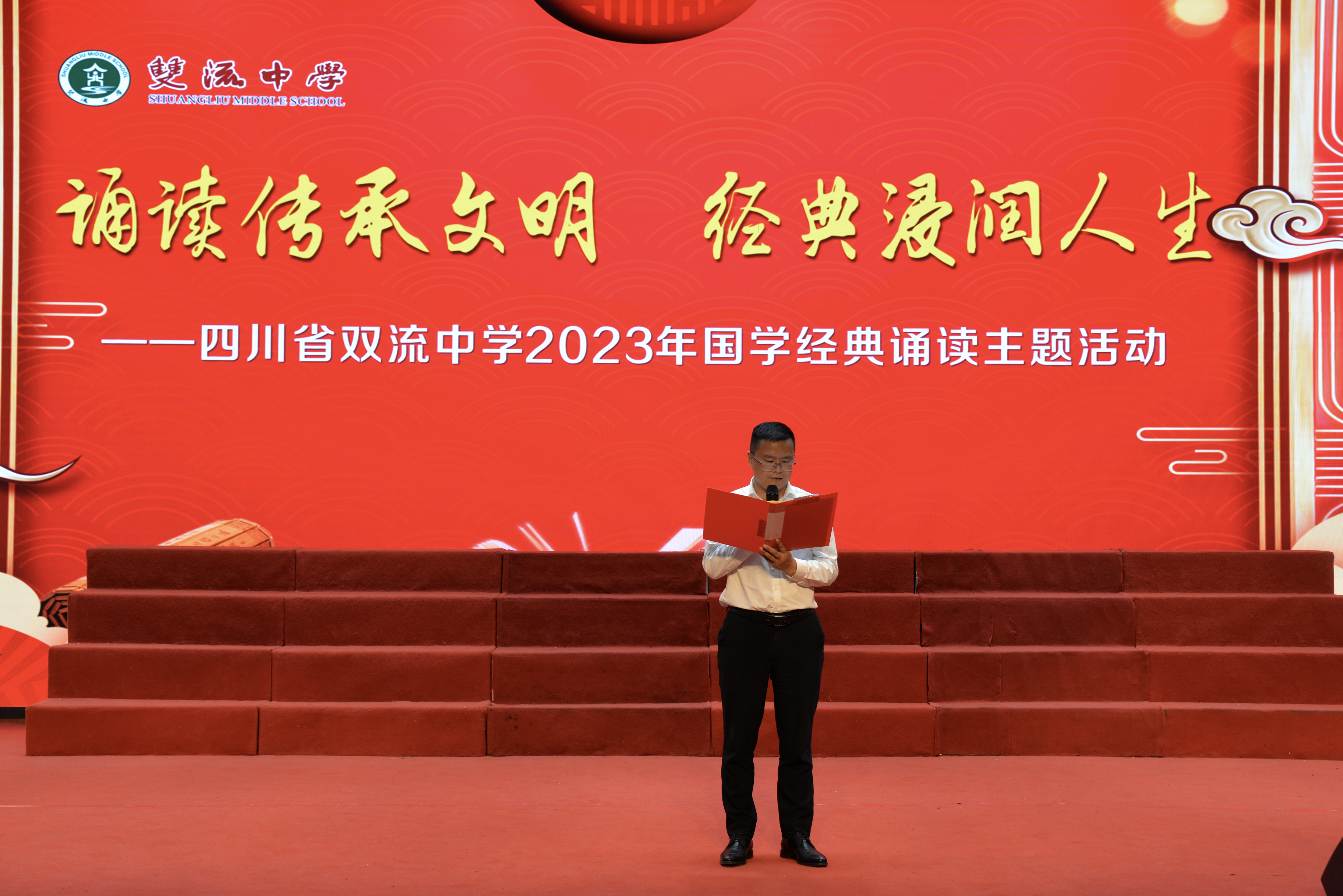 開場前,雙流中學(xué)黨委書記黃超上臺為同學(xué)們致開場辭。黃校長鼓勵同學(xué)們走近經(jīng)典,在經(jīng)典獲取成長的力量,并囑咐同學(xué)們勇?lián)鷤鞒袀鹘y(tǒng)文化的重任!