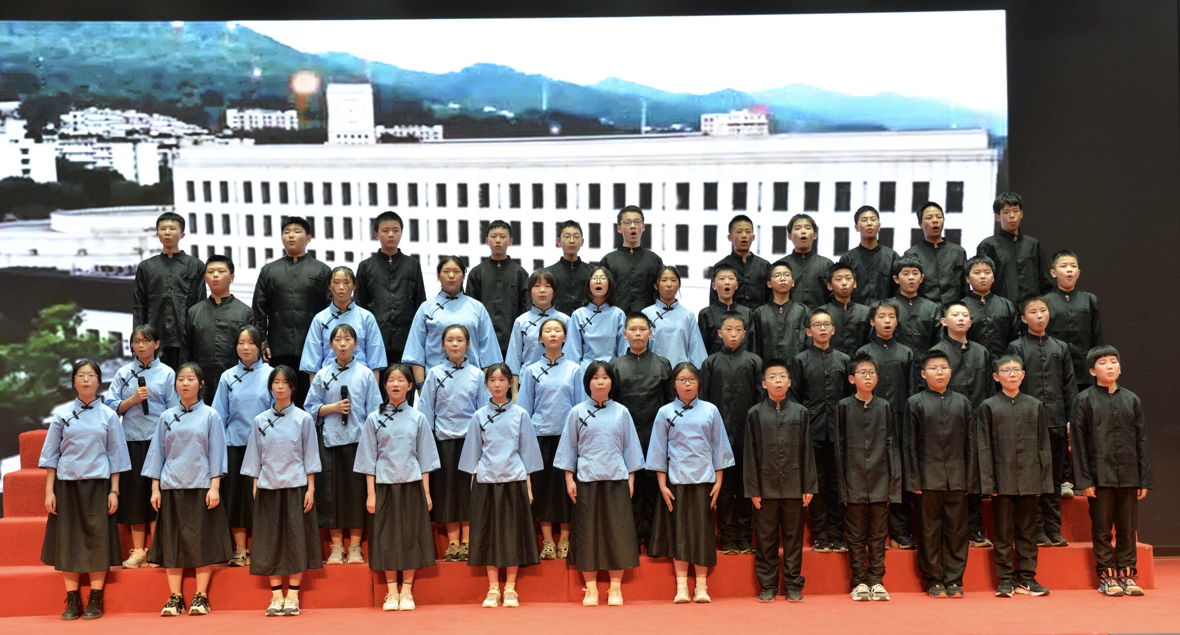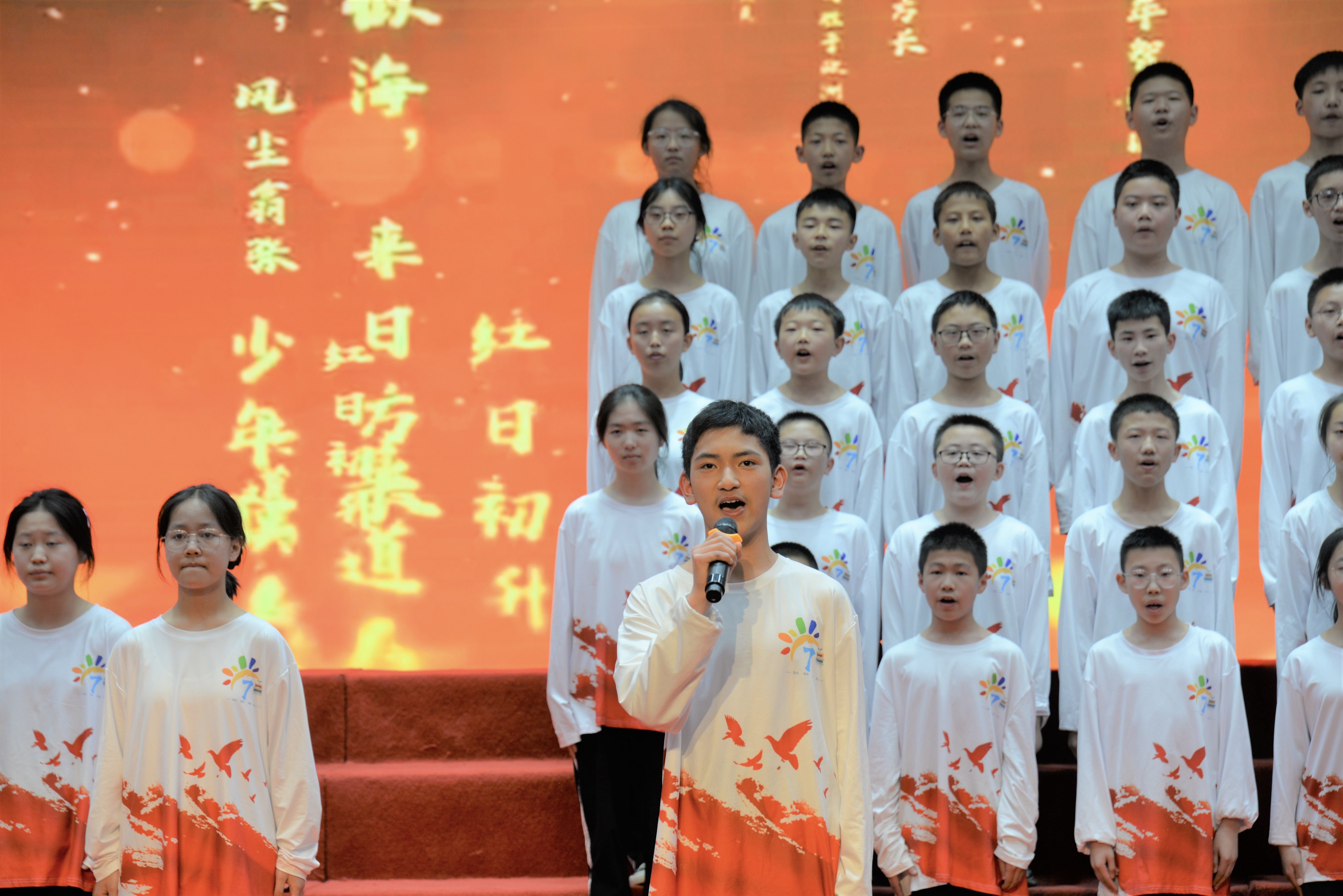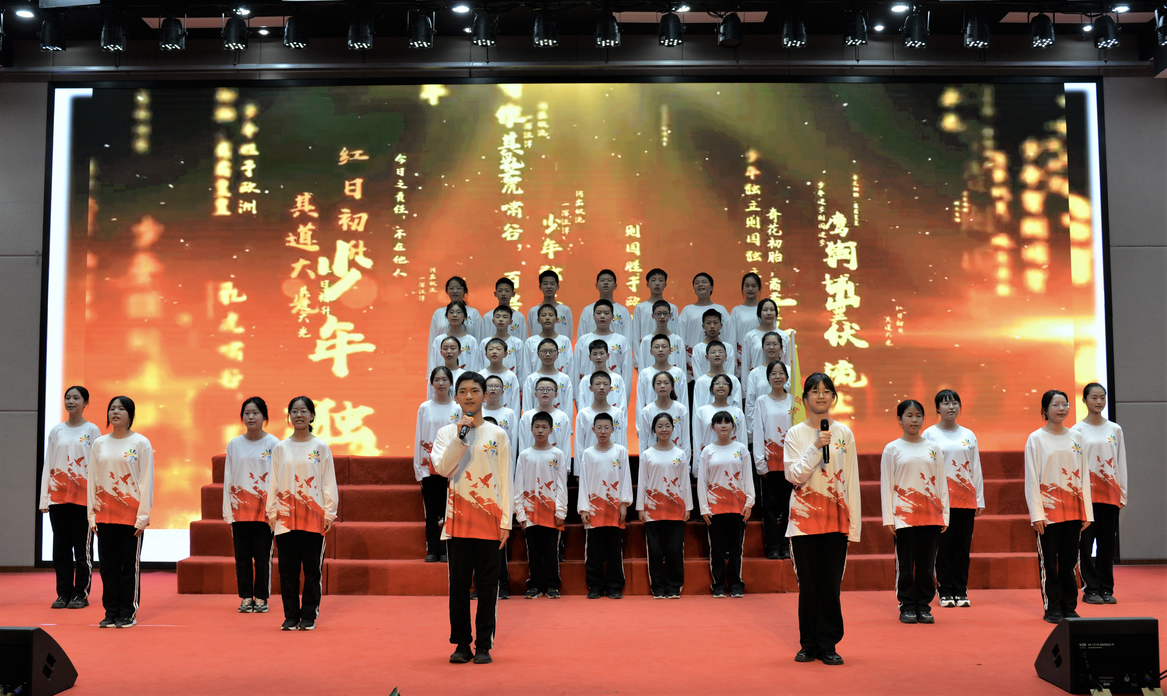 七年級6班在《沁園春·長沙》中,朗誦出毛澤東在橘子洲頭迎風(fēng)佇立的英姿,無邊落葉與滾滾江水里是青春的豪情壯志。