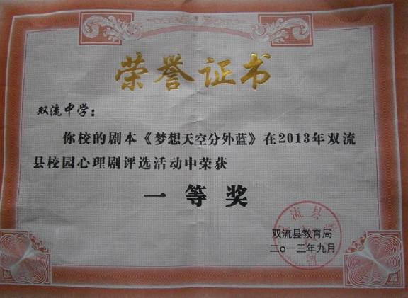 熱烈祝賀我校學(xué)生社團(tuán)——心理社創(chuàng)作的校園心理劇《夢想天空分外藍(lán)》在2013年雙流縣校園心理劇評選活動中榮獲一等獎!
