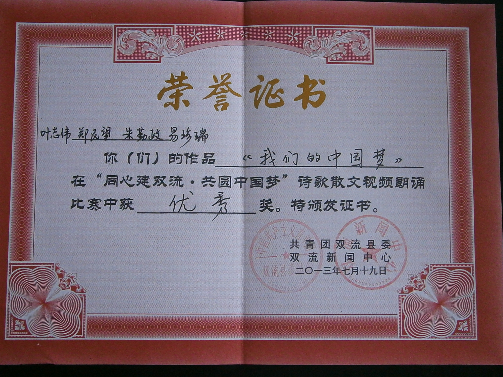 由雙流中學(xué)團(tuán)委、學(xué)生會(huì)選送,葉志偉、鄭民望、朱勤政、易珍瑞同學(xué)參演的作品《我們的中國(guó)夢(mèng)》在共青團(tuán)雙流縣委、雙流新聞中心主辦的“同心建雙流 共圓中國(guó)夢(mèng)”詩(shī)歌散文視頻朗誦比賽中獲得“優(yōu)秀獎(jiǎng)”。