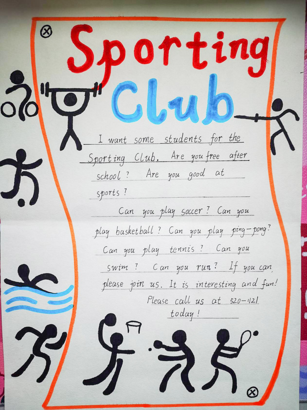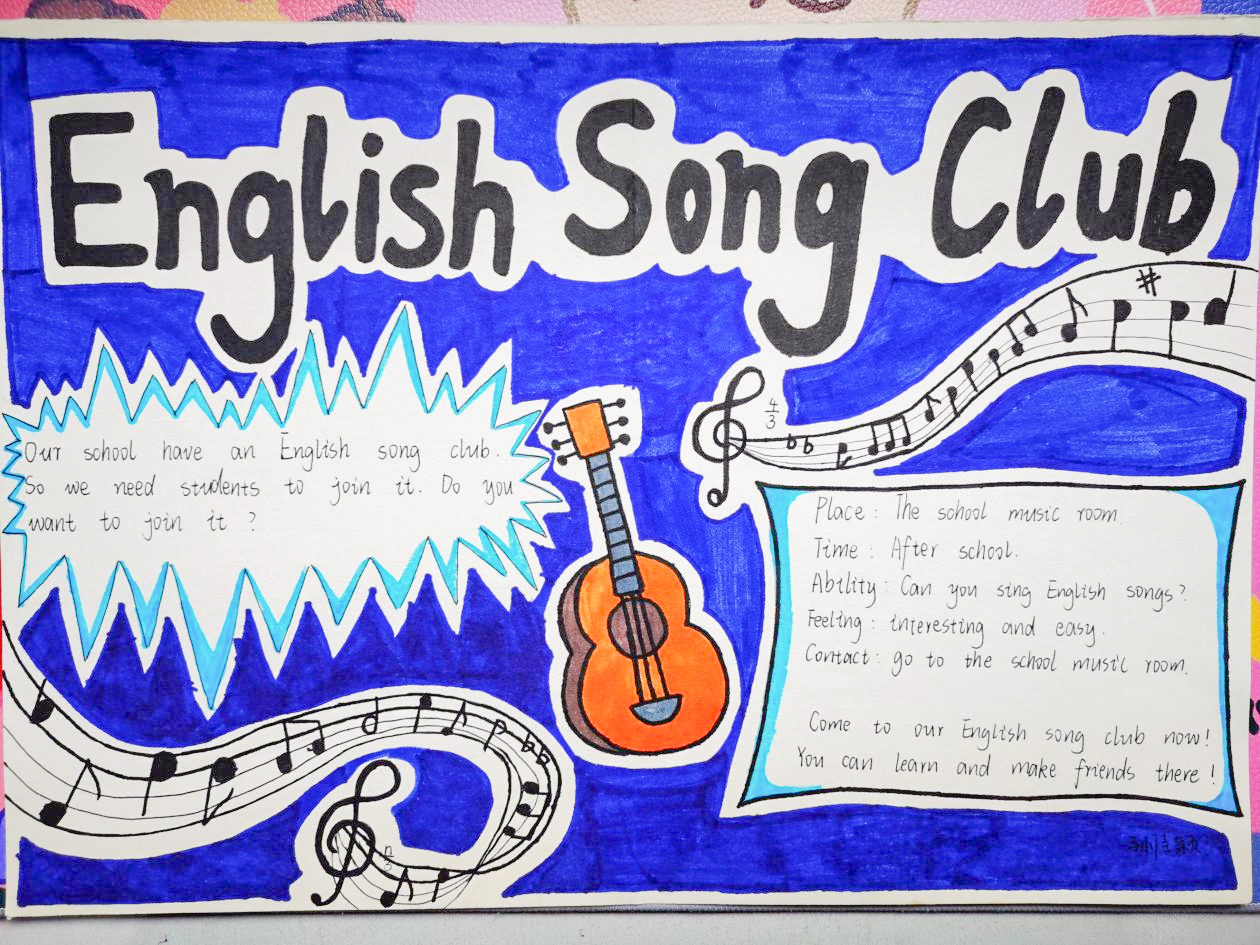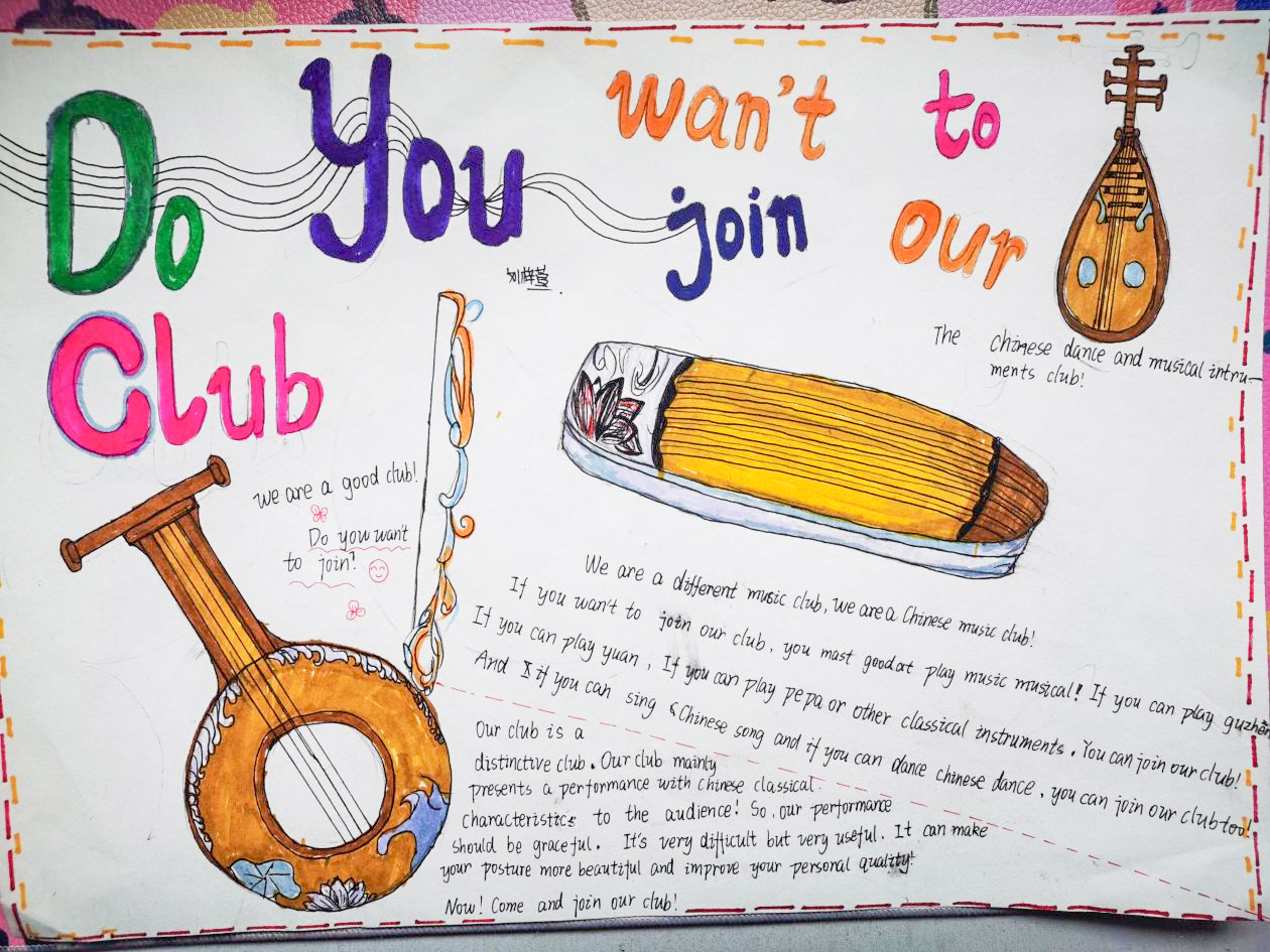雙流中學(xué)七年級一班在此基礎(chǔ)上開發(fā)出特色英語海報設(shè)計作業(yè)。本次作業(yè)是七年級下冊第一單元的課外拓展類作業(yè)。學(xué)生結(jié)合自身能力參加俱樂部的話題,在課堂上討論俱樂部納新廣告的具體內(nèi)容,變“寫”為“畫”,設(shè)計出自己俱樂部招新海報。這份作業(yè)不再是枯燥的寫作任務(wù),而是讓學(xué)生在實(shí)際的情境中應(yīng)用所學(xué),喜歡繪畫的同學(xué)更能將自己的愛好與英語寫作結(jié)合起來,同學(xué)設(shè)計的廣告色彩明艷,活潑動人,體現(xiàn)了初中生青春陽光朝氣的一面。
