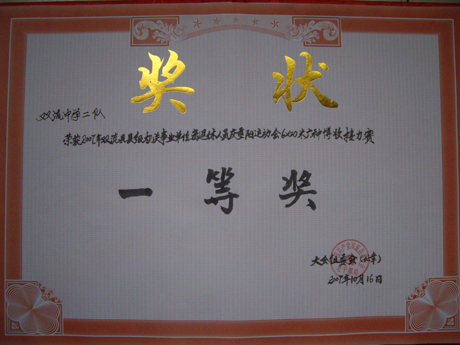 2007年10月16日 ,雙流縣級(jí)機(jī)關(guān)、事業(yè)單位退休人員慶“重陽(yáng)”運(yùn)動(dòng)會(huì)在人民廣場(chǎng)隆重舉行。我校退休教師組織了5個(gè)隊(duì)分別參加四個(gè)項(xiàng)目的比賽,其中廣種博收接力分獲第一、二名、七人卸瓜獲第二名、6人飛鏢投靶獲第三名,再現(xiàn)雙流中學(xué)退休教師的風(fēng)采。