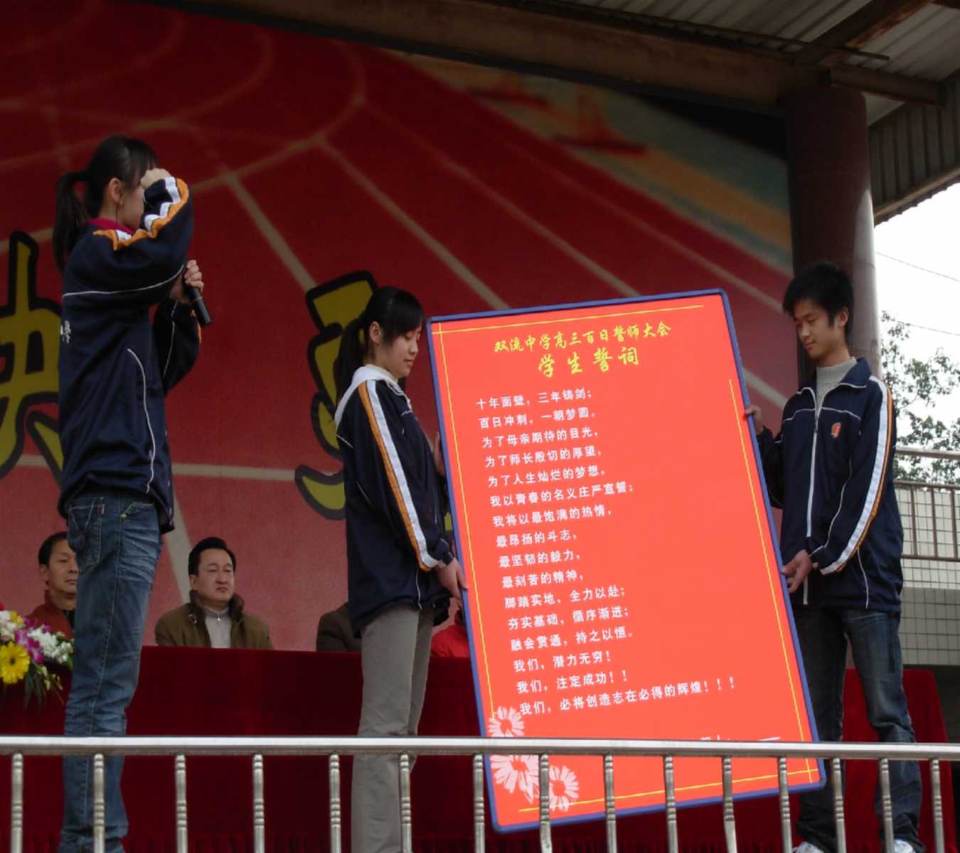 鏗鏘有力的誓言,在校園上空久久回蕩!師生群情振奮、斗志昂揚(yáng)!誓師大會(huì)的召開,極大鼓舞了高三師生的士氣,充分激發(fā)了高三師生的備考干勁和熱情,為沖刺和決勝高考開了個(gè)好頭。我們相信,勤奮刻苦,嚴(yán)謹(jǐn)求實(shí),永不服輸?shù)碾p中學(xué)子一定不會(huì)辜負(fù)老師、家長(zhǎng)的深情厚望,一定會(huì)向社會(huì)、學(xué)校、老師、家長(zhǎng),向自己無(wú)悔的青春獻(xiàn)上一份滿意的答卷!“含辛茹苦十二載莫負(fù)蒼天降大任,秣馬厲兵一百日且看我輩續(xù)輝煌”。 2008年,雙中必將又是一個(gè)豐收年!