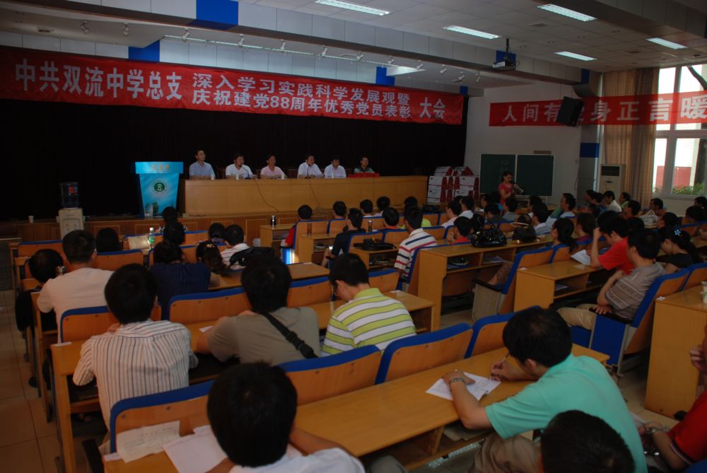2009630下午,雙流中學(xué)全體黨員齊聚雙中學(xué)術(shù)廳,參加深入學(xué)習(xí)實(shí)踐科學(xué)發(fā)展觀暨慶祝建黨88周年優(yōu)秀黨員表彰大會(huì),氣氛莊嚴(yán)而熱烈。當(dāng)主持人總支組織委員劉由遠(yuǎn)副校長宣布會(huì)議開幕后,高亢激越的國歌聲響徹整個(gè)會(huì)議廳,在國歌聲中,黨員們不僅感受到了祖國的滄桑巨變,更明確了作為一名共產(chǎn)黨員使命的光榮和責(zé)任的重大。