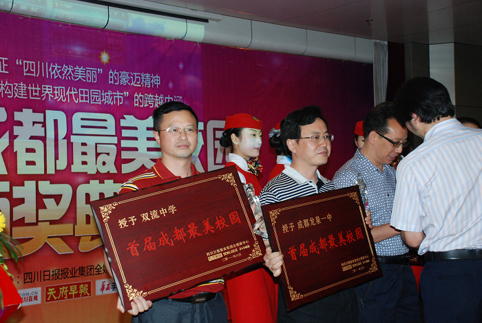 “尋找成都最美校園”是由四川報(bào)業(yè)集團(tuán)全媒體中心特別推出的大型公益報(bào)道,從5月29日拉開(kāi)帷幕到6月21日舉行頒獎(jiǎng)典禮,歷時(shí)近一個(gè)月,通過(guò)“選民”投票、專家評(píng)定,最終評(píng)選出“成都最美校園十佳中學(xué)”、“ 成都最美校園十佳小學(xué)”和“成都最美校園特別榮譽(yù)獎(jiǎng)”。國(guó)家級(jí)示范高中、中國(guó)百?gòu)?qiáng)中學(xué)、全國(guó)素質(zhì)教育先進(jìn)示范學(xué)校雙流中學(xué)憑借超高的人氣和專家的青睞,在此次活動(dòng)中脫穎而出,榮獲“成都最美校園十佳中學(xué)”第一名。雙流中學(xué)黨總支書(shū)記、副校長(zhǎng)張衛(wèi)東代表學(xué)校領(lǐng)獎(jiǎng)并在頒獎(jiǎng)典禮上發(fā)表了獲獎(jiǎng)感言,他說(shuō):雙流中學(xué)的美不僅僅在于她優(yōu)美的育人環(huán)境,現(xiàn)代的教學(xué)設(shè)施,更在于她深厚的文化底蘊(yùn)和走內(nèi)涵發(fā)展之路所形成的雙中教師儒雅、雙中學(xué)生文雅、雙中校園高雅所達(dá)到的一種“雅文化境界”,這是一種由內(nèi)而外的大氣之美。我堅(jiān)信:明天的雙流中學(xué)會(huì)比今天更加美麗!