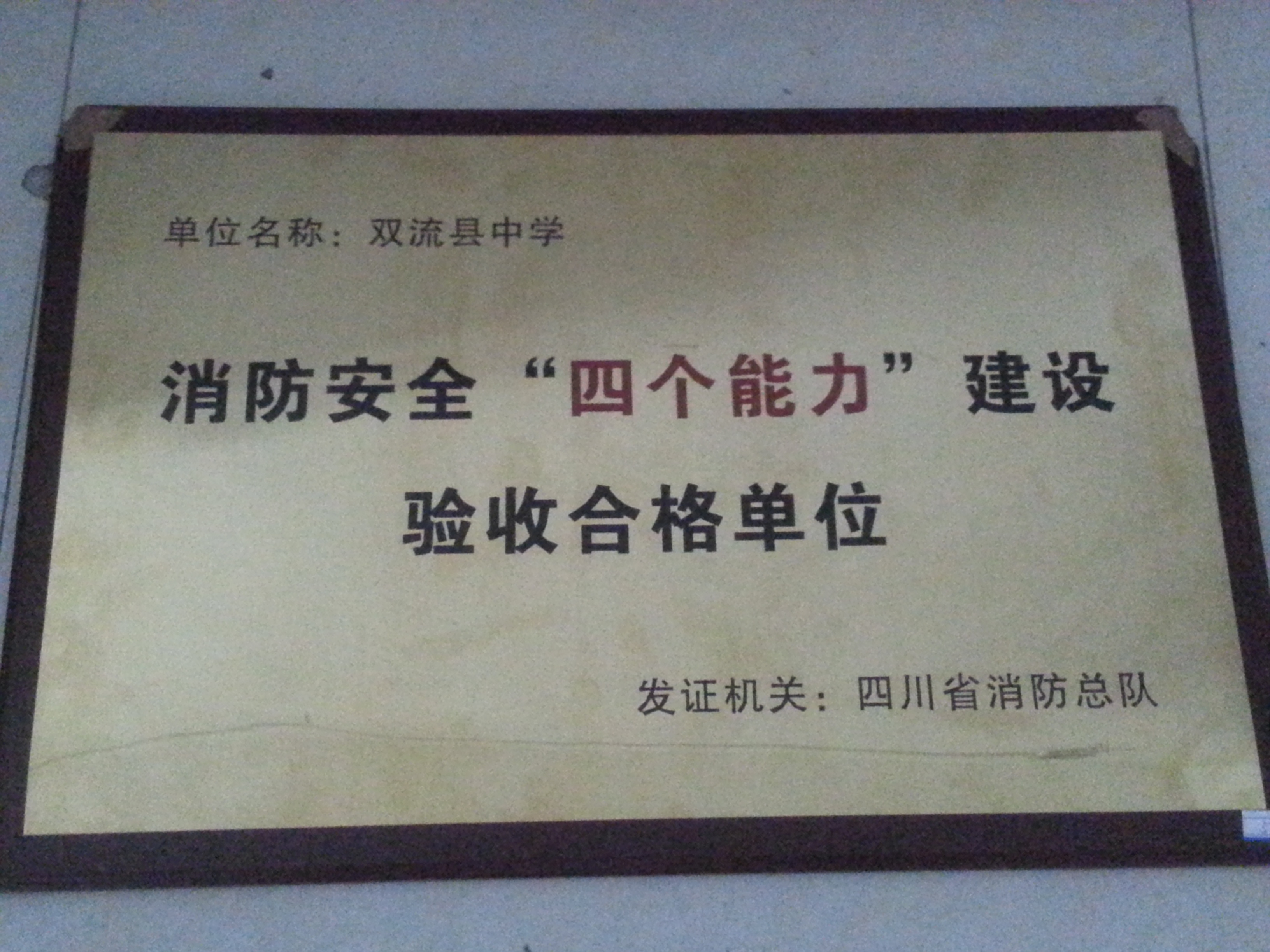 雙流中學(xué)于2013年10月獲得四川省消防中隊(duì)頒發(fā)的“消防安全四個(gè)能力建設(shè)驗(yàn)收合格單位”獎(jiǎng)牌雙流中學(xué)于2013年10月獲得四川省消防總隊(duì)頒發(fā)的“消防安全四個(gè)能力建設(shè)驗(yàn)收合格單位”獎(jiǎng)牌