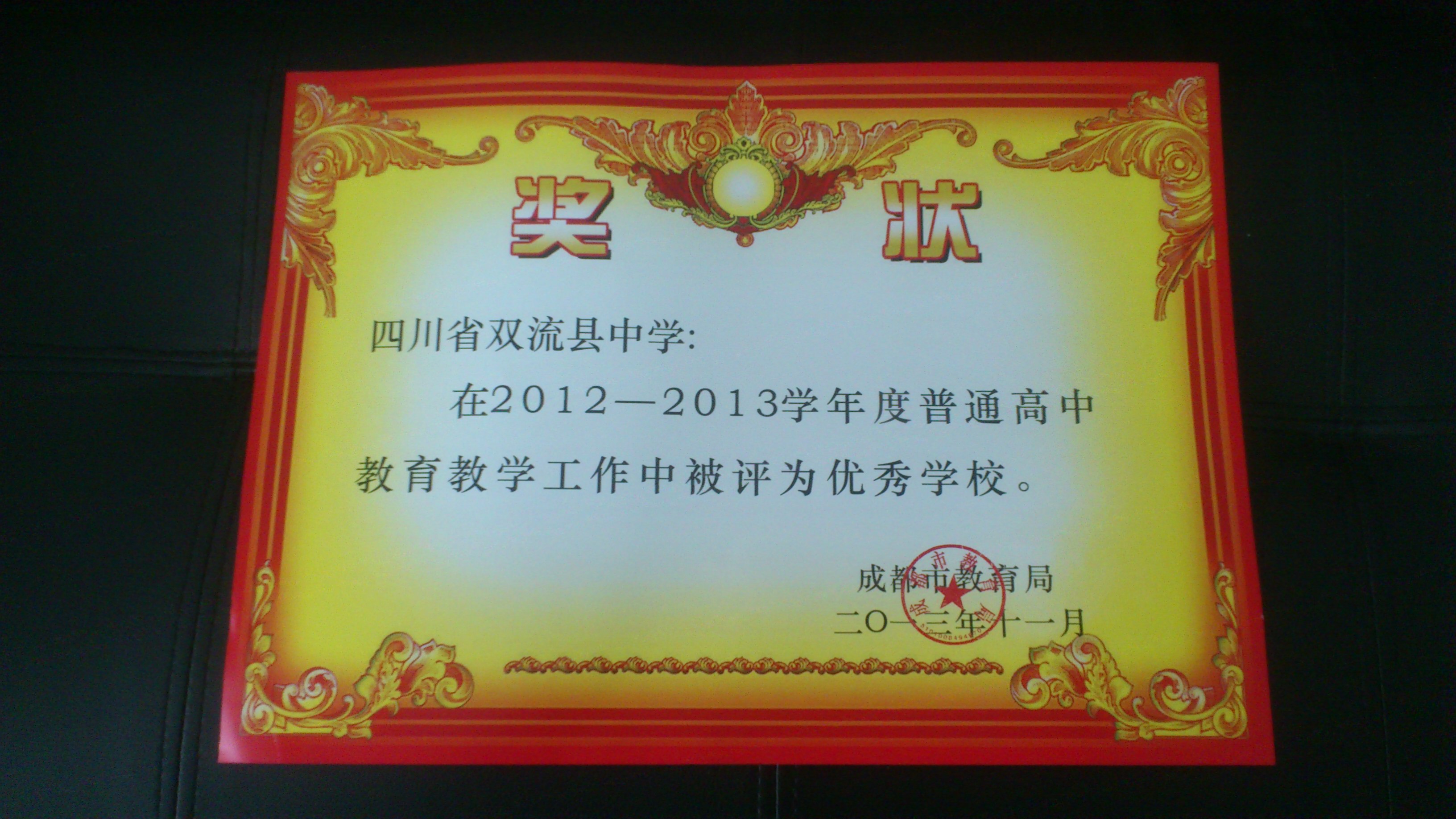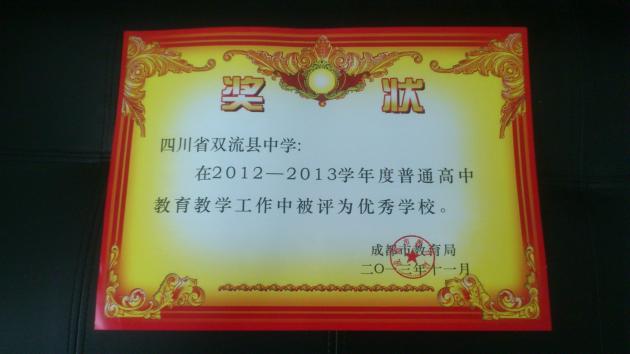 我校在2012-2013學(xué)年度普通高中教育教學(xué)中成績(jī)突出,被成都市教育局評(píng)為“優(yōu)秀學(xué)?!?,這是全校師生共同努力的結(jié)果。希望全校師生不驕不躁,再接再厲,為學(xué)校的發(fā)展做出更大的貢獻(xiàn)。