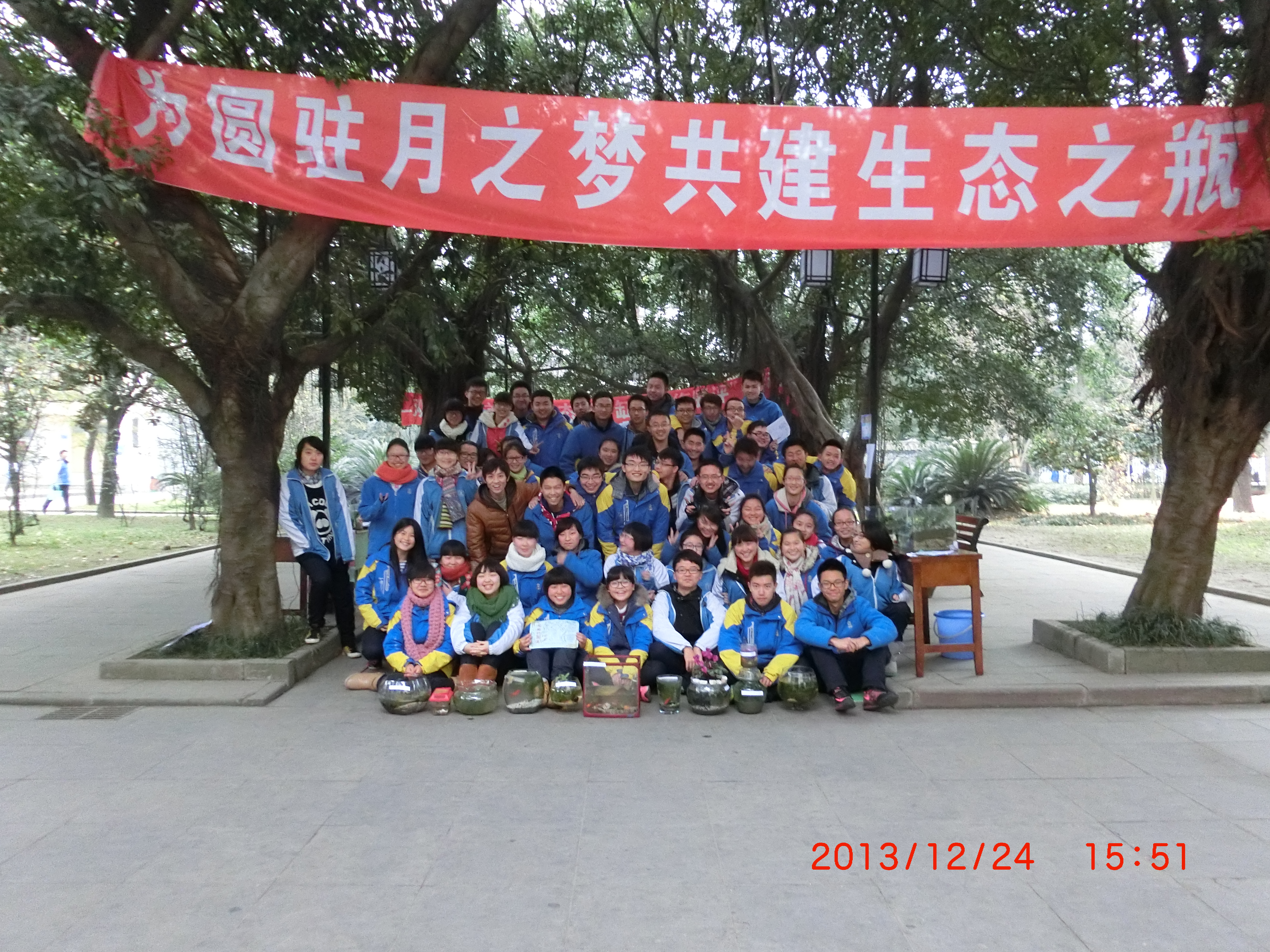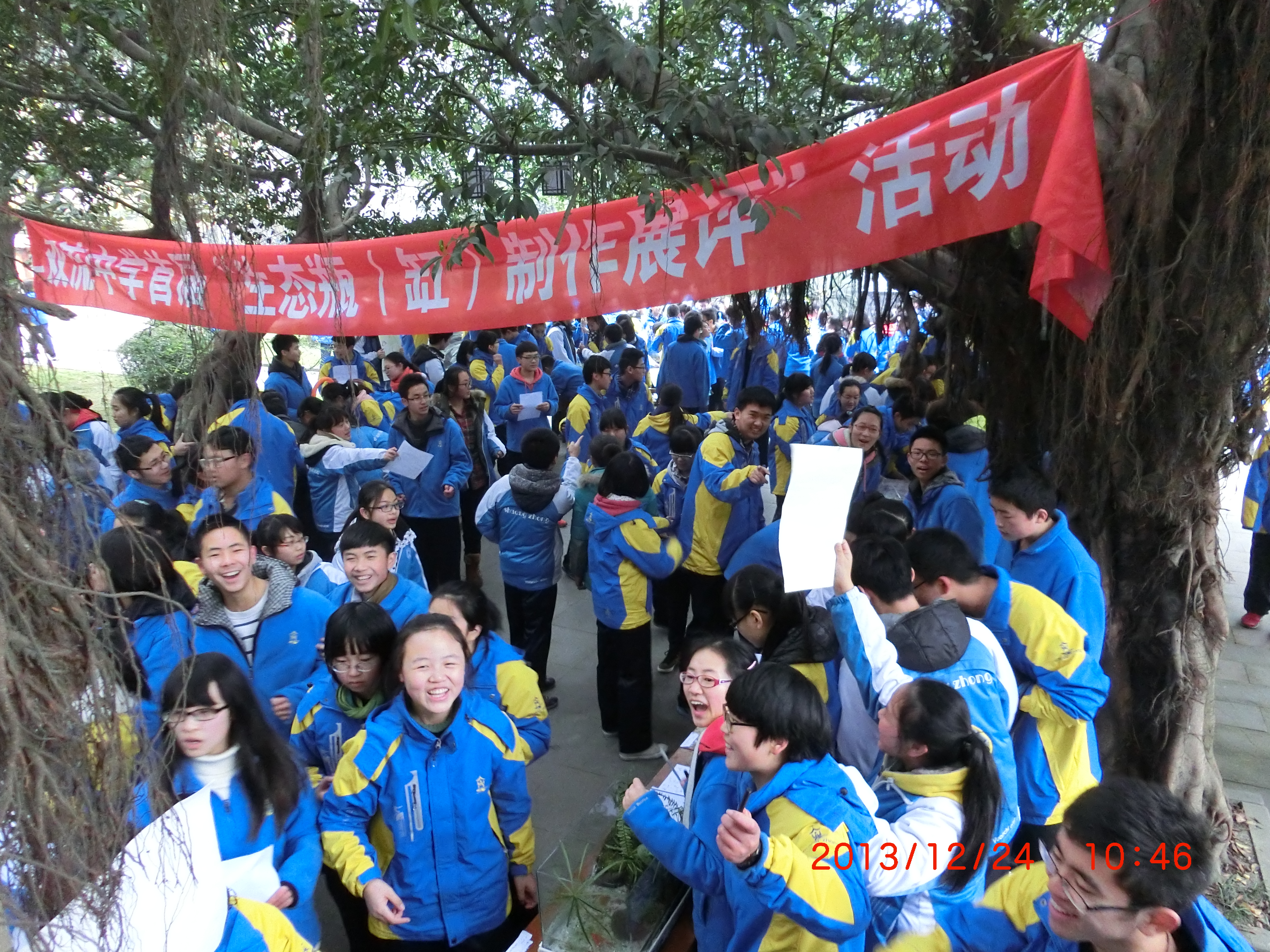 2013年12月24日,雙流中學(xué)生物教研組在高2012級學(xué)生中開展了首屆“為圓駐月之夢 共建生態(tài)之瓶”的生態(tài)瓶(缸)制作展評活動?;顒蝇F(xiàn)場人山人海,異?;鸨穗p流中學(xué)熊偉校長、黃鐘副校長等領(lǐng)導(dǎo)親臨現(xiàn)場參觀指導(dǎo)。此次活動一共展出生態(tài)瓶5個,生態(tài)缸34個。