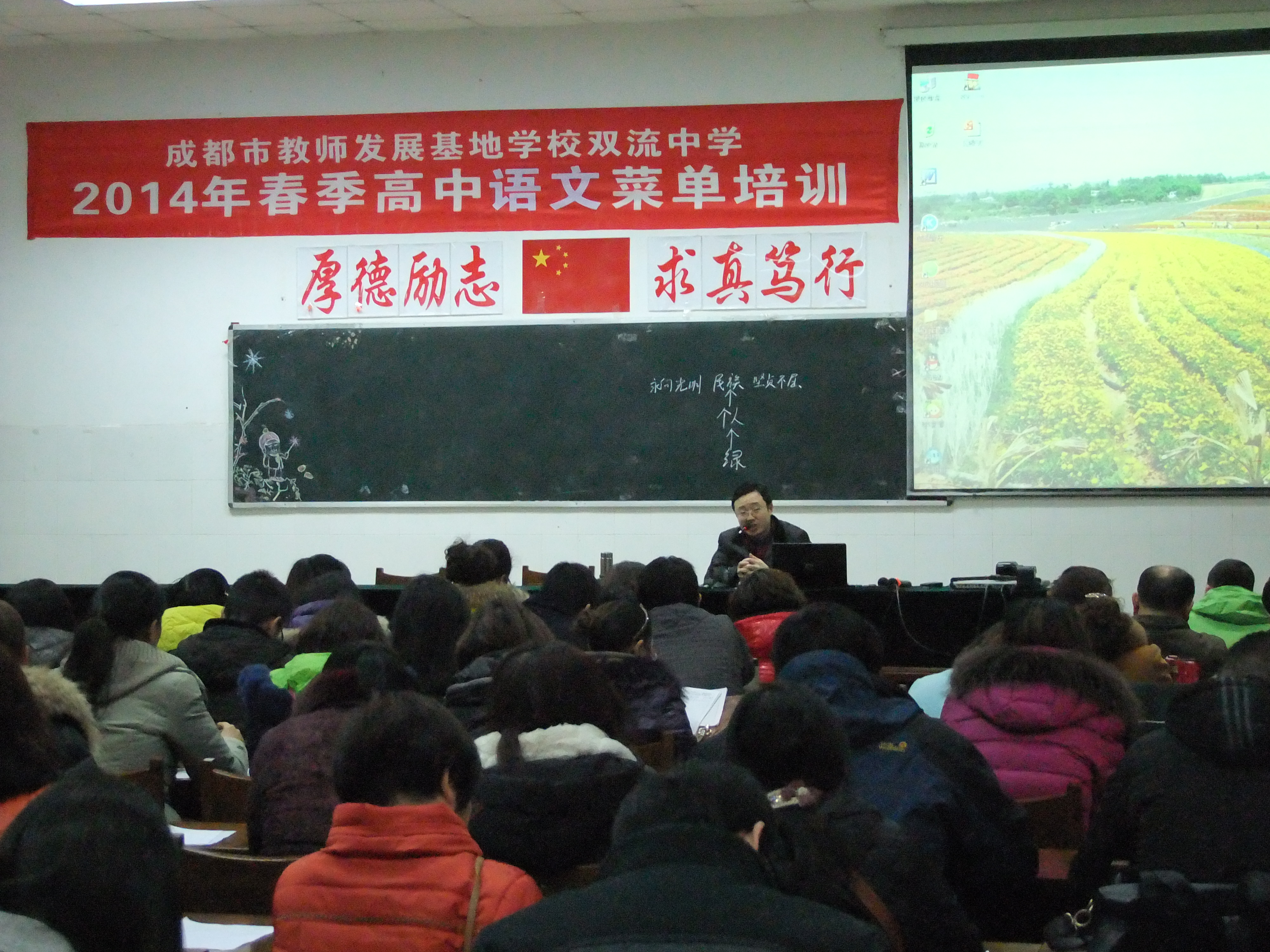 2014年3月6日,成都市春季高中語文菜單培訓(xùn)在成都市教師發(fā)展基地學(xué)校雙流中學(xué)隆重舉行。四川師范大學(xué)教師培訓(xùn)學(xué)院副院長李華平教授應(yīng)邀參加了此次培訓(xùn),雙流中學(xué)研培處王澤軍主任、語文教研組組長賀學(xué)玉老師負(fù)責(zé)組織此次培訓(xùn)。雙流中學(xué)多功能二廳座無虛席,參加此次培訓(xùn)的有來自石室天府中學(xué)、高坪中學(xué)、雙流中學(xué)教育集團校永安中學(xué)、青白江中學(xué)、安仁中學(xué)、北大附中、香城中學(xué)、雙流藝體中學(xué)、建校以及雙流縣中學(xué)的老師。