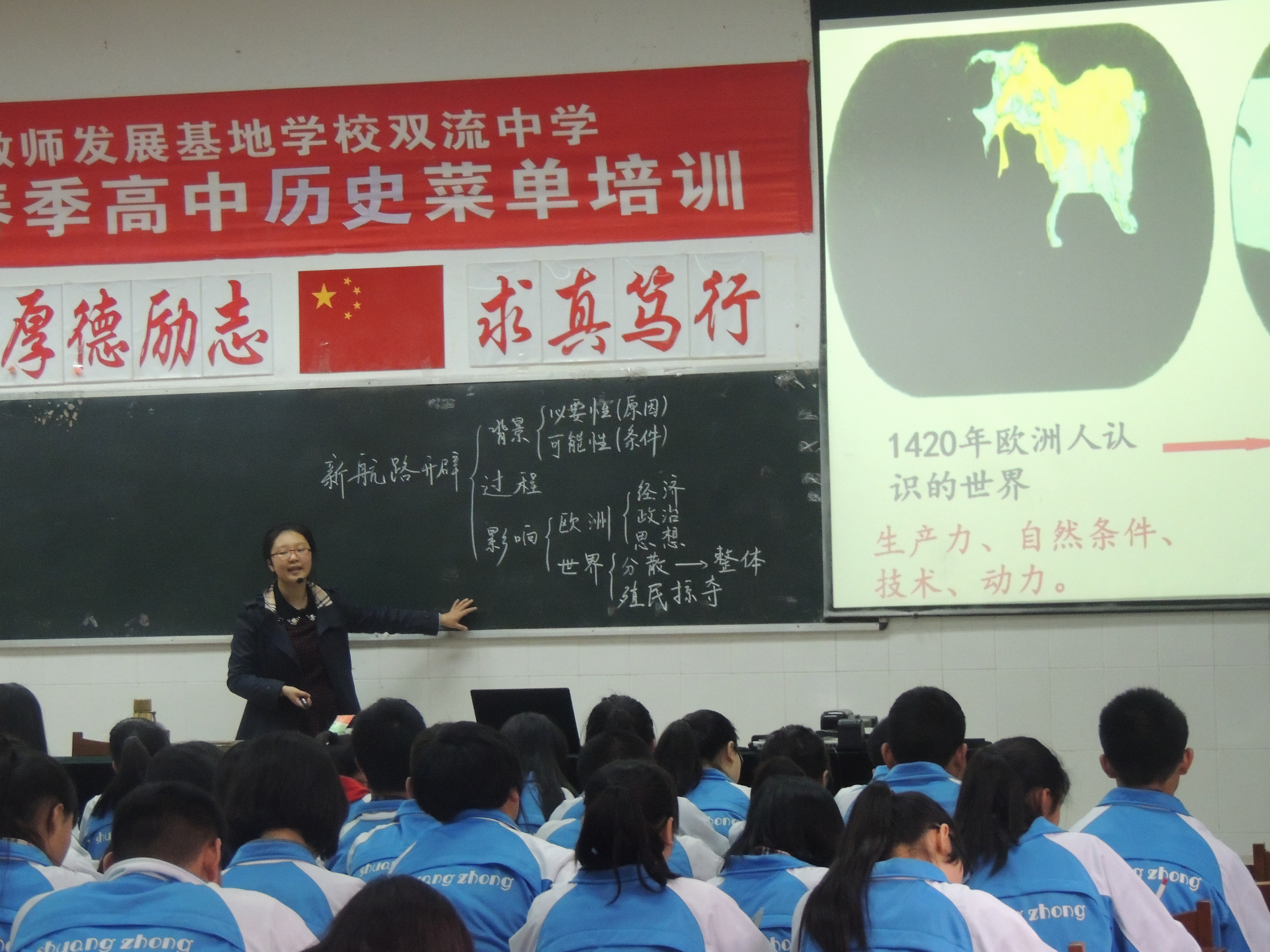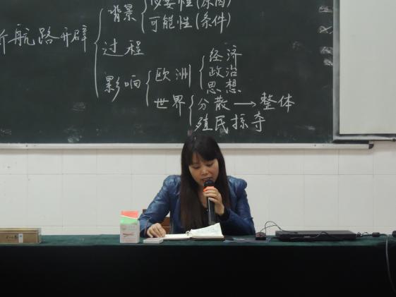 活動(dòng)由四川省特級(jí)教師、雙中歷史教研組長(zhǎng)胡克芹主持。首先由雙中青年教師陸雨薇上觀摩課《開(kāi)辟文明交往的新航線》。陸老師以文明史觀和整體史觀來(lái)統(tǒng)領(lǐng)本課的設(shè)計(jì),高屋建瓴,引入大量圖片文字材料,設(shè)計(jì)了一系列具有啟發(fā)性的思考題,引導(dǎo)學(xué)生進(jìn)行探究、合作、展示學(xué)習(xí),充分體現(xiàn)了雙中“二元導(dǎo)學(xué)”課堂教學(xué)模式的特色。課后,雙中高二歷史備課組組長(zhǎng)甘文麗老師對(duì)該課進(jìn)行了簡(jiǎn)要、中肯的點(diǎn)評(píng)。