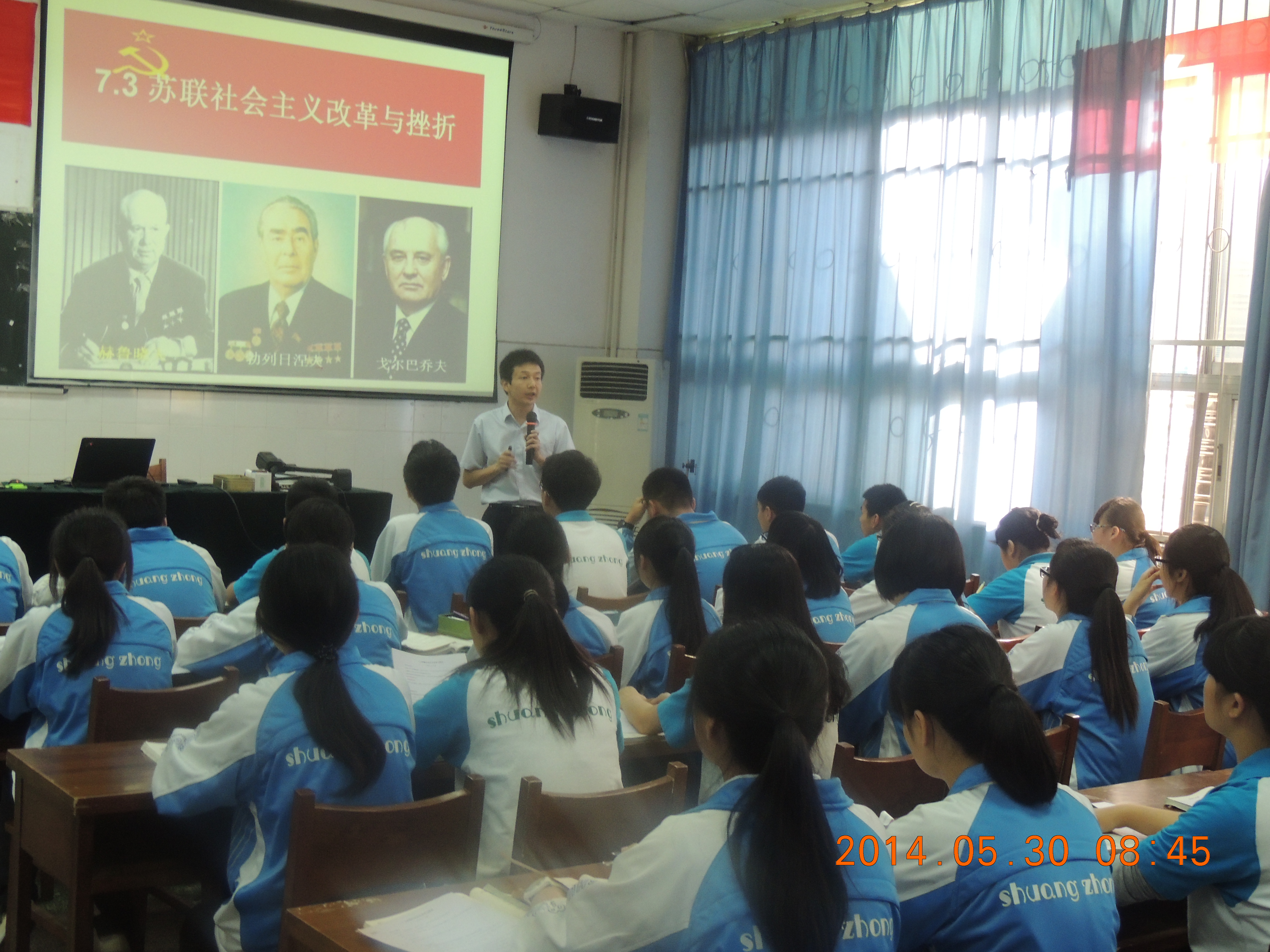 雙中青年教師鄭鵬為大家?guī)砹祟}為《蘇聯(lián)社會(huì)主義改革與挫折》的研究課。鄭鵬老師特意編寫了一份學(xué)案供學(xué)生課前預(yù)習(xí),課堂上對預(yù)習(xí)情況進(jìn)行檢查,為探究式學(xué)習(xí)作好了鋪墊。他精心設(shè)計(jì)了系列思考題,準(zhǔn)備了多元、多面的歷史材料,組織學(xué)生進(jìn)行探究活動(dòng),將學(xué)生個(gè)體學(xué)習(xí)和小組學(xué)習(xí)結(jié)合起來,學(xué)生的思維被充分調(diào)動(dòng)起來,在討論中大膽地發(fā)表了中肯的、有自己見解的意見。這節(jié)課既重視基礎(chǔ)知識的過手,更強(qiáng)調(diào)思維能力的培養(yǎng)。他引導(dǎo)學(xué)生多角度比較赫魯曉夫、勃列日涅夫、戈?duì)柊蛦谭蚋母锏漠愅?,比較中國改革和蘇聯(lián)改革一成一敗的原因,是培養(yǎng)學(xué)生求同思維和求異思維的成功嘗試。雙中高級教師、高三備課組長楊選洲老師對這節(jié)課進(jìn)行了評點(diǎn),他充分肯定了這節(jié)課的合理設(shè)計(jì)和正確的教材處理,也指出了在討論結(jié)果呈現(xiàn)方式上值得改進(jìn)的問題。