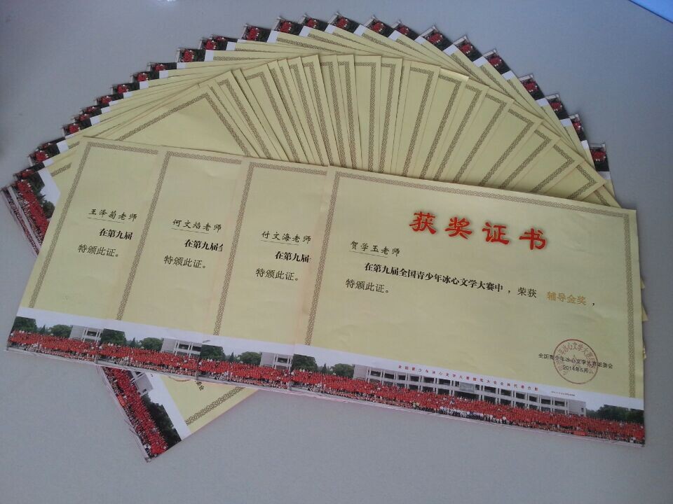 近日,“第九屆全國(guó)青少年冰心文學(xué)大賽”的評(píng)選結(jié)果已經(jīng)揭曉,我校學(xué)生繼2013年第八屆大賽之后再創(chuàng)佳績(jī),獲獎(jiǎng)數(shù)量成為歷屆之最。在第九屆大賽中,我校語(yǔ)文教研組和春芽文學(xué)社選送的1585篇作品有454篇從全國(guó)30余萬(wàn)件作品中脫穎而出,喜獲大獎(jiǎng)。其中金獎(jiǎng)92個(gè),銀獎(jiǎng)182個(gè),銅獎(jiǎng)170個(gè),我校被授予“全國(guó)教書(shū)育人先進(jìn)學(xué)?!狈Q(chēng)號(hào),獲獎(jiǎng)?wù)弑谎?月17~20日赴清華大學(xué)參加現(xiàn)場(chǎng)頒獎(jiǎng)典禮及夏令營(yíng)活動(dòng)。參加本次作文大賽,我校語(yǔ)文組的老師們付出了艱辛的勞動(dòng)。本學(xué)期開(kāi)始,全體語(yǔ)文教師就認(rèn)真組織學(xué)生寫(xiě)作參賽作文,并悉心指導(dǎo)學(xué)生修改作品,歷經(jīng)兩個(gè)月的反復(fù)打磨,才上交了滿意的作品。功夫不負(fù)有心人,兢兢業(yè)業(yè)的師生們最終收獲了成功與快樂(lè)!我們?cè)诖讼蛉熒伴L(zhǎng)期以來(lái)關(guān)心雙流中學(xué)發(fā)展的各界人士報(bào)喜,并向獲獎(jiǎng)同學(xué)及其指導(dǎo)教師表示熱烈祝賀!