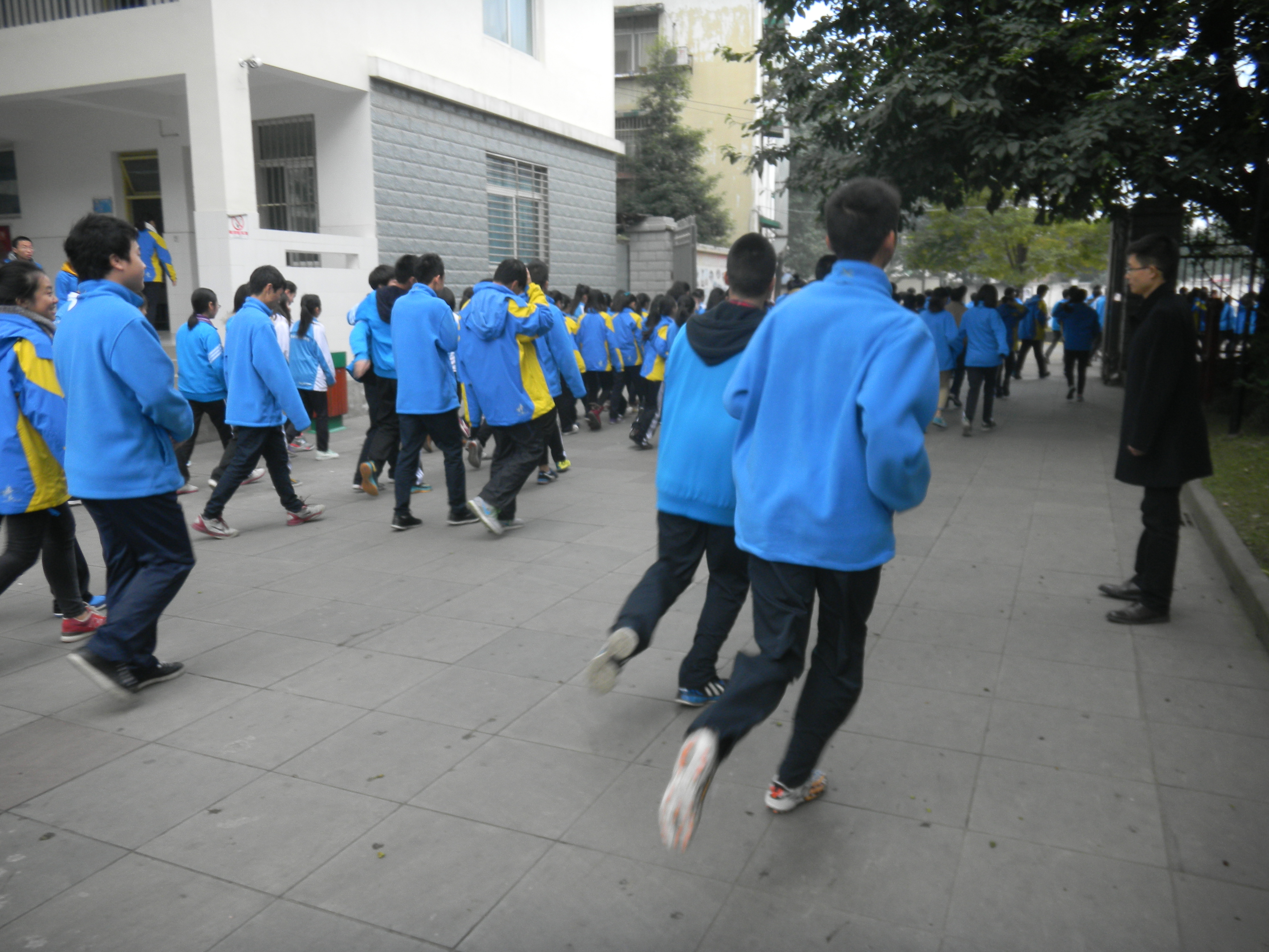 上午十點十五分,演練正式開始。各班級學生在任課教師及行政領導的疏導下,迅速有秩序地撤離了教學樓。均到達了安全地帶。