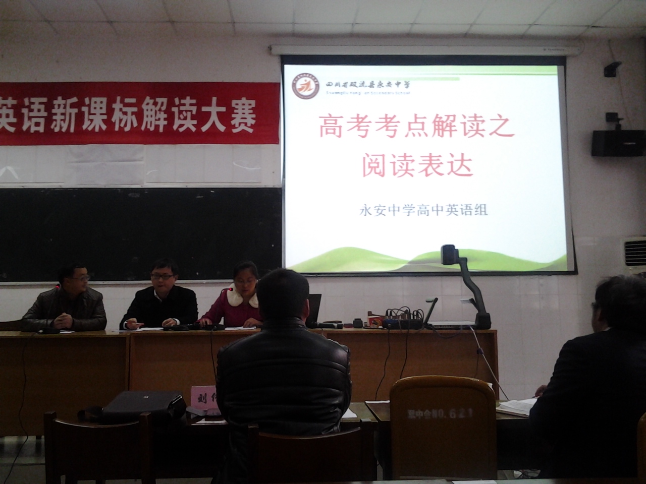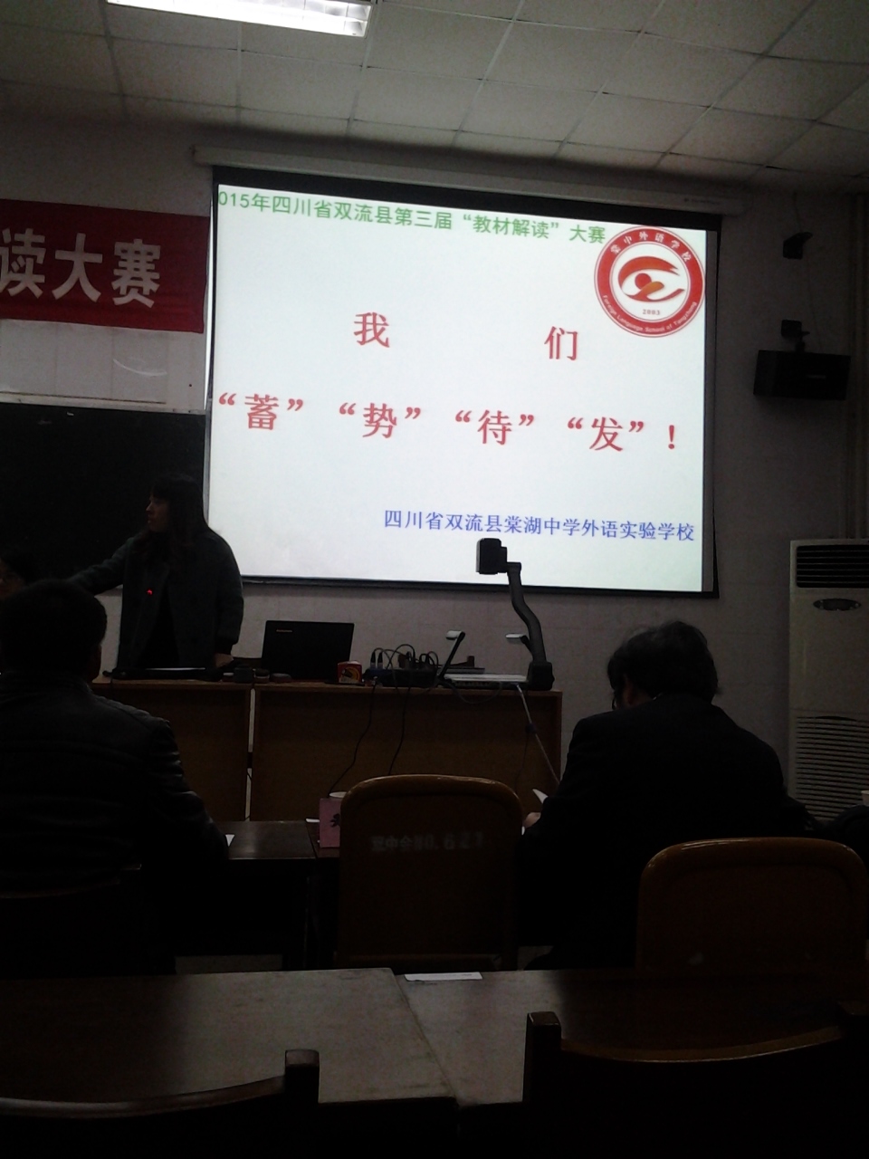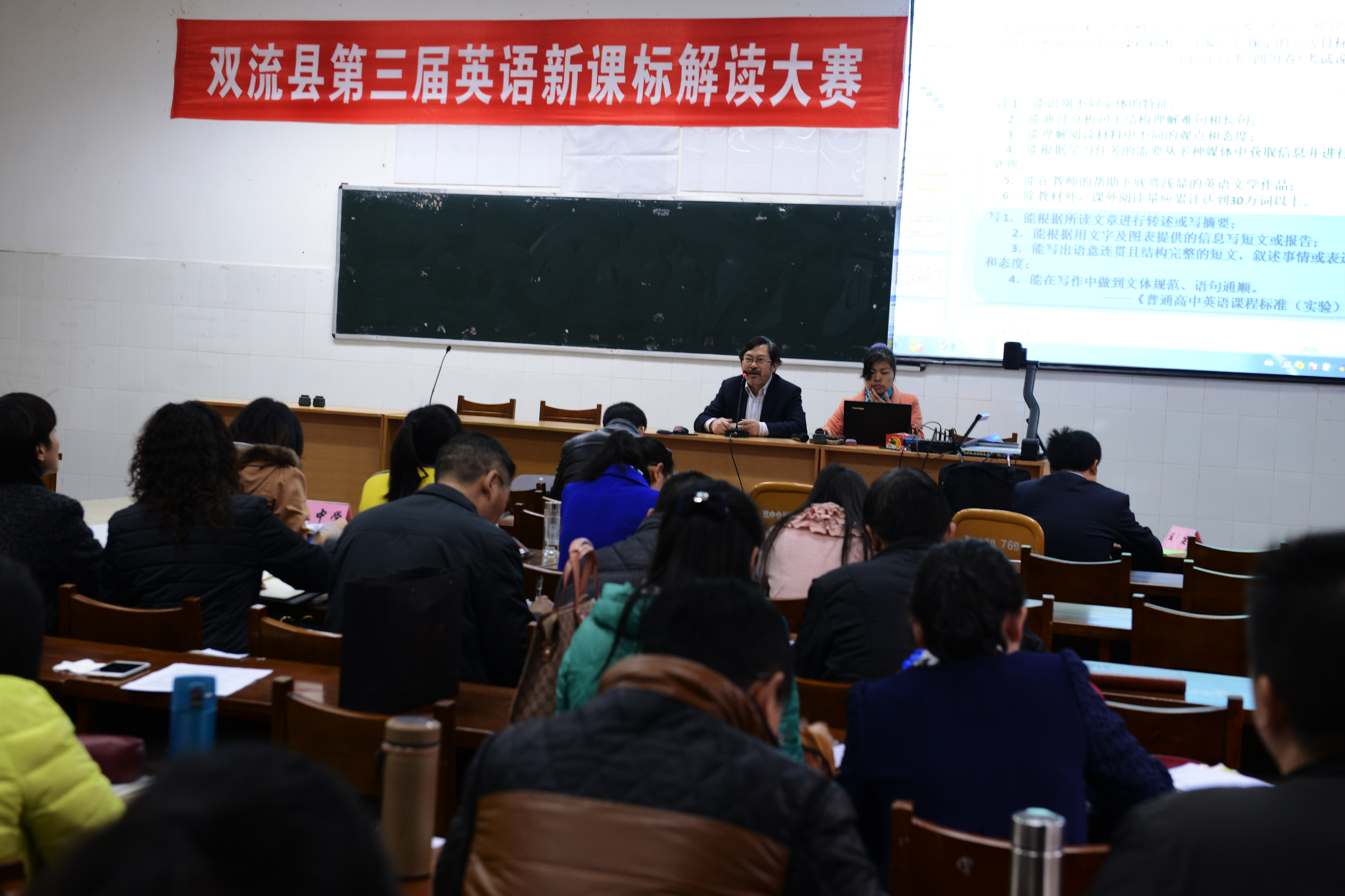 2015年3月9日星期一雙流縣第三屆高三英語新課標解讀大賽在雙流中學(xué)舉行。本次解讀大賽由雙流中學(xué)鄧兆昂老師主持,參賽的學(xué)校有棠湖中學(xué)外語實驗學(xué)校,棠湖中學(xué),藝體中學(xué),永安中學(xué)和雙流中學(xué)。