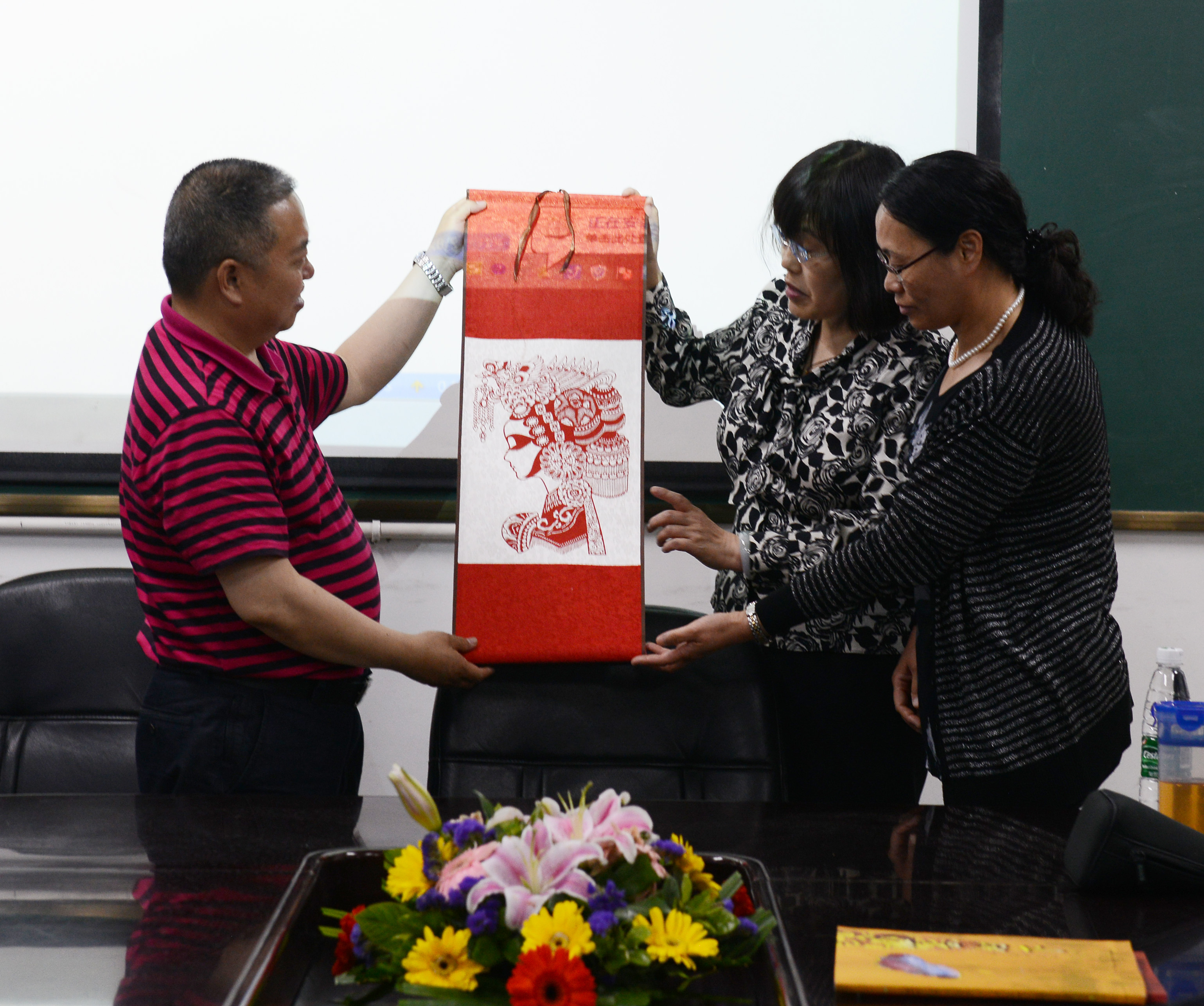 最后,參訪團(tuán)向熊偉校長(zhǎng)贈(zèng)送了一幅天津名家的剪紙,并邀請(qǐng)雙中老師去天津教師進(jìn)修校交流。