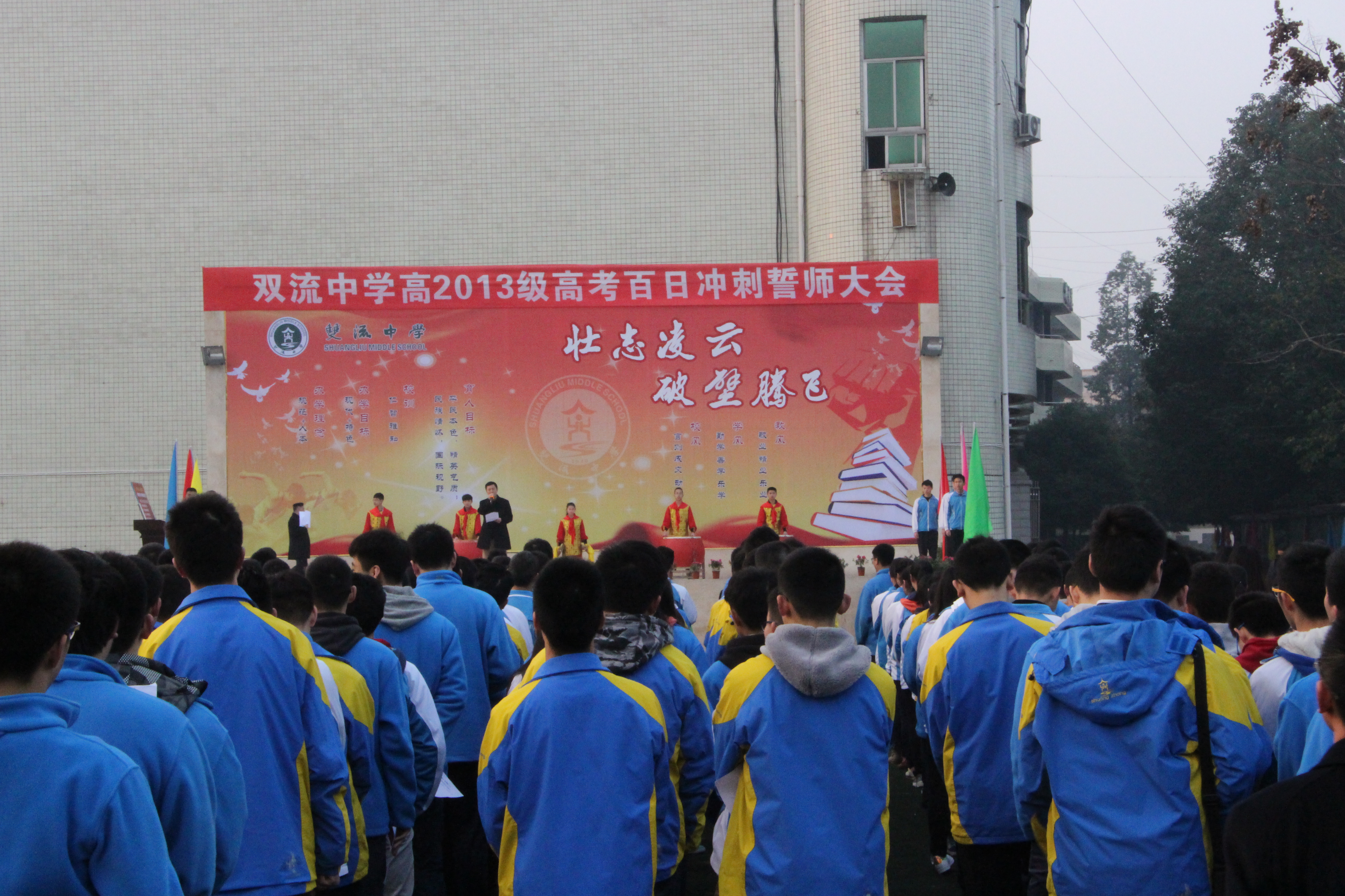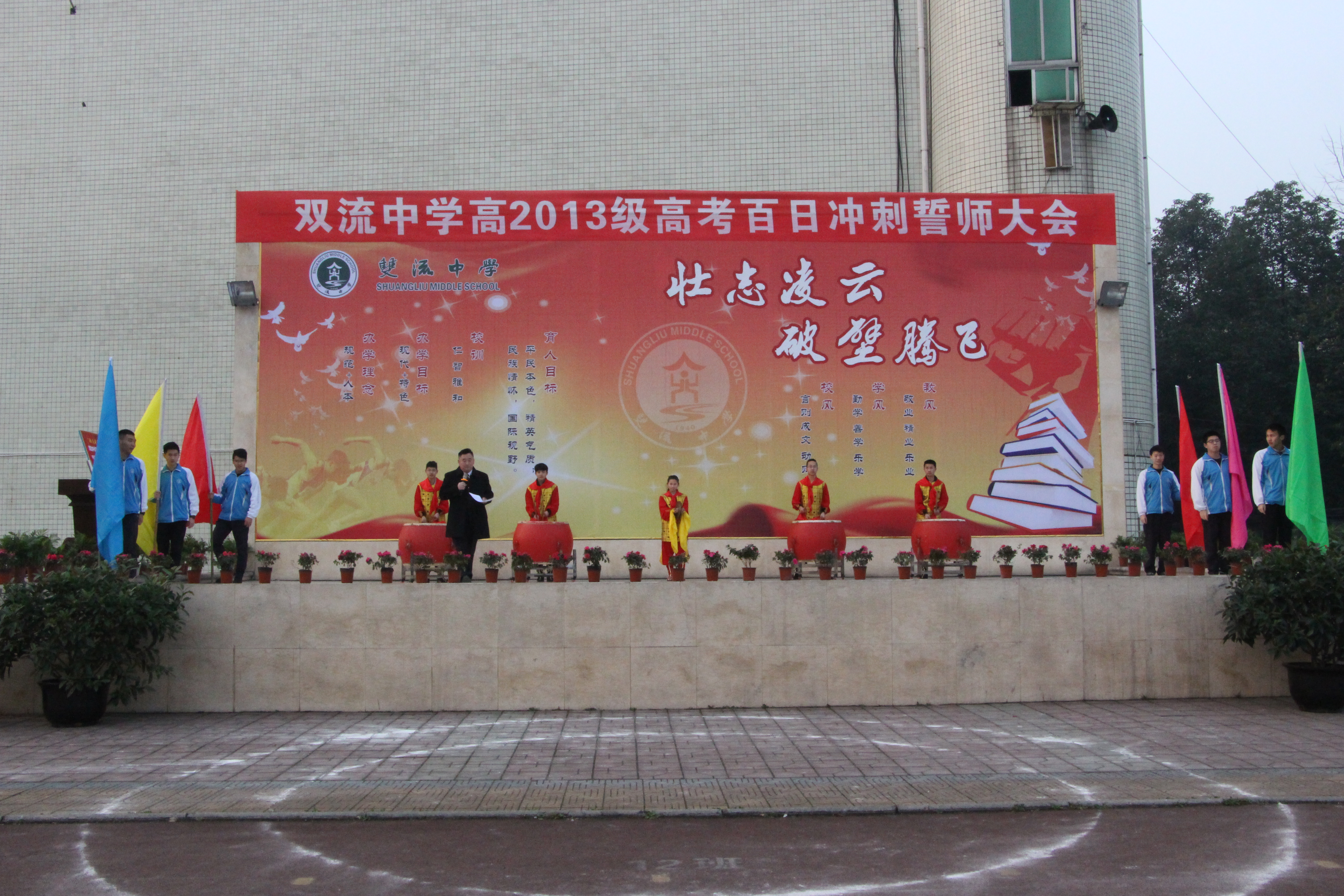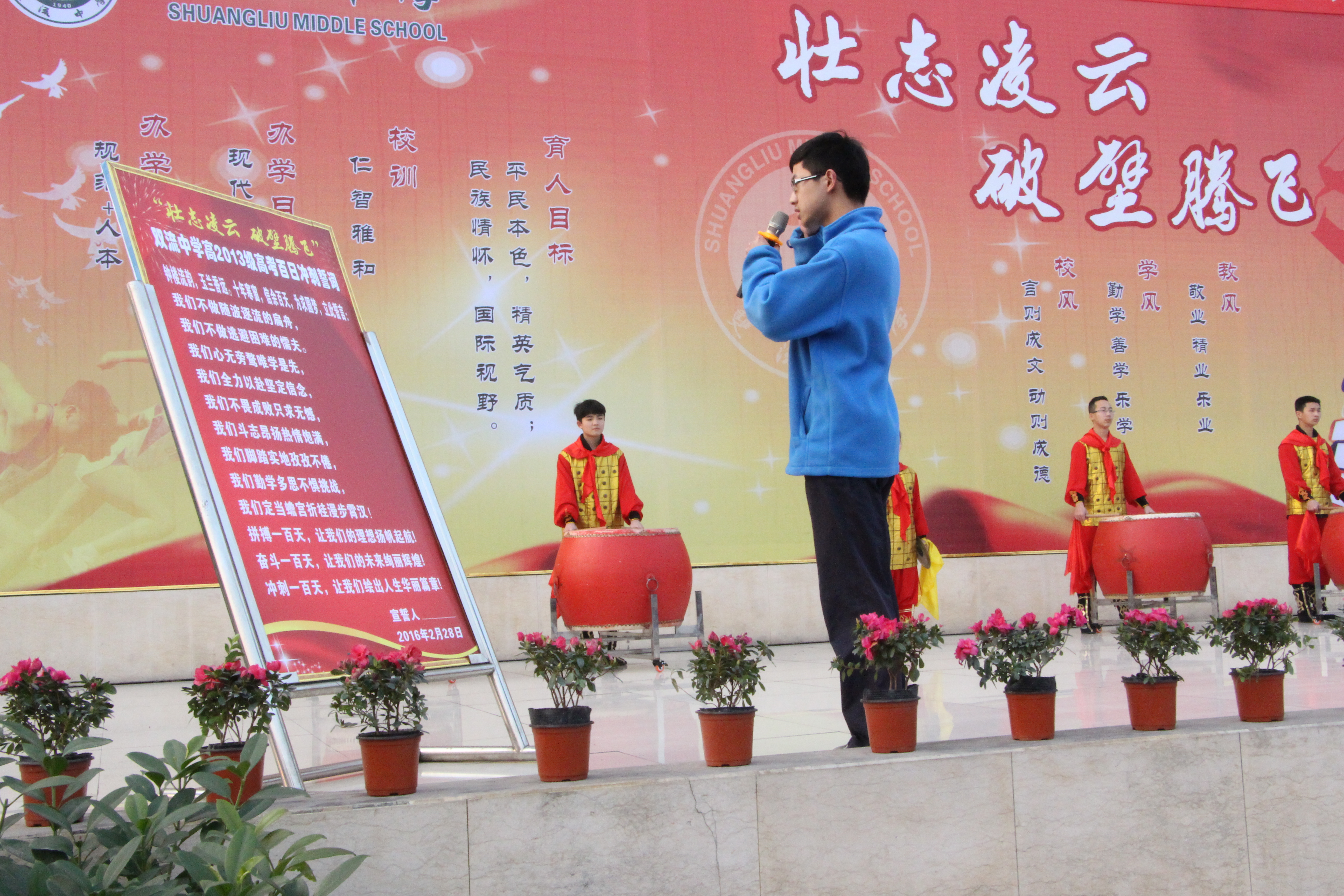 鼓聲陣陣,催人奮進;旌旗招展,勇往直前。2016年2月28日晨,旭日東升,在隆隆的鑼鼓聲中,在莊嚴的國歌聲中,雙流中學運動場上的五星紅旗冉冉升起。雙流中學全體行政領導及高三師生齊聚于此,舉行了盛大隆重的“壯志凌云,破壁騰飛”高考百日沖刺誓師大會。