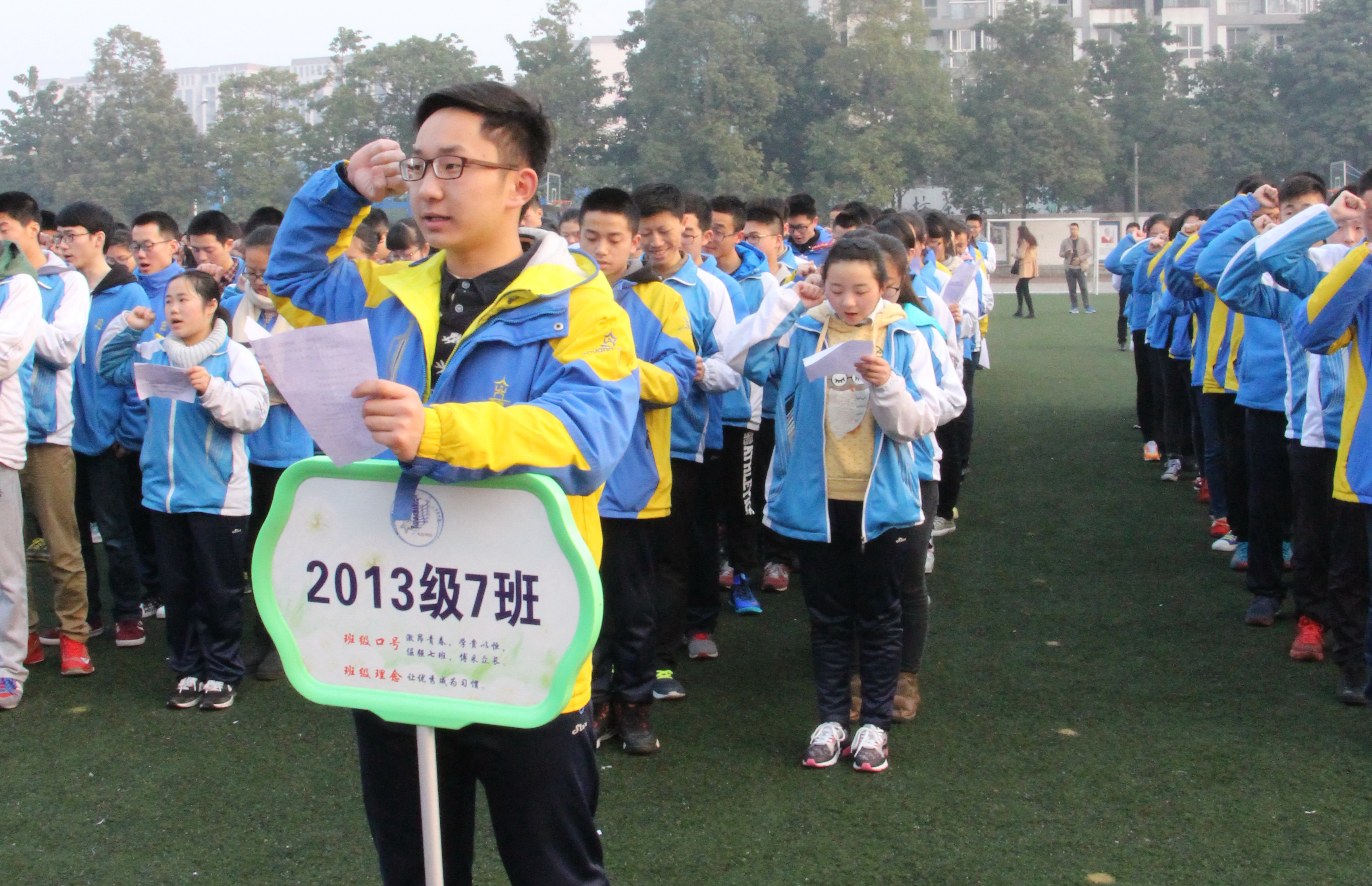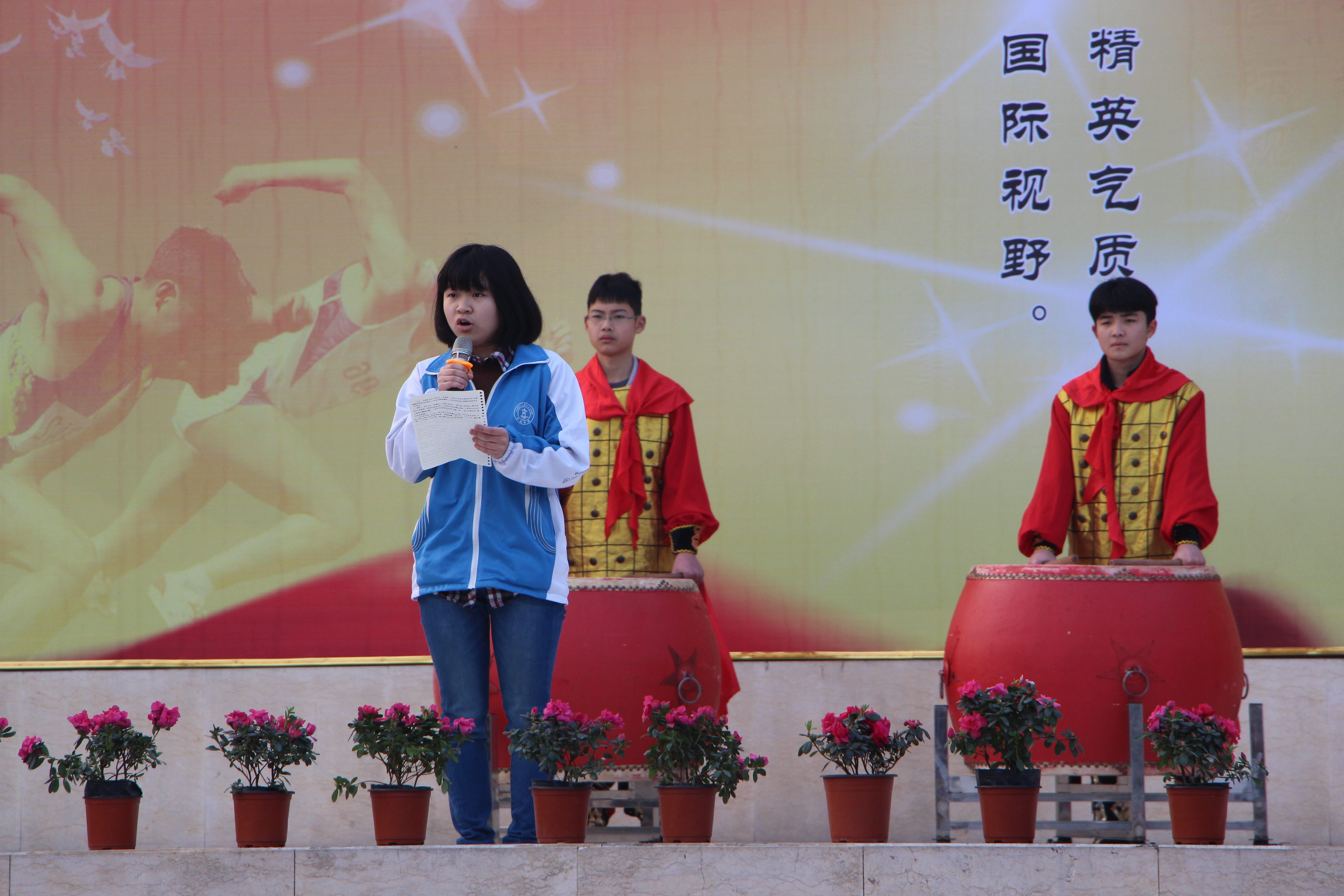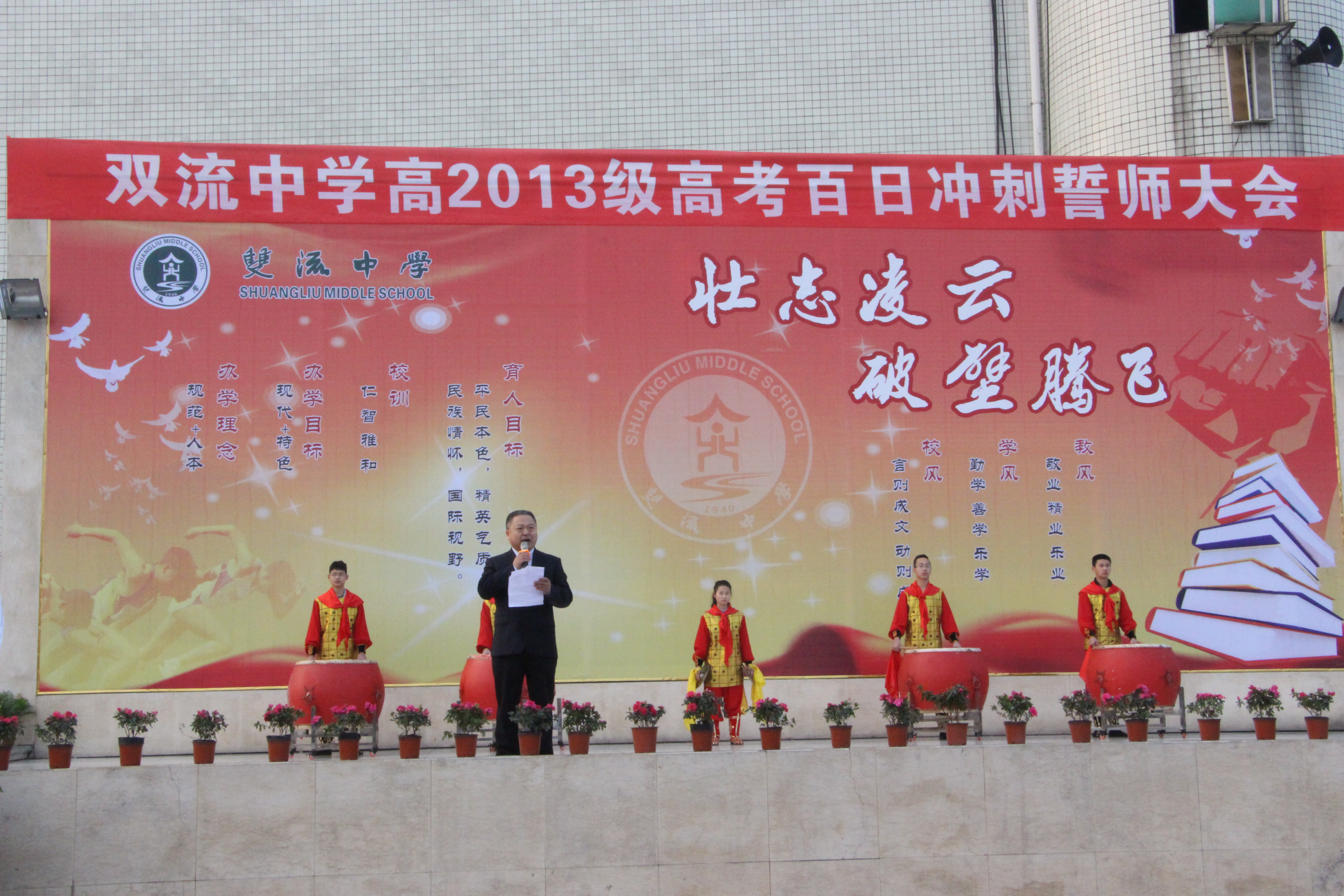 鼓聲陣陣,催人奮進;旌旗招展,勇往直前。2016年2月28日晨,旭日東升,在隆隆的鑼鼓聲中,在莊嚴的國歌聲中,雙流中學運動場上的五星紅旗冉冉升起。雙流中學全體行政領導及高三師生齊聚于此,舉行了盛大隆重的“壯志凌云,破壁騰飛”高考百日沖刺誓師大會。
