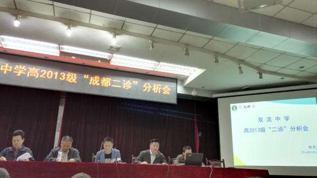 2015年4月5日下午,雙流中學(xué)召開了2013級成都市二診分析會。參加會議的人員除高三全體教師外,教育局督導(dǎo)室、教育科的相關(guān)領(lǐng)導(dǎo),雙中全體行政干部,以及各教研組長也參加了會議。會議由年級組長毛有裕主持。
