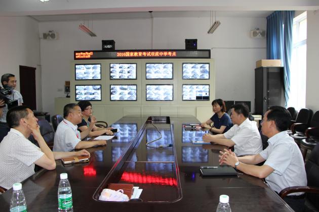 相關(guān)領(lǐng)導認真聽取了雙流中學考點主考、雙流中學黨組書記、校長熊偉關(guān)于備考工作的詳細匯報,實地查看了學校廣播室、考場、監(jiān)控室和考務室,檢查了相關(guān)設施配備等情況。在詳細了解各項準備工作、人員安排及保密措施等情況后,視察領(lǐng)導對雙流中學考點的備考工作給予了充分的肯定,并要求全體考務人員要貫徹落實教育部關(guān)于高考考試工作人員職業(yè)道德、警示案例、法律法規(guī)、操作規(guī)程等相關(guān)考務管理規(guī)定,強調(diào)各相關(guān)部門一定要高度重視高考工作,通力配合,提高服務水平,給考生營造一個良好的考試環(huán)境;要嚴肅考風考紀,加強監(jiān)督檢查,嚴防違紀舞弊事件的發(fā)生,確保高考安全、公平、公正進行。同時,也對雙流中學的工作提出了更高要求,一年一度的高考將決定眾多考生的命運,各部門在工作中要注重細節(jié),周密安排,事先做好各種突發(fā)情況應急方案,要及時進行信息溝通,切實加強協(xié)調(diào)配合,認真做好服務考生的各項工作,凝心聚力為高考護航!