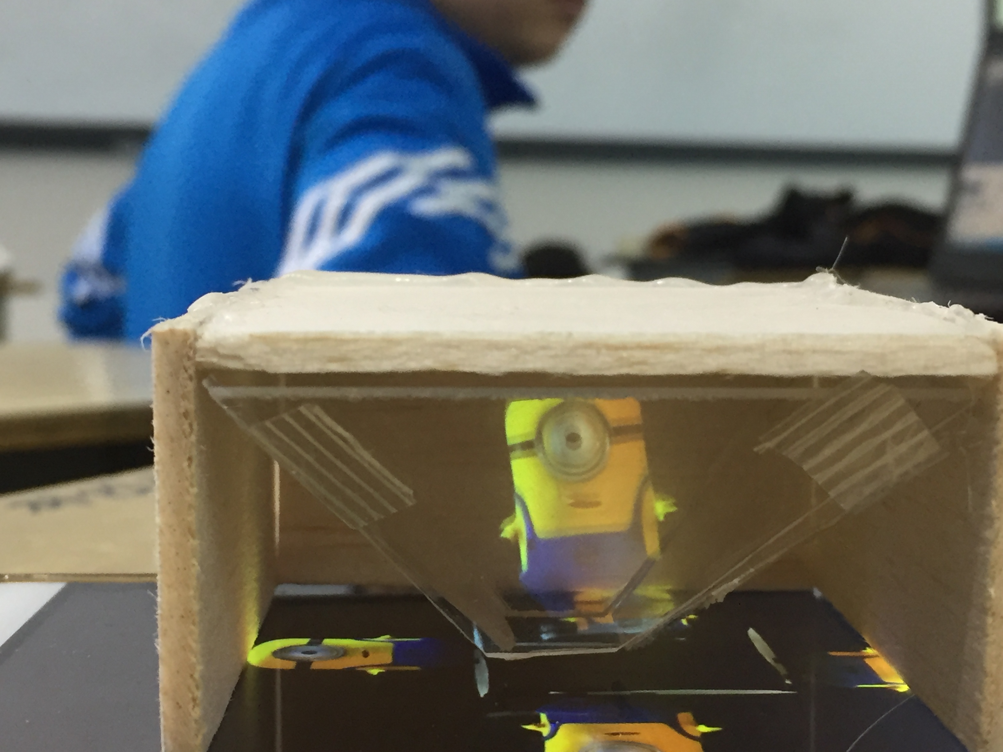 本次展出的幾十件展品全部由學生獨立制作完成,凝聚了同學們的汗水與激情。這些展品一方面體現(xiàn)了科學的魅力,一方面展示了技術(shù)的力量。由蔣韻和湯瑞昕合作完成的電腦游戲“超音蝠戰(zhàn)士”引來了不少同學前來體驗,簡單的操作,有趣的環(huán)節(jié)設(shè)置讓同學們紛紛為他們的作品“點贊”。余潤東和王周超制作的3D全息投影裝置讓圍觀人群嘖嘖稱奇,利用有機玻璃對光的衍射與干涉,簡單的裝置為我們帶來了非凡的視覺體驗。有趣的作品還有很多,件件作品都讓人愛不釋手??萍忌绲耐瑢W更是戰(zhàn)斗力爆棚,幾個小時不斷地耐心為往來參觀的家長、老師、同學演示和解釋。