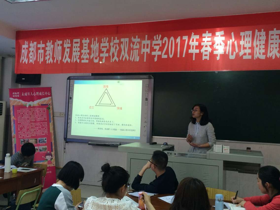 2017年4月14日,成都市教師發(fā)展基地雙流中學(xué)2017年春季心理健康教育第二次菜單培訓(xùn)在雙流中學(xué)科技樓三樓錄課室舉行。來自雙流區(qū)及周邊區(qū)縣的近40位中小學(xué)專兼職教師參與了此次培訓(xùn)。雙流區(qū)教師發(fā)展中心心理健康教研員陳麗老師主持了此次活動(dòng)。