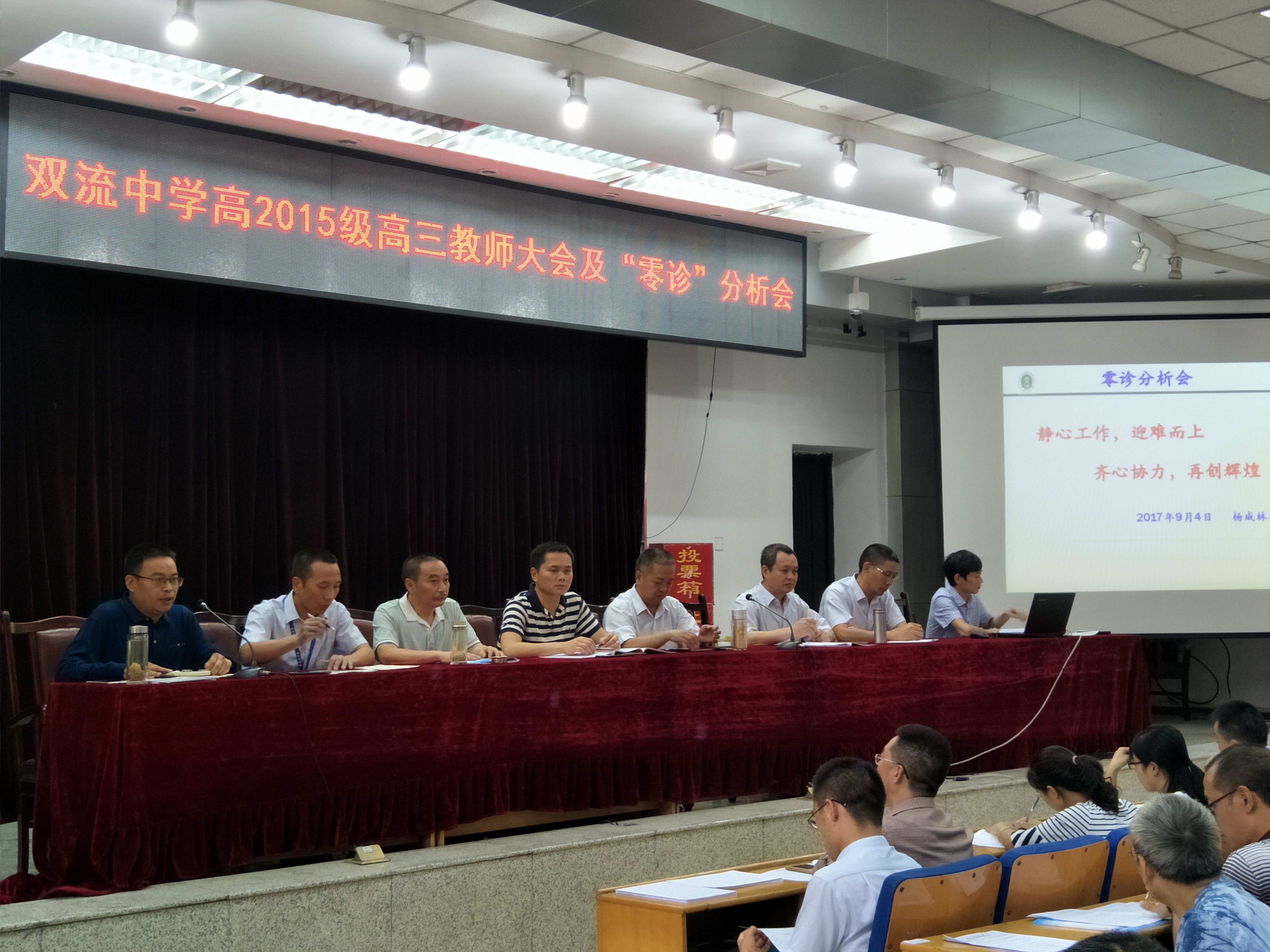 2017年9月4日下午,四川省雙流中學2015級教師大會暨“零診”分析會在雙流中學學術廳隆重舉行。雙流中學黨總支書記、校長熊偉,副校長黃鐘、徐天福,黨總支副書記、工會主席向發(fā)友,學生處主任楊成林,安全衛(wèi)生處副主任仇朝海,高三年級組長龔長江,高三年級全體教職工參加了此次大會。