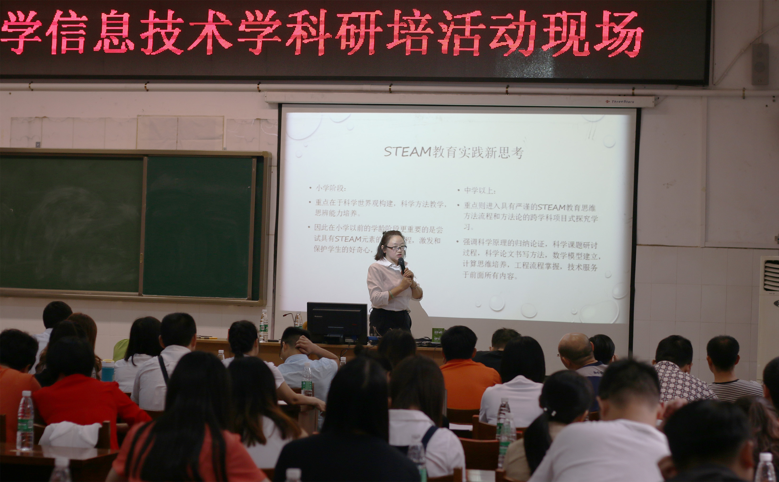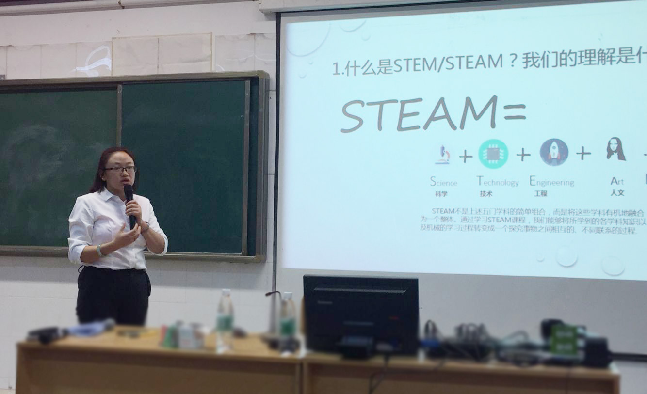 首先是雙流中學陳覓老師為大家?guī)砹酥黝}為“STEAM教育的實踐與再思考”交流與分享。她從雙流中學STEAM實踐過程和和對STEAM教育的思考兩方面作了交流。陳老師深入的思考、精辟的闡述引發(fā)了在座老師的共鳴。