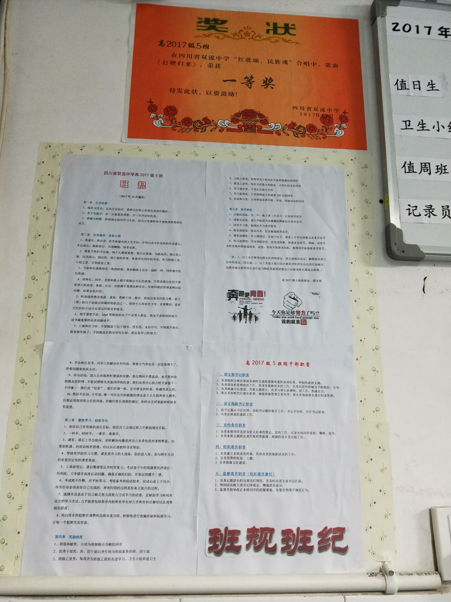 為營造和諧團結(jié)、積極向上的班級文化氛圍,2017年1029日,雙流中學2017級舉行了班級文化建設評比活動。此次活動除了評出一、三等級,還評出了最文藝教室獎、最勵志教室獎、最個性教室獎、最整潔教室獎四個特色獎項。