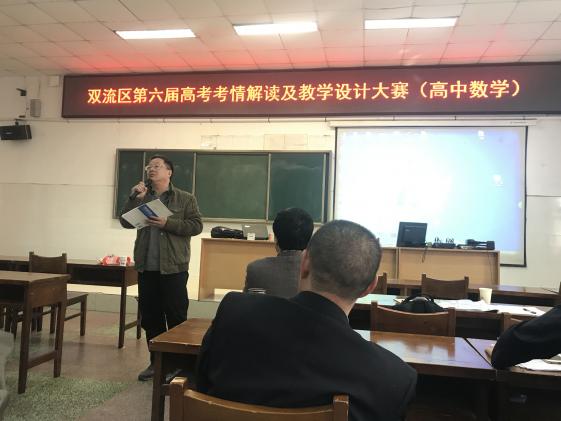 2017年10月28日,成都市雙流區(qū)第六屆高三數(shù)學(xué)高考考情解讀暨教學(xué)設(shè)計大賽在雙流中學(xué)舉行。雙流區(qū)高中數(shù)學(xué)教研員文成林主持競賽活動,區(qū)內(nèi)五所高完中的高三數(shù)學(xué)教師以備課組為單位參加了競賽。