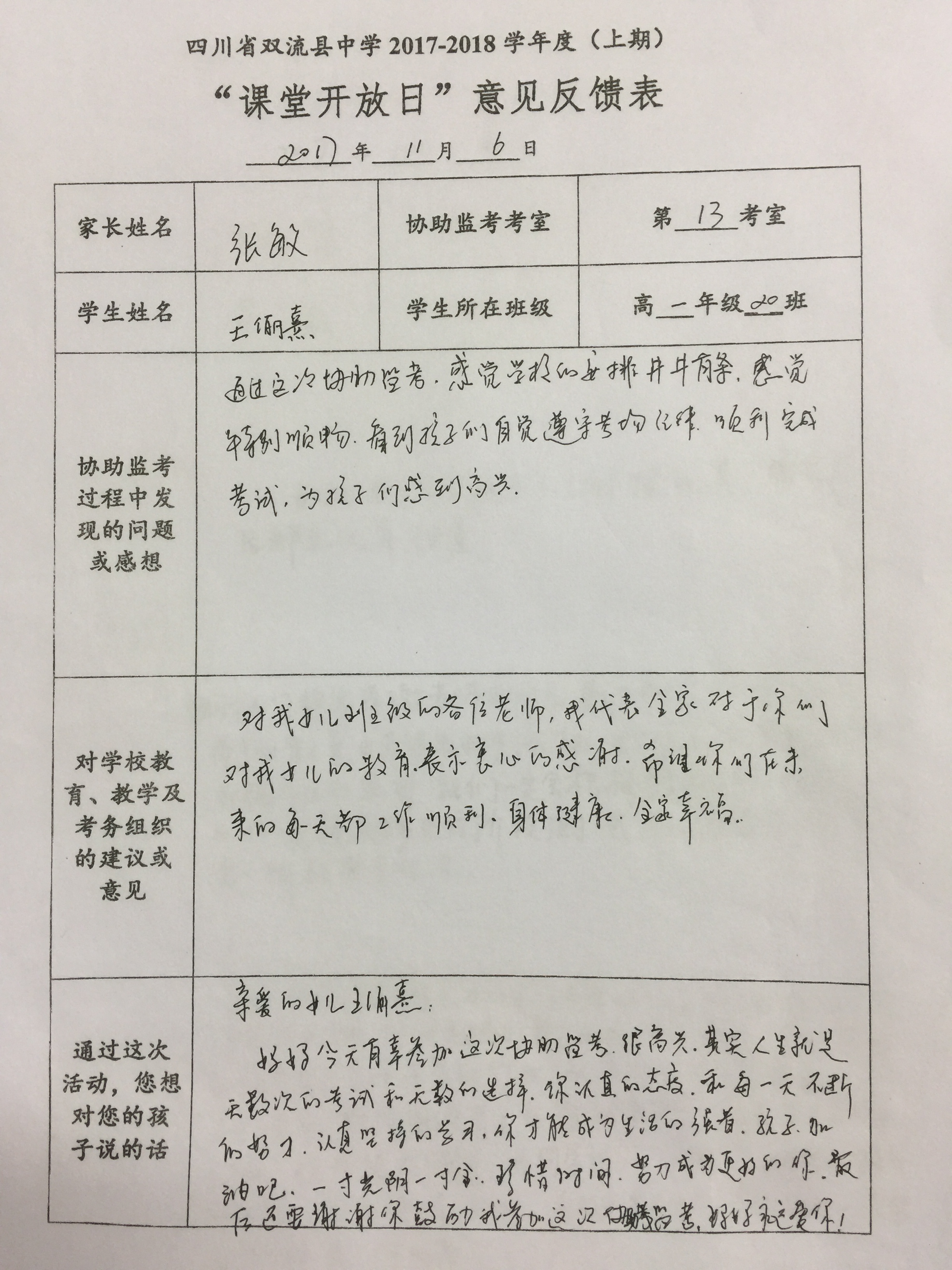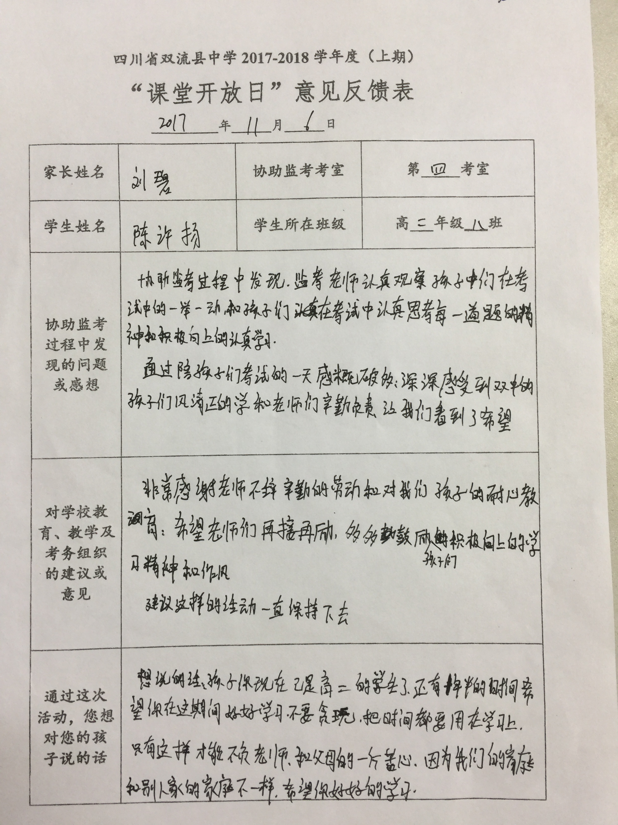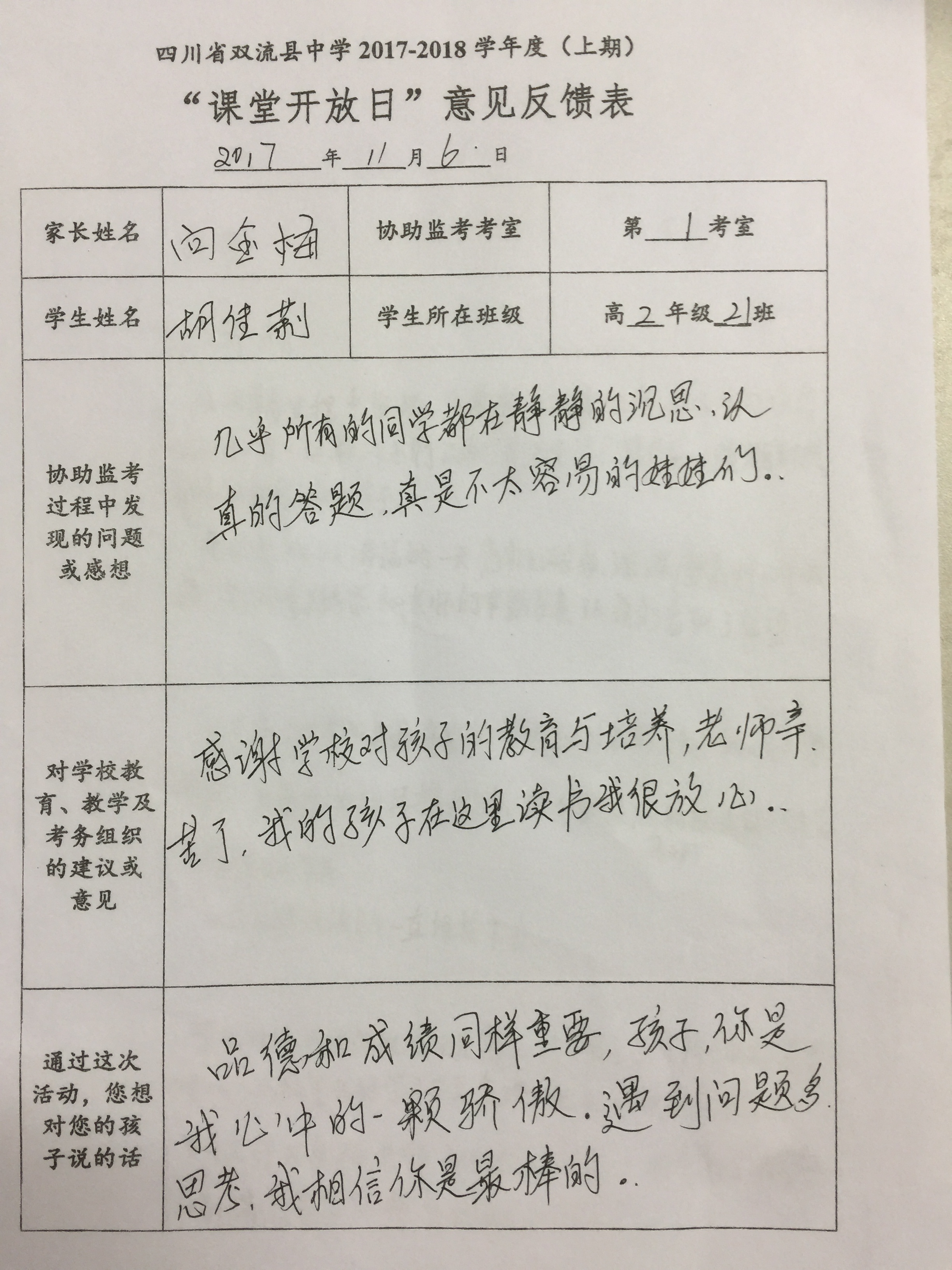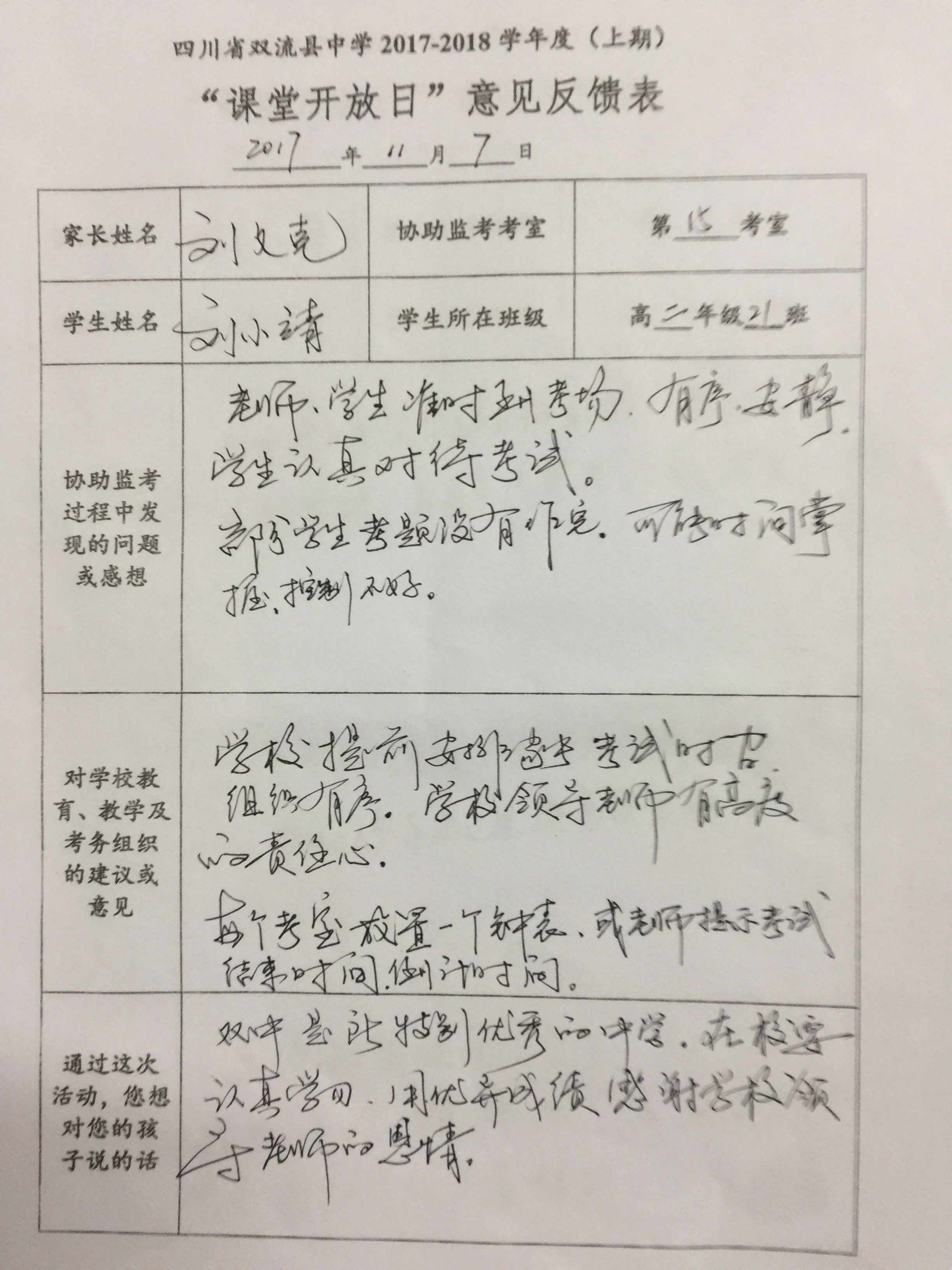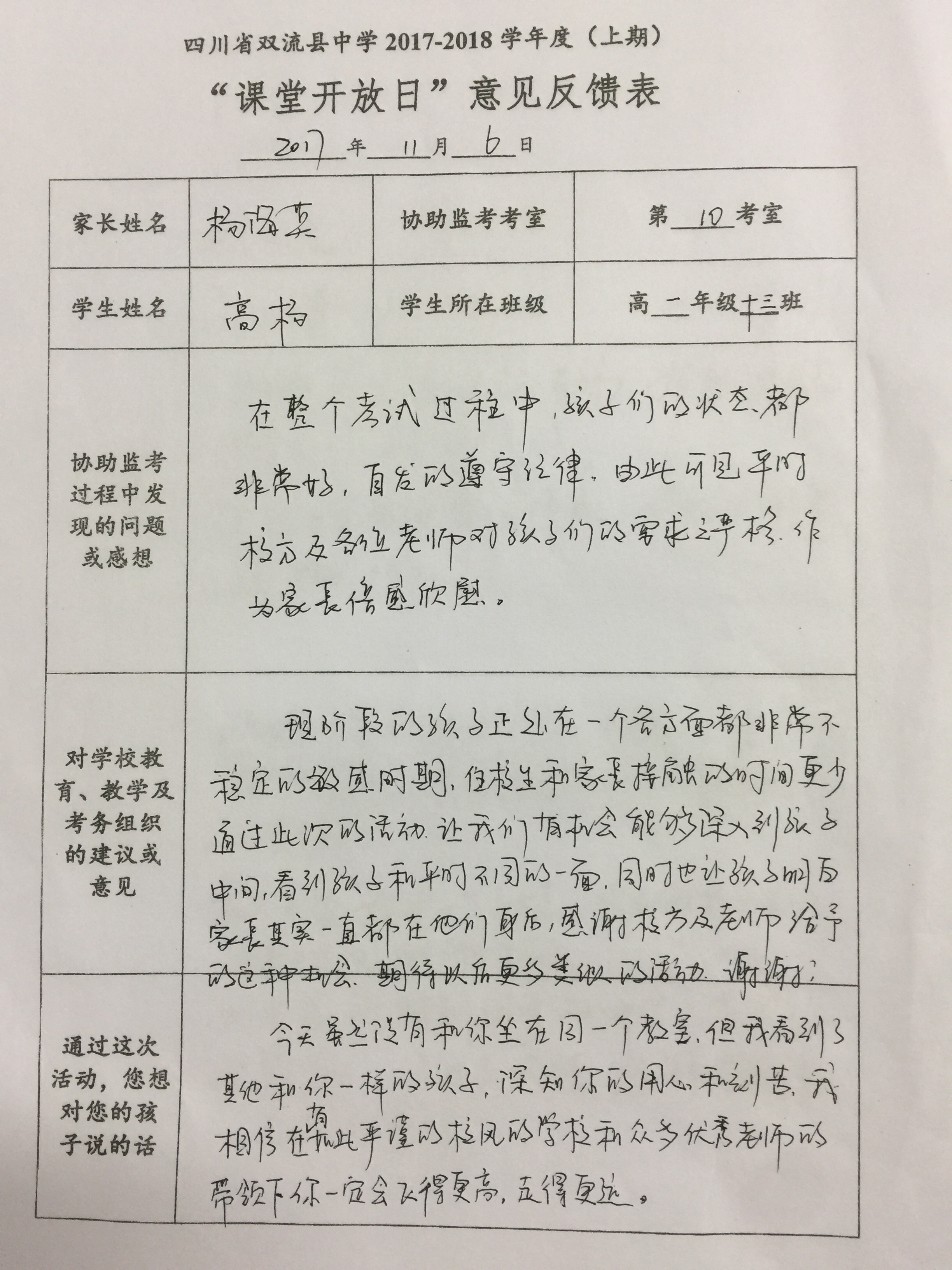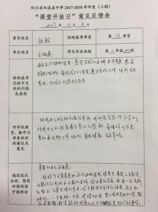 2017年11月6日——8日,四川省雙流中學(xué)高一、高二年級舉行了2017——2018學(xué)年度上學(xué)期期中考試。本次半期考試邀請了部分家長觀摩和協(xié)助監(jiān)考,作為“課堂開放日活動”的一種呈現(xiàn)方式,其目的是增加我校辦學(xué)的透明度,讓家長和社會進(jìn)一步了解學(xué)校的辦學(xué)和教師的教育教學(xué)情況,進(jìn)一步了解學(xué)生的學(xué)習(xí)狀況,拉近孩子和父母之間的“距離”,增進(jìn)家長和孩子們的溝通,共促學(xué)生和學(xué)校的發(fā)展。