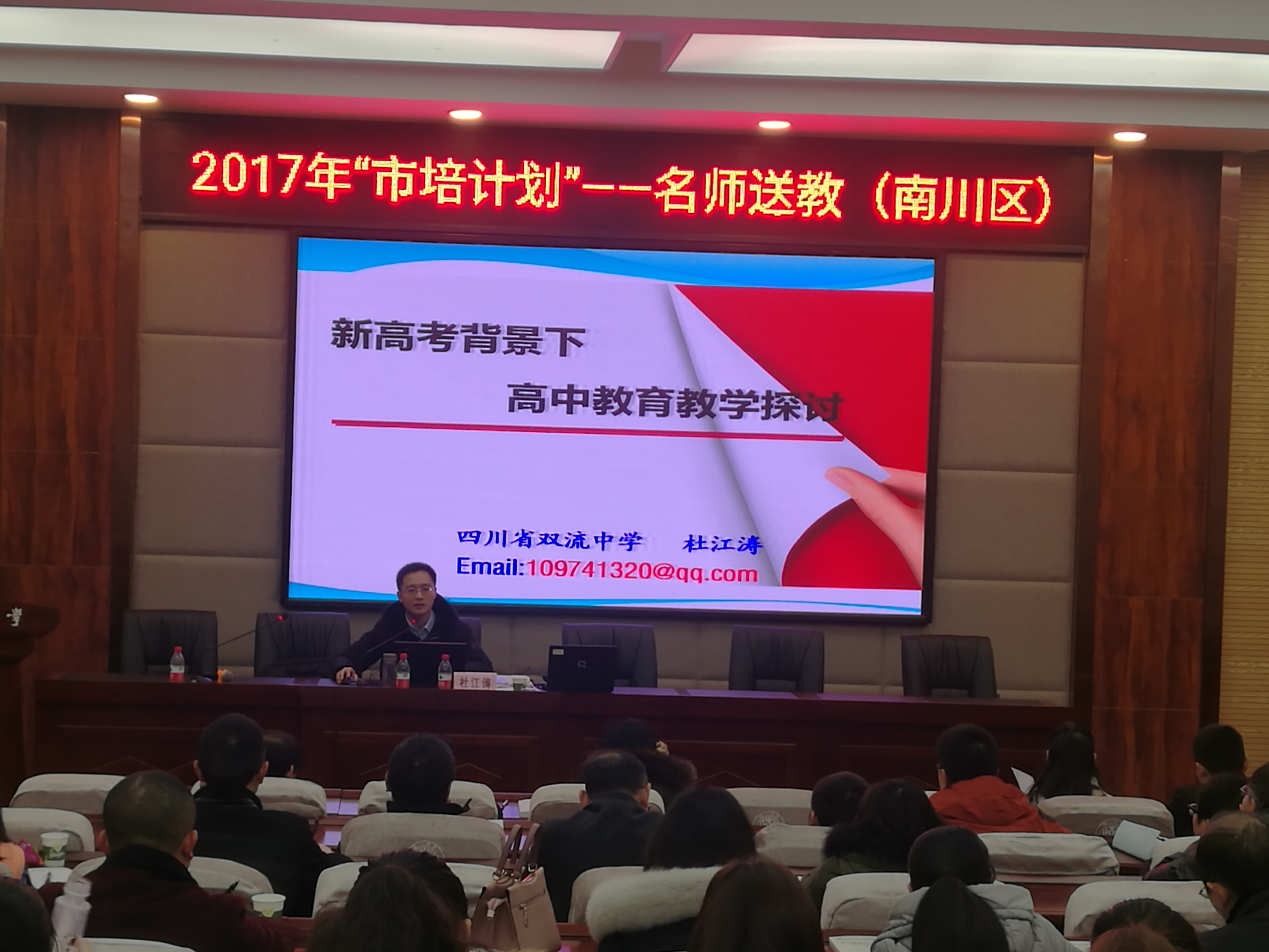 2017年12月16日,雙流中學(xué)數(shù)學(xué)教師杜江濤應(yīng)長江師范學(xué)院邀請,前往重慶市南川區(qū),在重慶市2017年“市培計劃”名師送教南川區(qū)高中數(shù)學(xué)教師培訓(xùn)活動中作了題為《新高考背景下高中教育教學(xué)探討》的講座,杜老師從新高考方案解讀(以上海為例),新高考下高中教育面臨的變革,新高考背景下抓好高三工作的兩點建議等三個方面探討了新高考背景下的高中教育教學(xué)。