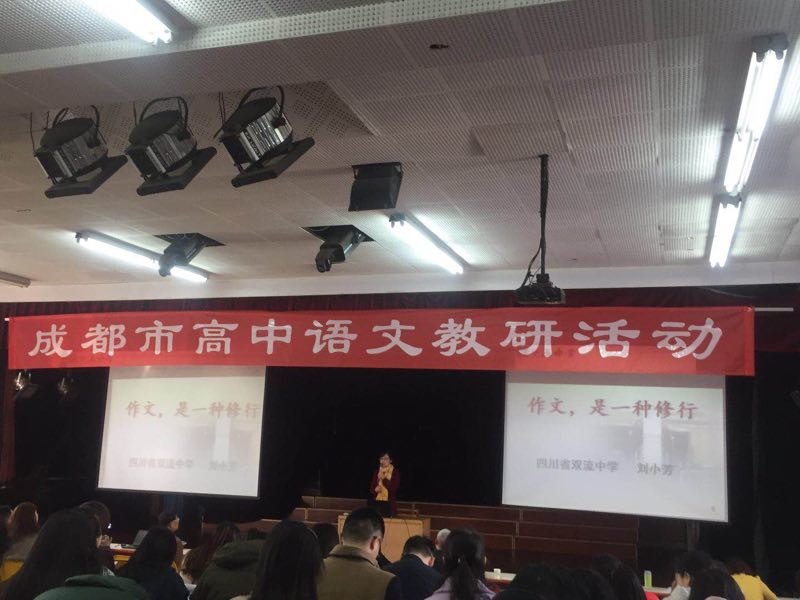 2018年3月8日,四川省著名作家雙流中學(xué)劉小芳老師應(yīng)邀參加成都市語文教研活動,給與會老師分享作文教學(xué)經(jīng)驗(yàn)。劉小芳老師將自己從教多年來的作文教學(xué)經(jīng)驗(yàn)與自己日常寫作的切身體悟相結(jié)合,給與會老師做了一次精彩的分享,從“修煉一顆覺心”、“修煉一點(diǎn)技法”、“修煉一種腔調(diào)”、“用教材修煉一種習(xí)慣”、“用意象修煉一種寫法”五個(gè)方面給大家分享了她的做法,條條干貨,得到教學(xué)一線老師的熱烈歡迎。