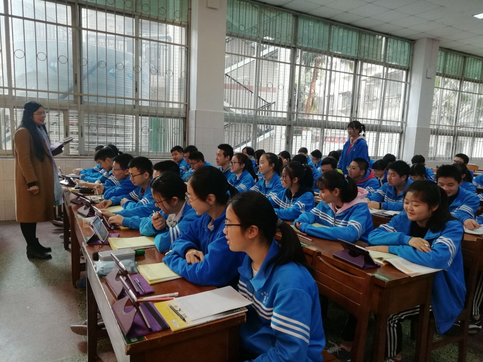 課間,大家還在意猶未盡地討論王老師的作文課時(shí),劉小芳老師已經(jīng)在講臺(tái)上調(diào)試設(shè)備,準(zhǔn)備授課了,學(xué)生們也有序地進(jìn)入教室就坐。劉老師上了一堂以錘煉文句為主的作文課,給大家介紹了“語言升格微創(chuàng)法”。劉老師邊講邊練,講解與練筆同步進(jìn)行,介紹了三種升格語言的方法,即“用詞要有現(xiàn)場感,讓讀者身臨其境”、“表達(dá)要有流動(dòng)性”和“要在文章中有我的體驗(yàn)和發(fā)現(xiàn)”。在鈴聲響起的前幾分鐘,還有很多學(xué)生的現(xiàn)場書寫的佳作來不及和大家分享,劉老師便讓同桌互相交換作品進(jìn)行朗讀,將課堂氣氛推向高潮,下課鈴響后還有不少同學(xué)低聲朗讀。