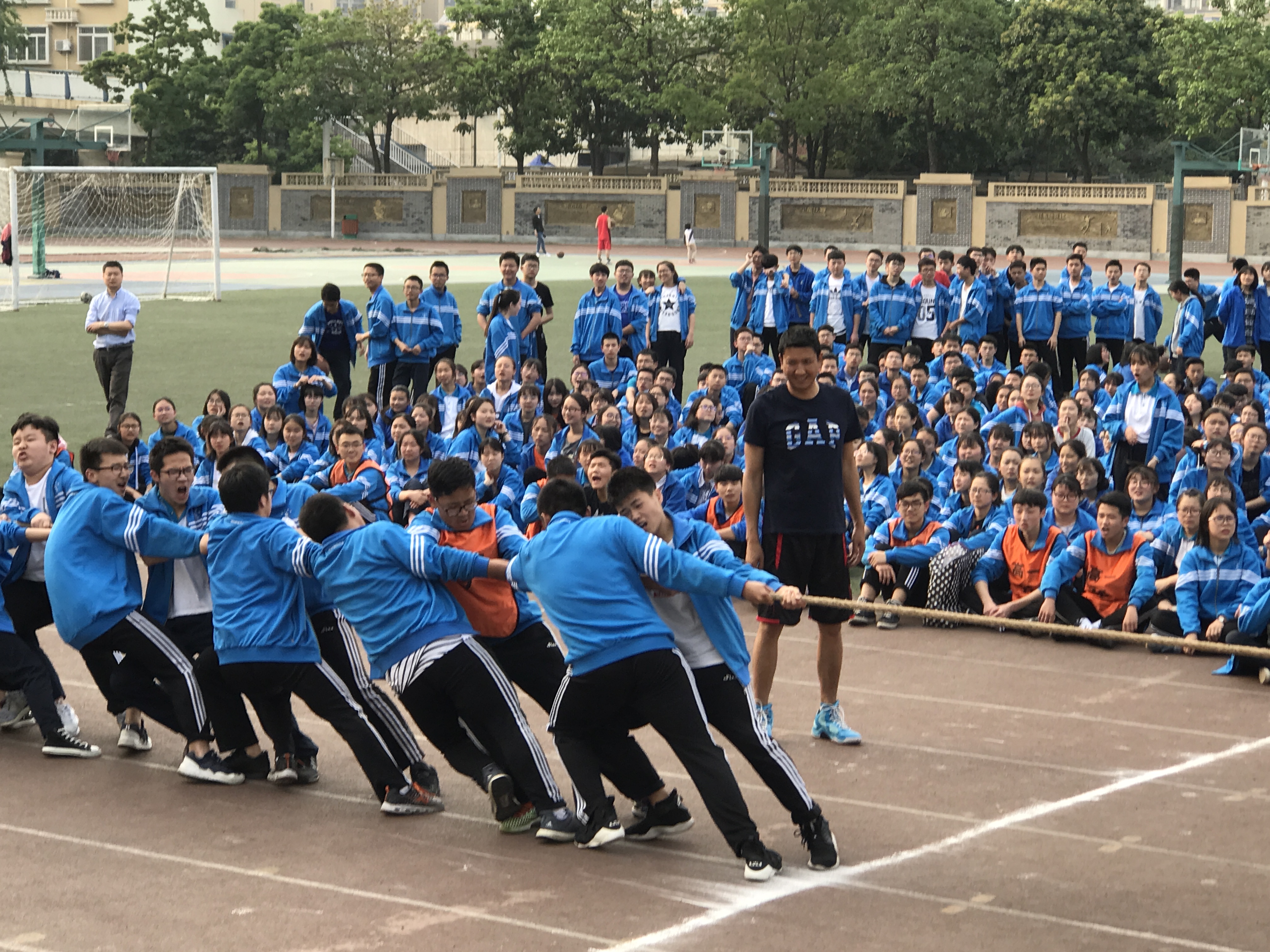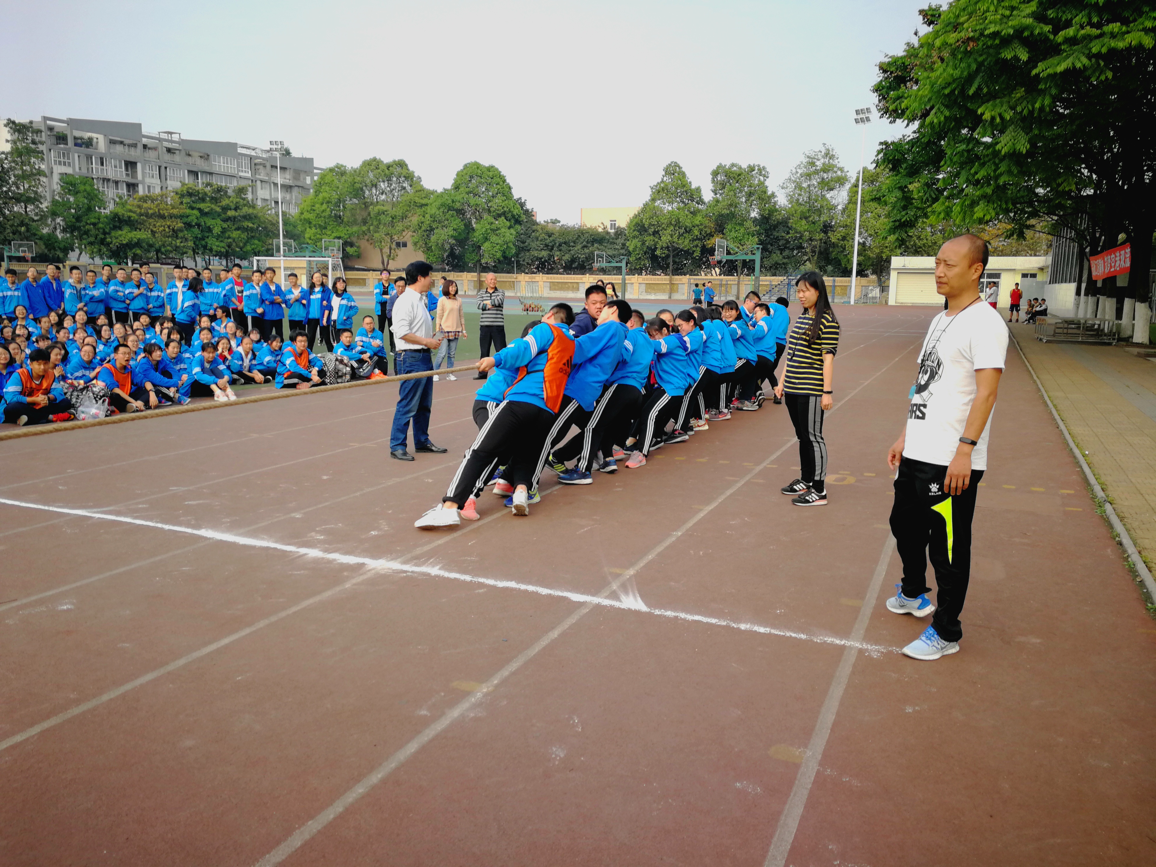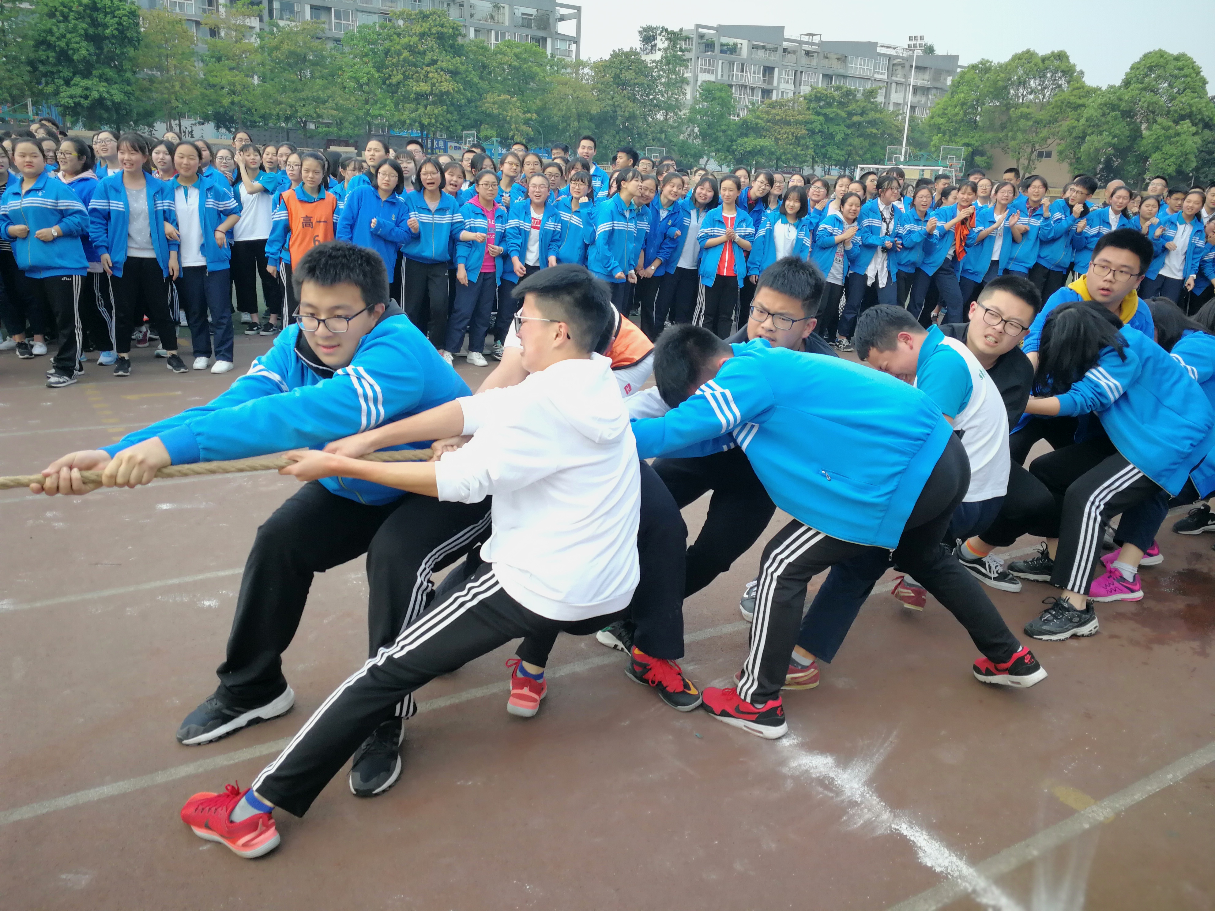 為了豐富學(xué)生的課余生活,培養(yǎng)同學(xué)們的團(tuán)隊(duì)精神和集體榮譽(yù)感,響應(yīng)“每天運(yùn)動(dòng)一小時(shí)”的陽(yáng)光體育活動(dòng)號(hào)召,雙流中學(xué)按照相關(guān)規(guī)定舉行了高一年級(jí)組拔河比賽。