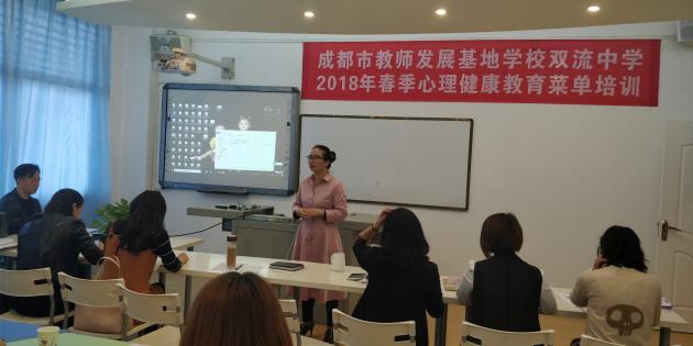 2018年5月11日早上8點30分,2018年春季高中心理健康教育菜單培訓第三次培訓在成都市教師發(fā)展基地學校雙流中學心理輔導中心生涯規(guī)劃室隆重舉行。來自雙流區(qū)各學校的全體心理健康教育教師全程參與。