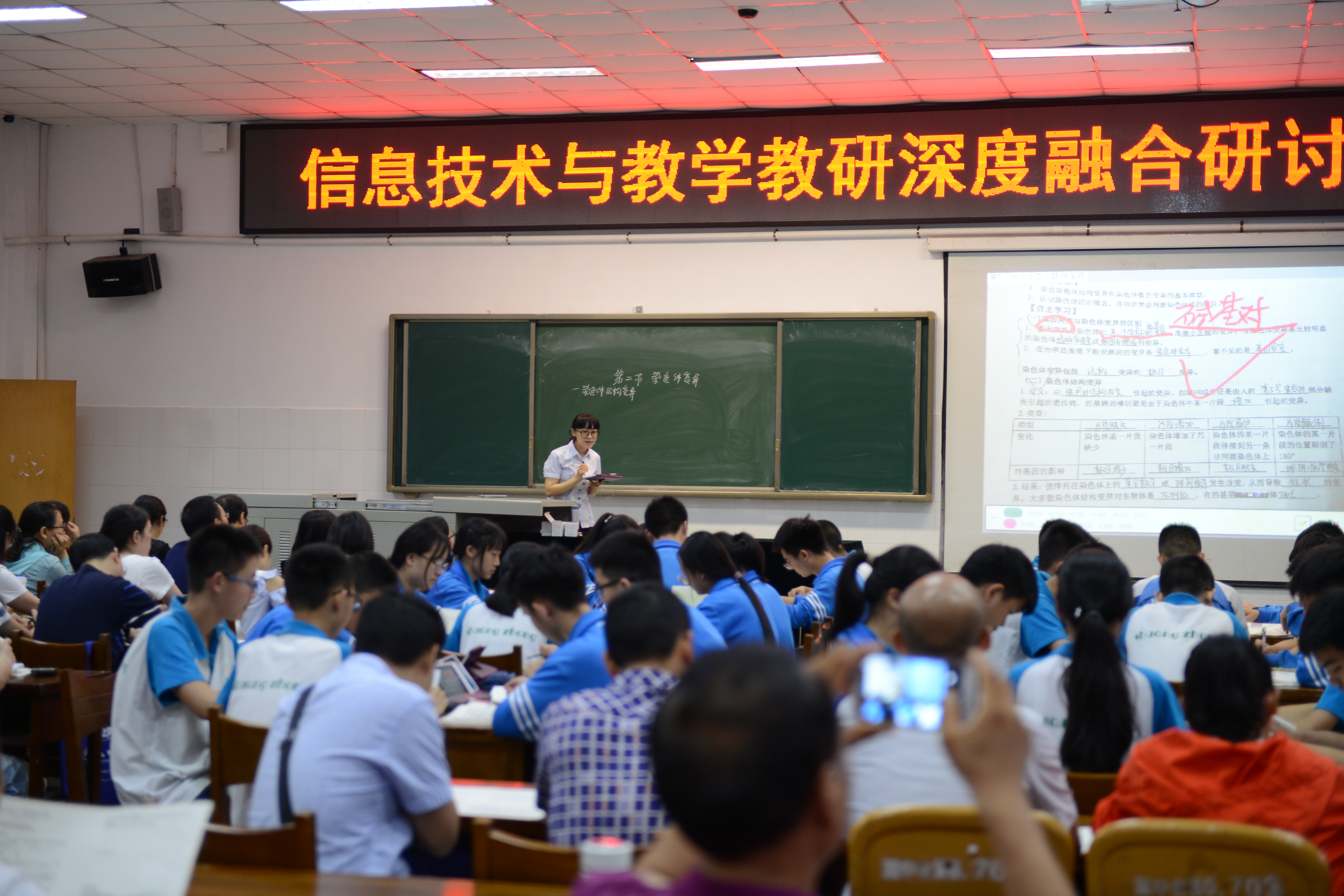 緊接著,劉小芳和雷治練老師分別在多功能一廳和二廳向參會教師展示了一節(jié)云平臺“智慧課堂”。劉小芳老師結(jié)合多年來的詩歌創(chuàng)作經(jīng)驗帶領(lǐng)同學們“讓詞語喚醒我們的生活”,在劉老師的點撥下,同學們才思泉涌、逸興遄飛,一首首鮮活靈動的小詩讓研討會一次又一次推向高潮。雷治練老師圍繞“染色體變異”這知識,首先在課前布置了預(yù)習作業(yè),然后在課中精講精練、各個突破,既提高了教學效率,又增強了教學效果。